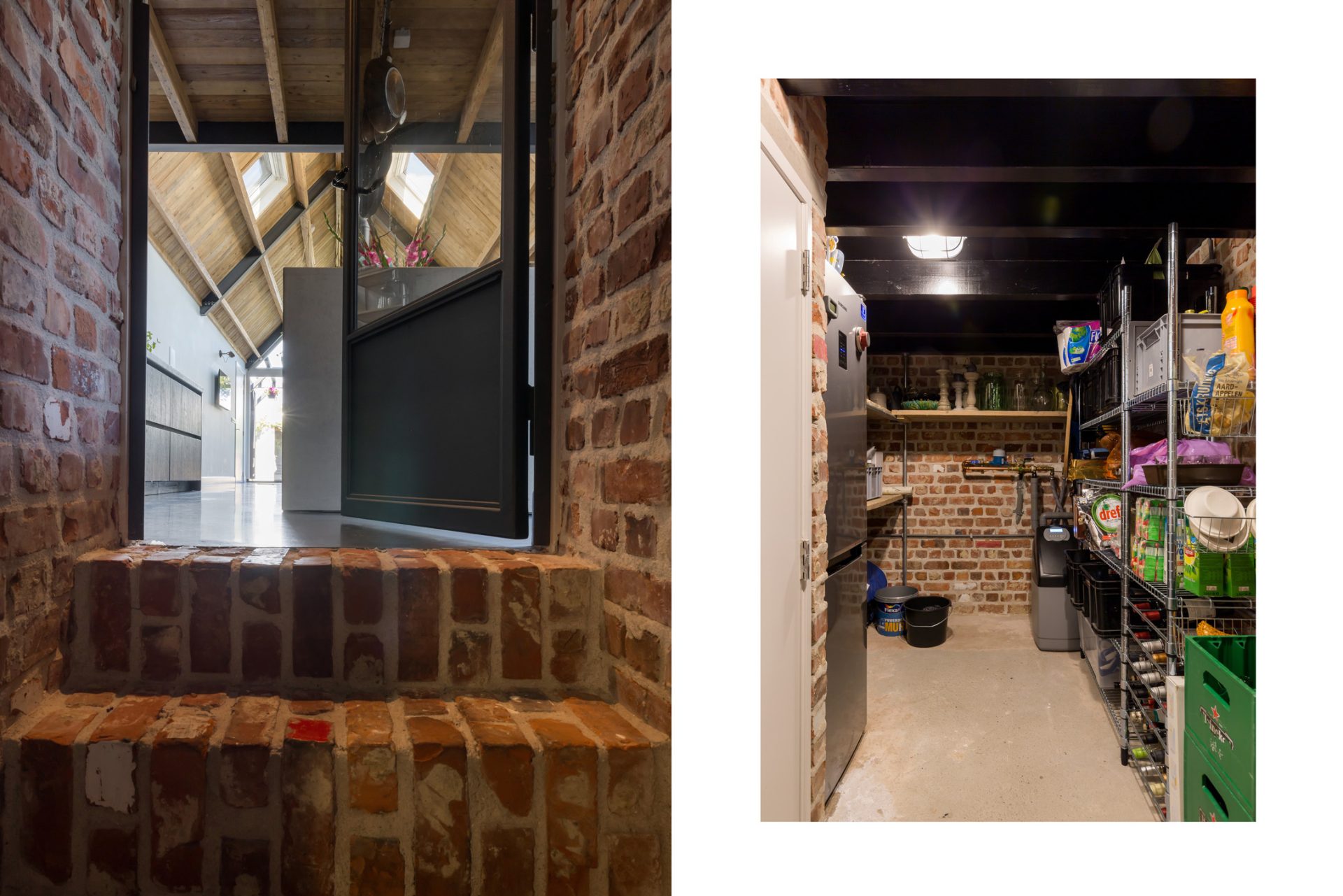 Achter de stalen deur met smokey-glas is een trap naar de wijn-/provisiekelder, die een plafondhoogte van circa 2 meter heeft. De trap en wanden zijn gemetseld met oude boerderijstenen, die de kelder tot een prachtige ruimte maken.