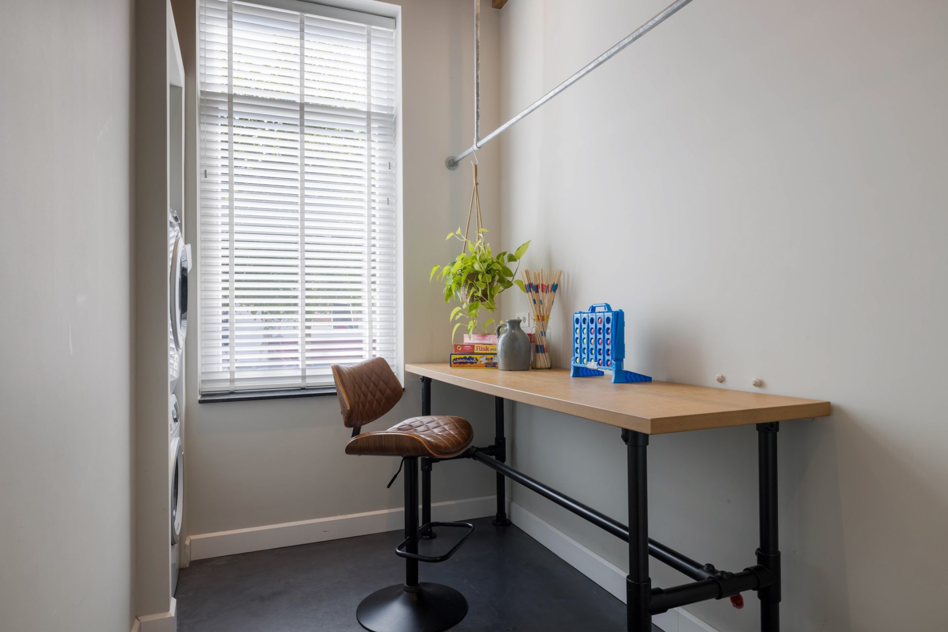 Vanaf het moment dat je voordeur opengaat en je de hal ziet, ben je op slag verliefd. Rechts in de hal met hoge vide zie je de stalen trap naar de bovenverdieping. Staal, metselwerk met karakter en stucwerk vormen een prachtige compositie in de hal met vaste garderobekast. Aan de voorzijde is de waskamer/berging met vaste kasten en de aansluitingen voor de wasapparatuur.