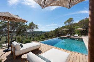 Buiten vormt het royale privézwembad van 70 m² het hart van het buitenleven. De ruime terrassen nodigen uit tot ontspanning, dineren en het optimaal genieten van het mediterrane klimaat en het indrukwekkende uitzicht over de vallei.