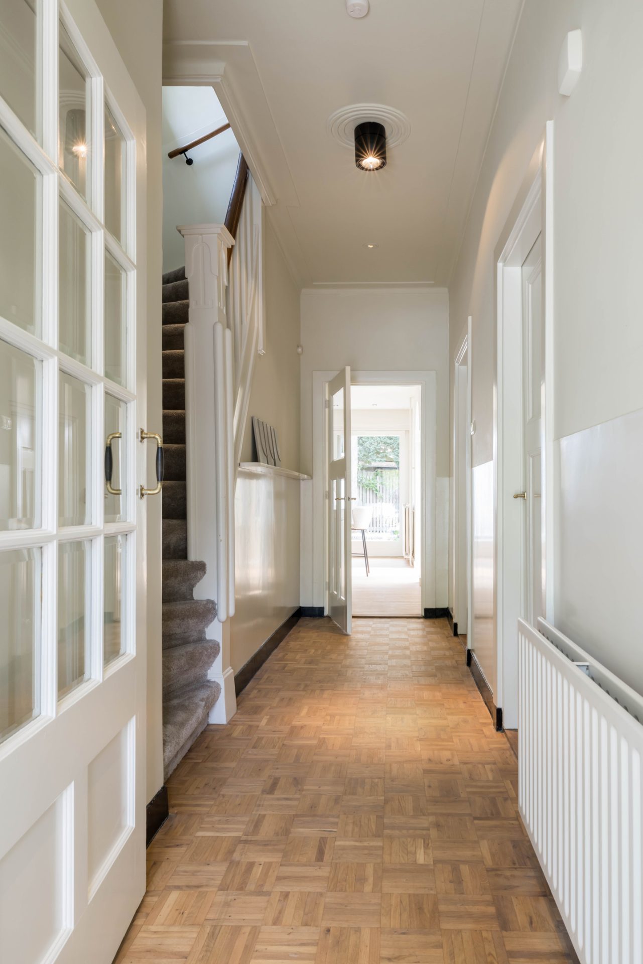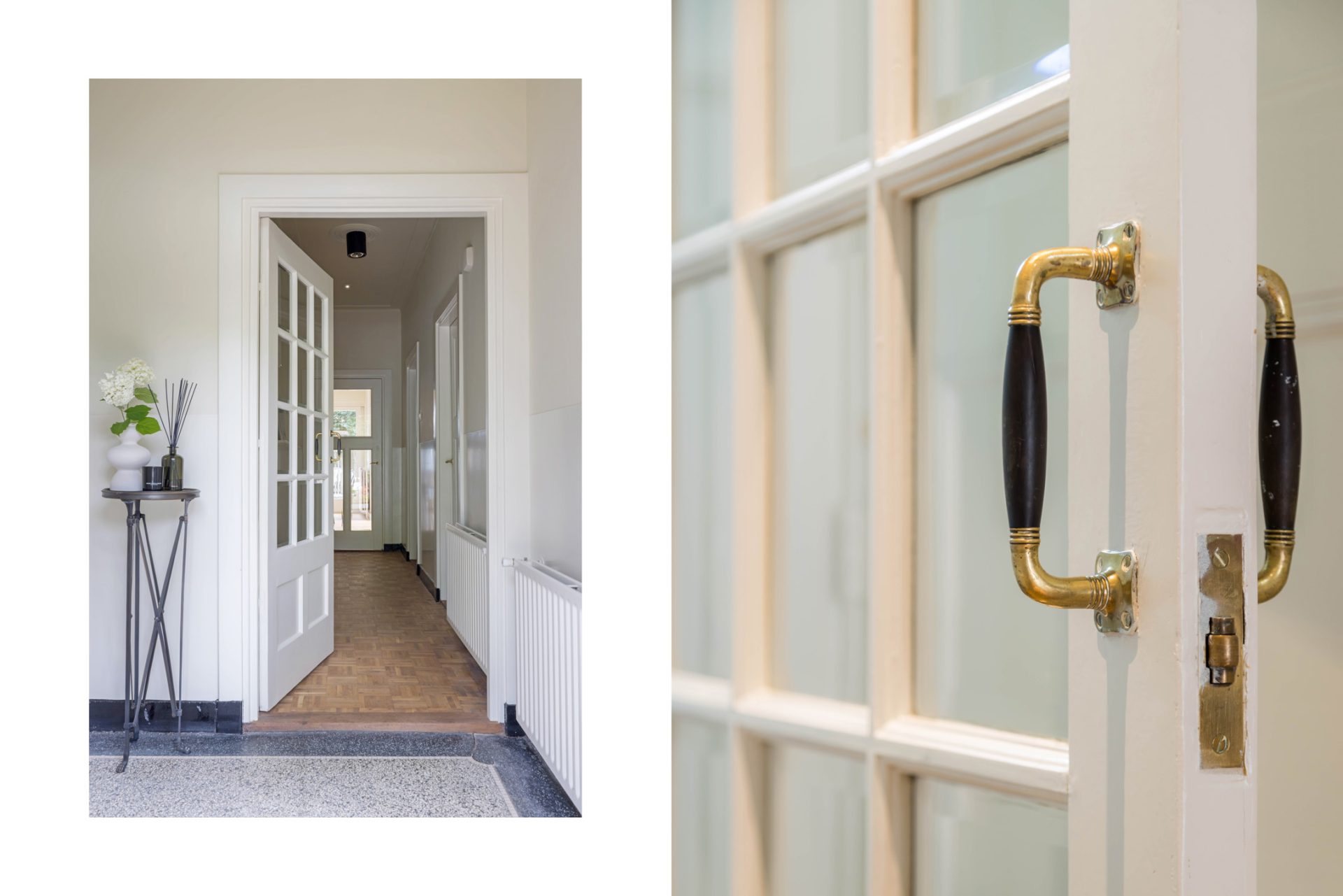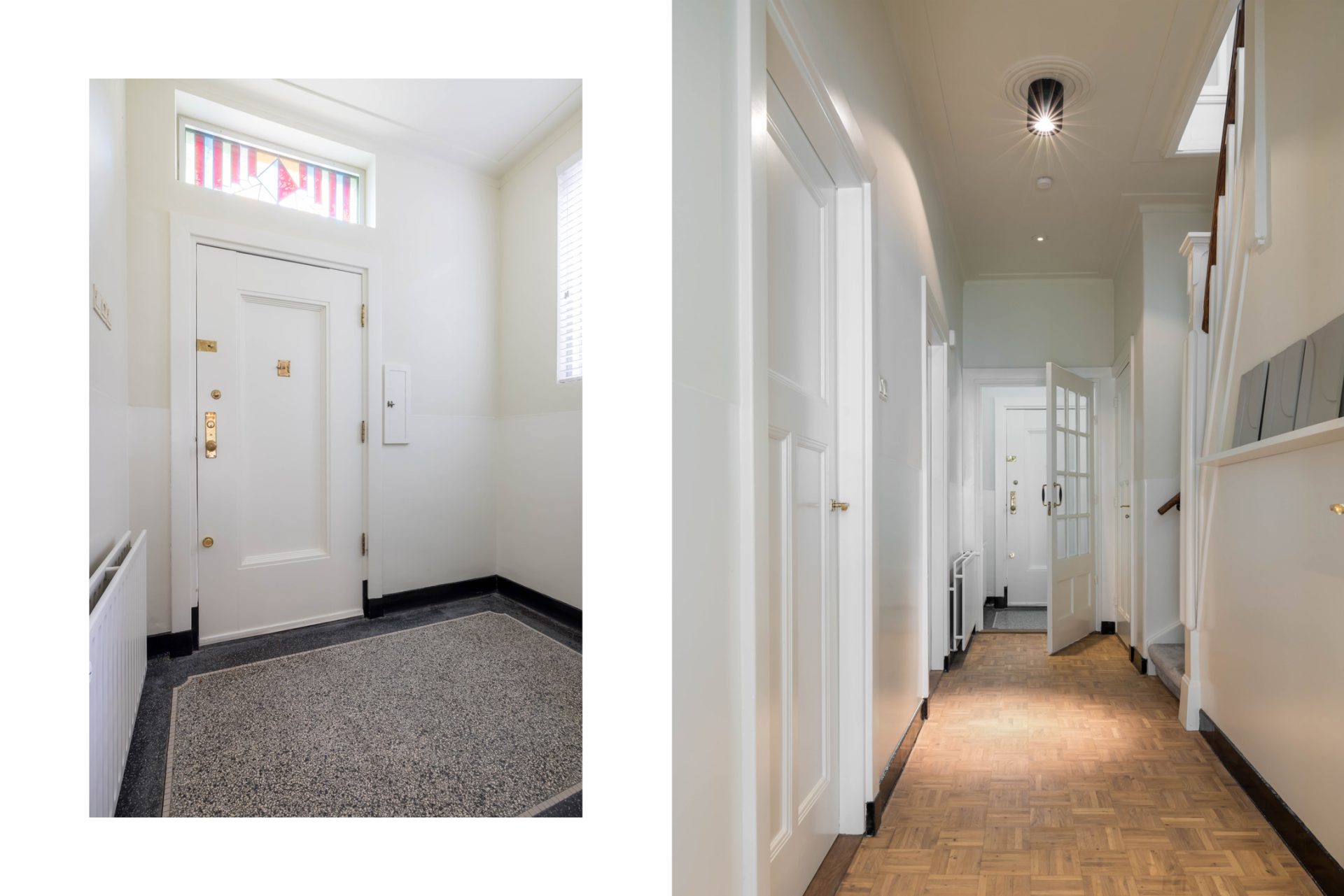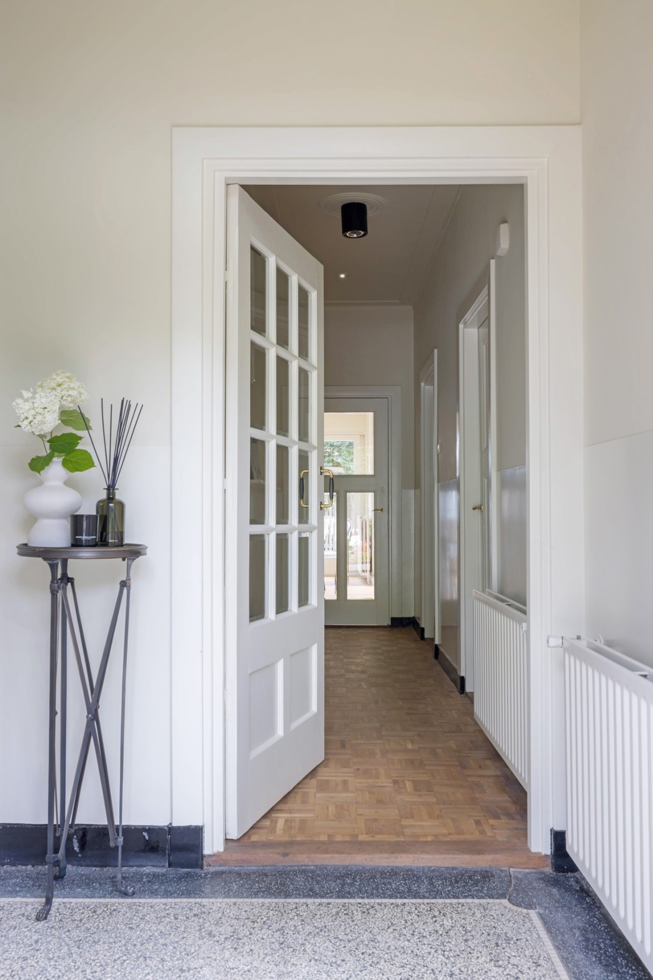 De entree is, net als de rest van het huis, het toonbeeld van karakter. Vanuit de vestibule loop je de hal in met de trapopgang en toiletruimte. Hoge plafonds, de parketvloer in blokmotief en de verfijnde details bij de trap trekken direct de aandacht.