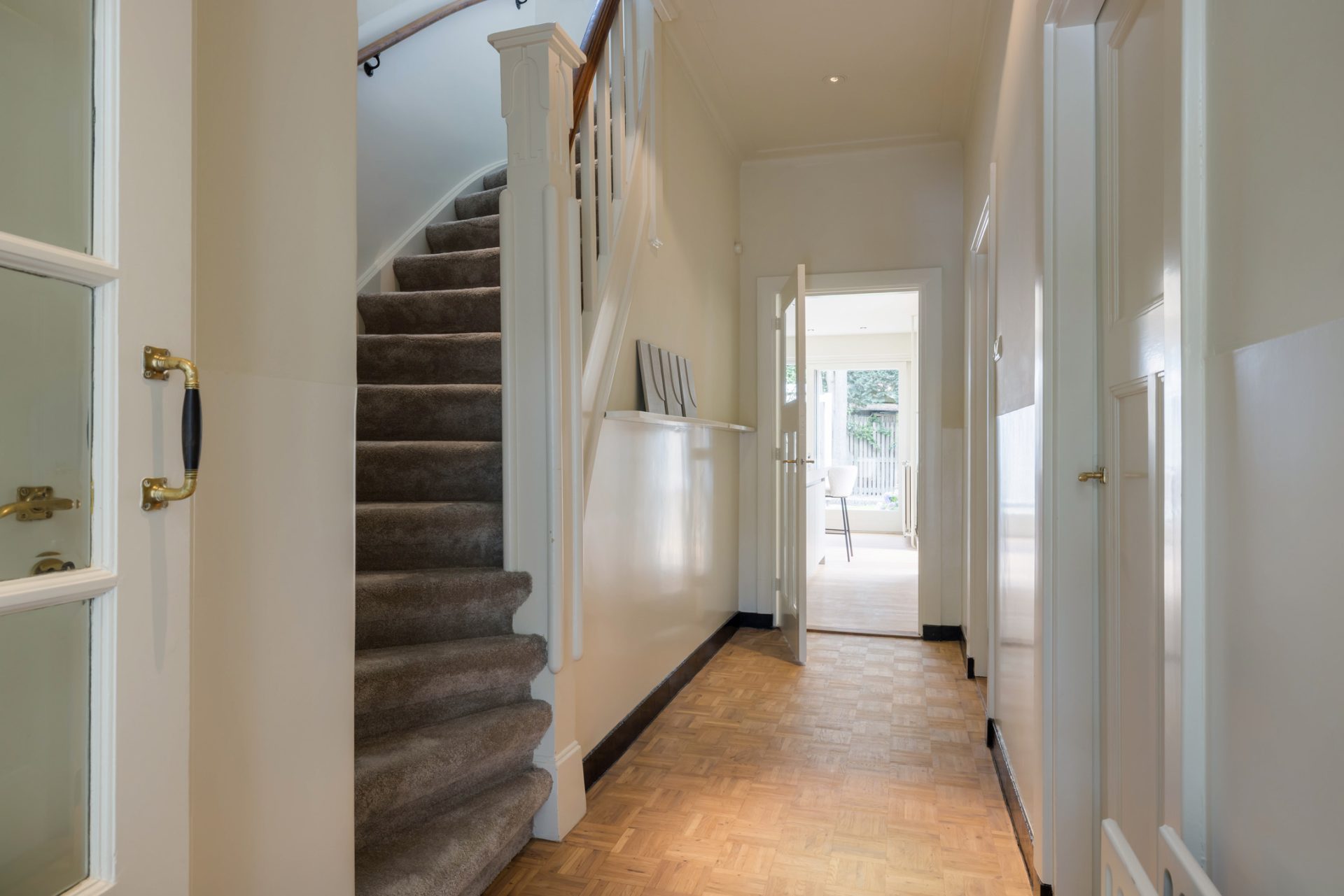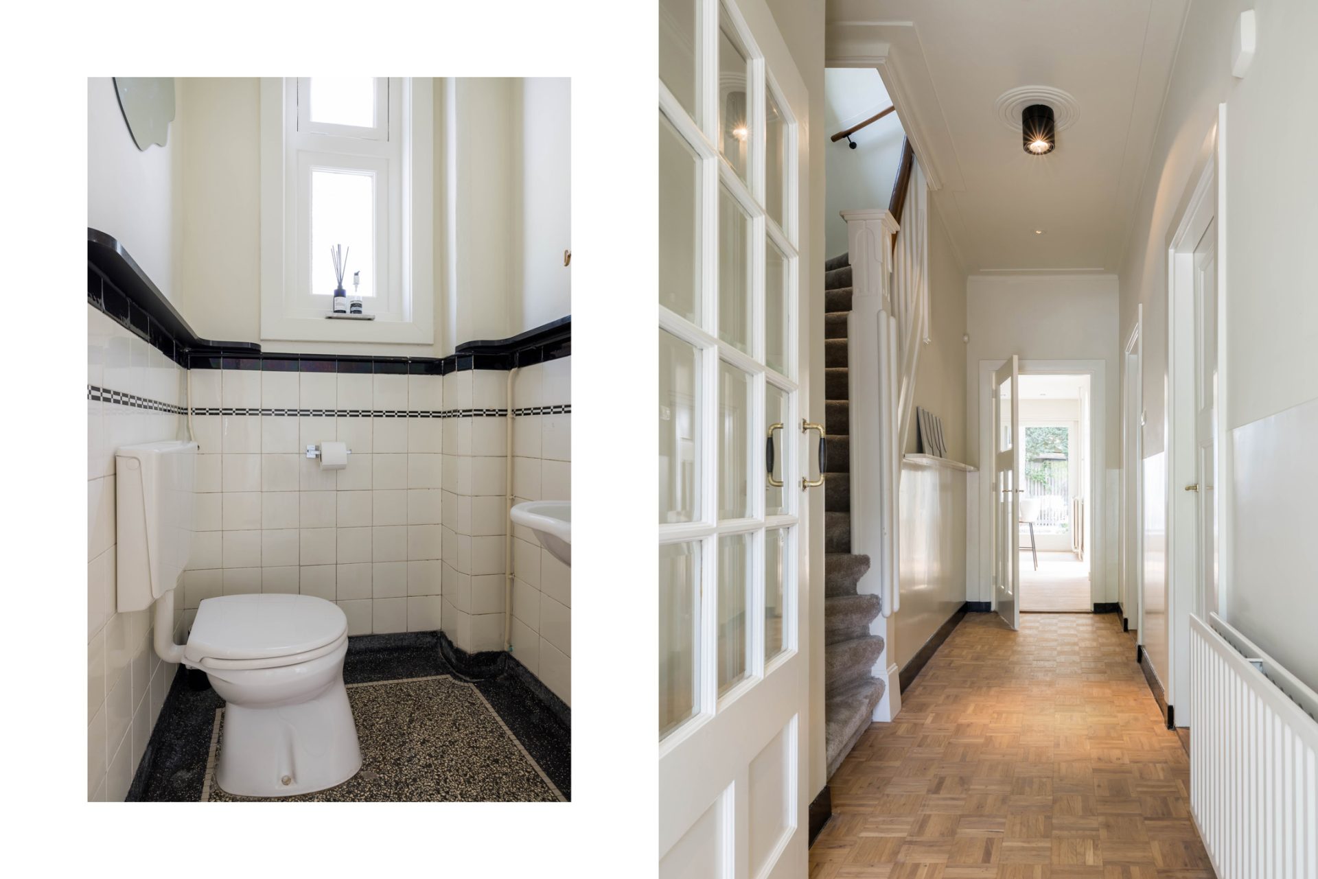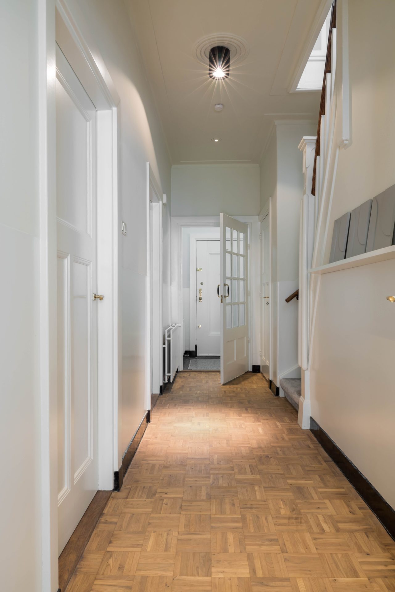 De entree is, net als de rest van het huis, het toonbeeld van karakter. Vanuit de vestibule loop je de hal in met de trapopgang en toiletruimte. Hoge plafonds, de parketvloer in blokmotief en de verfijnde details bij de trap trekken direct de aandacht.