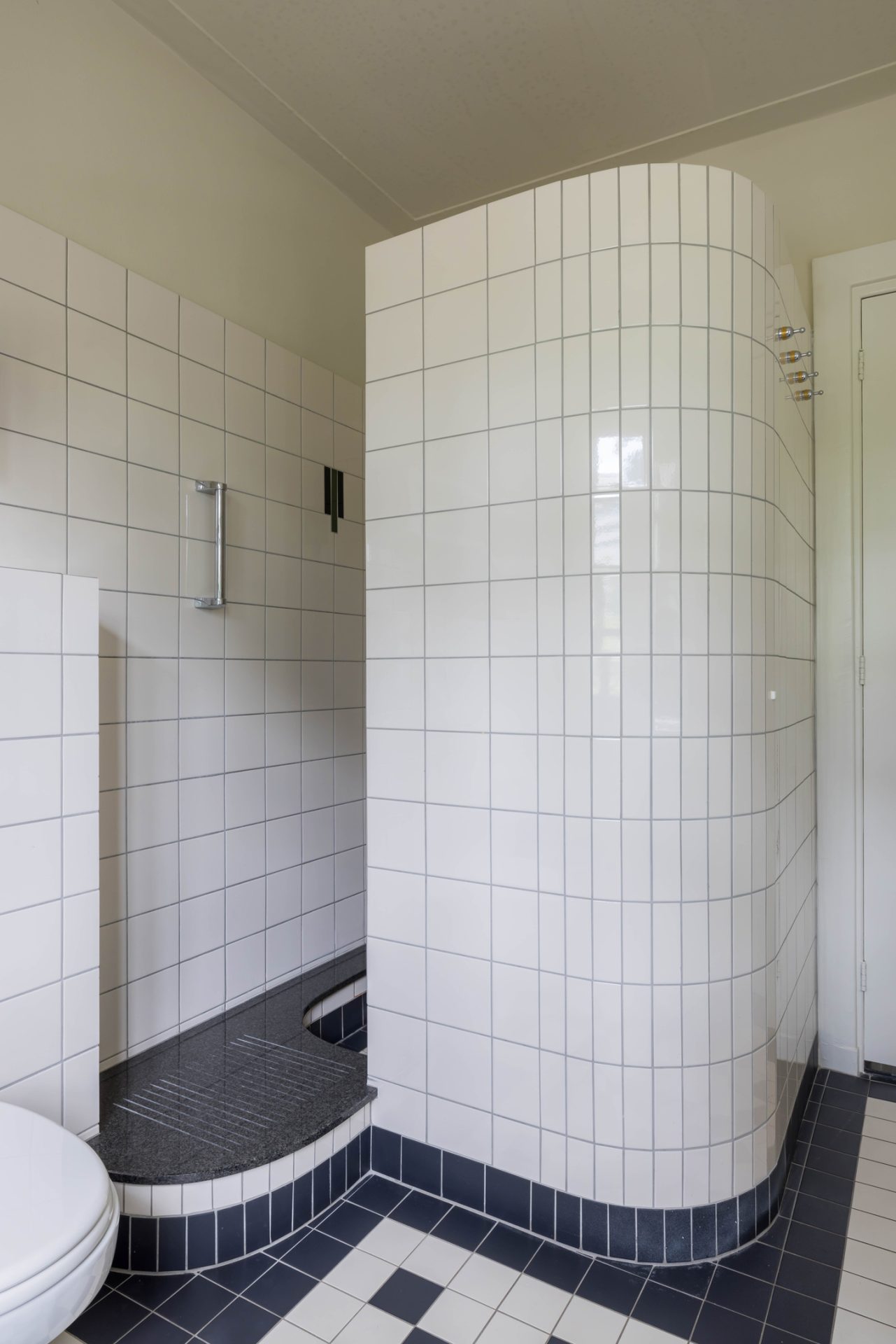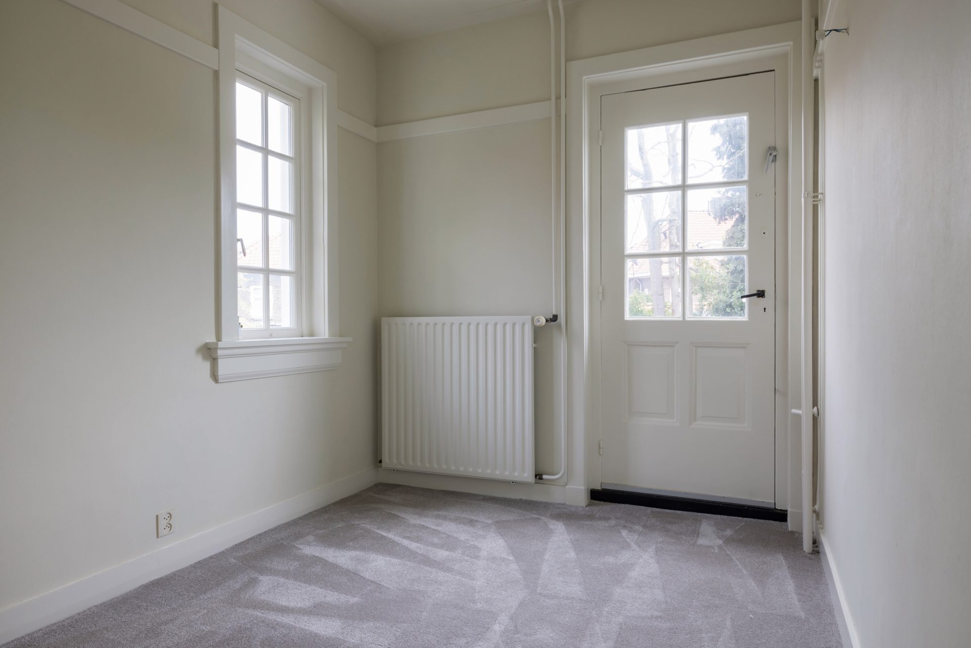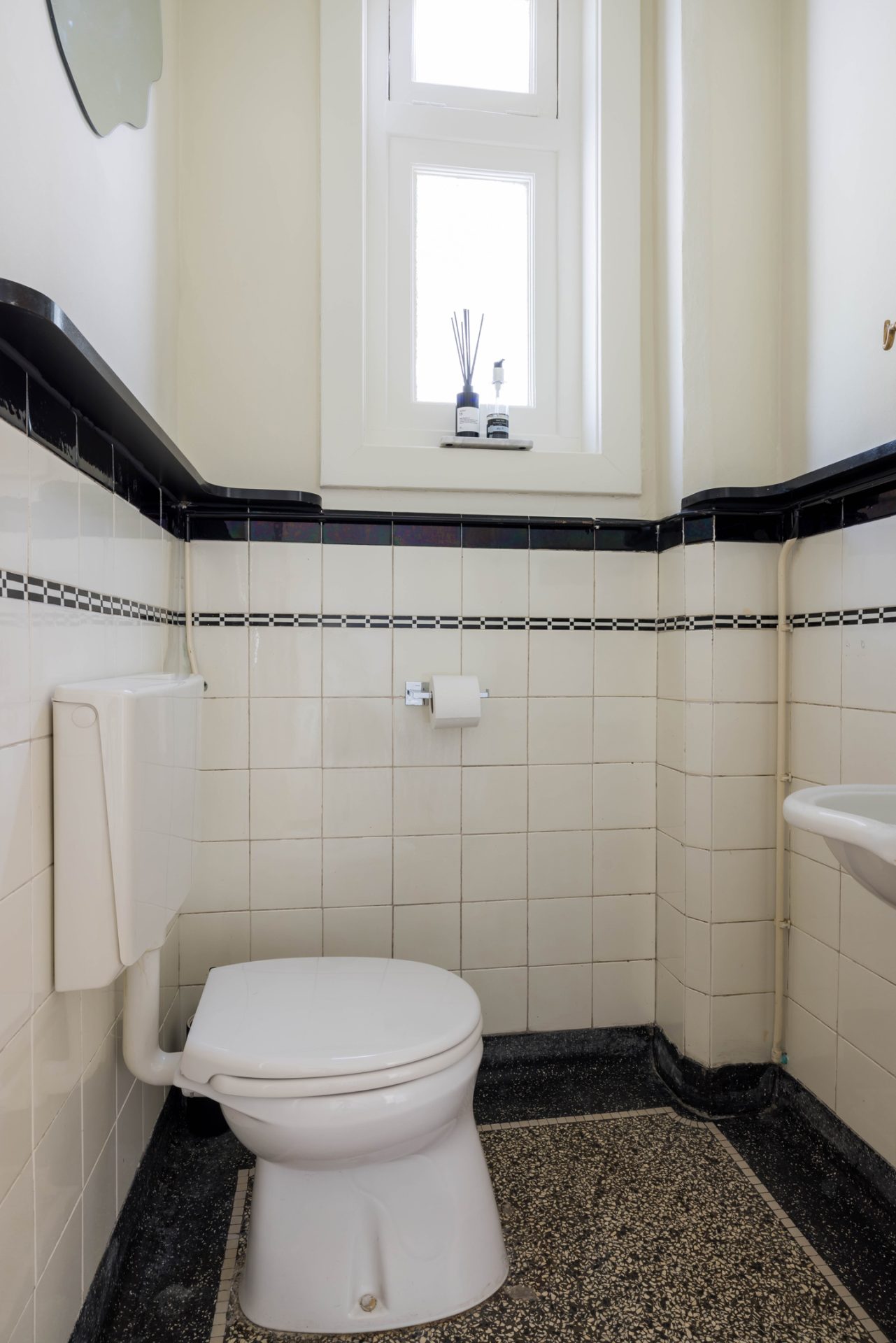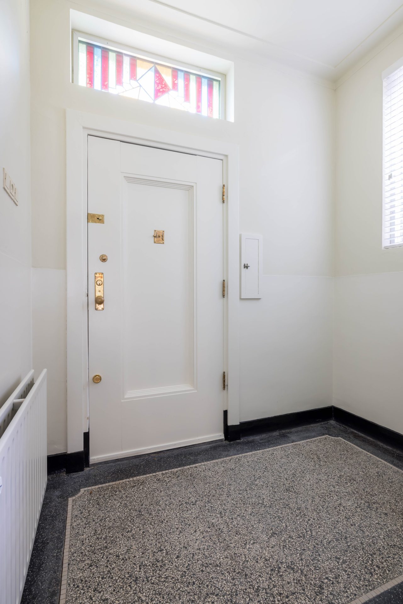De entree is, net als de rest van het huis, het toonbeeld van karakter. Vanuit de vestibule loop je de hal in met de trapopgang en toiletruimte. Hoge plafonds, de parketvloer in blokmotief en de verfijnde details bij de trap trekken direct de aandacht.