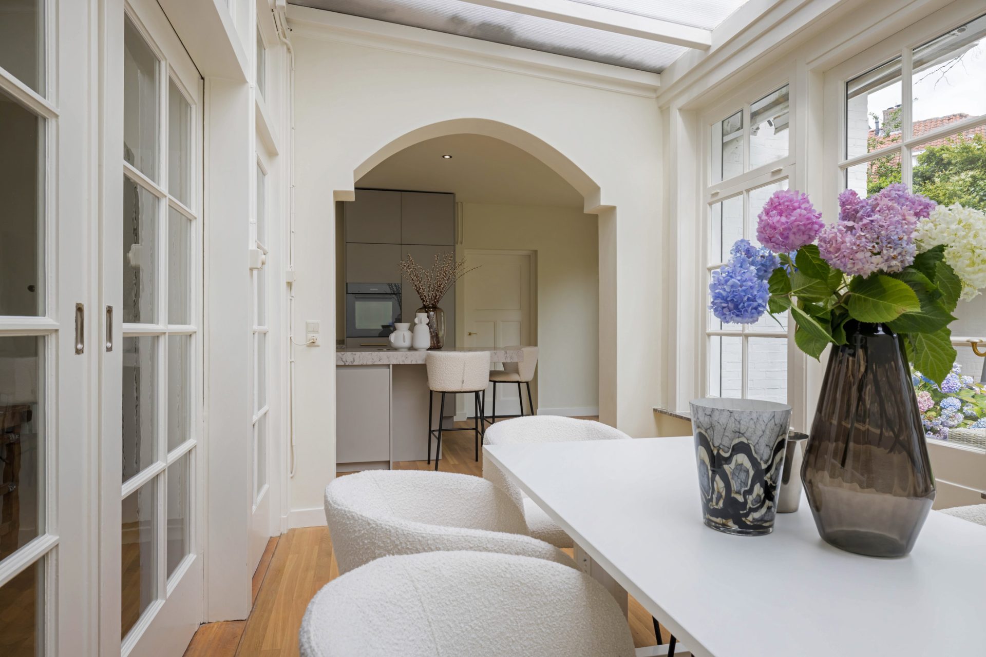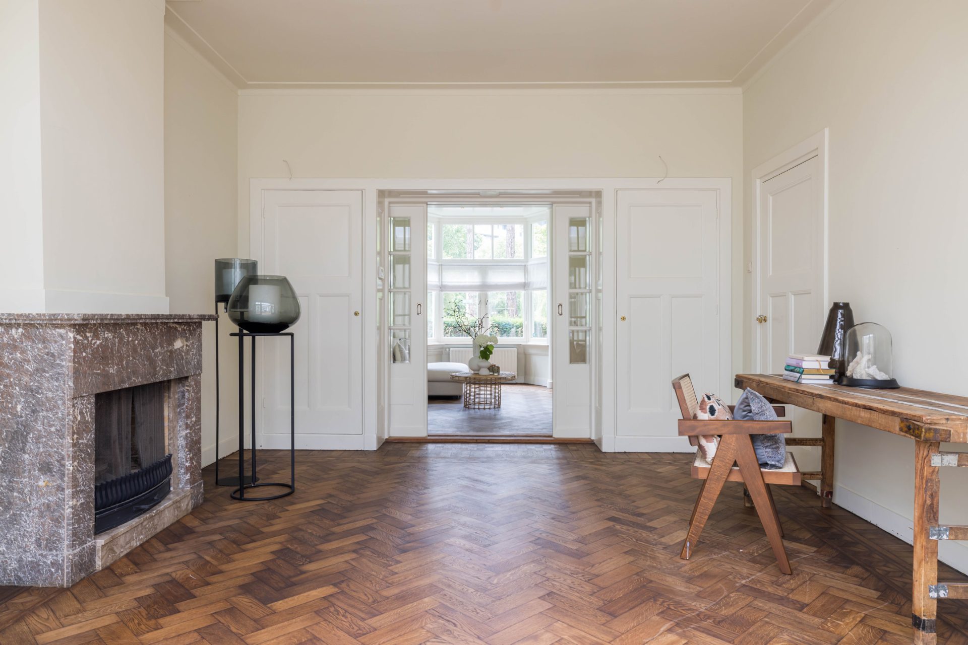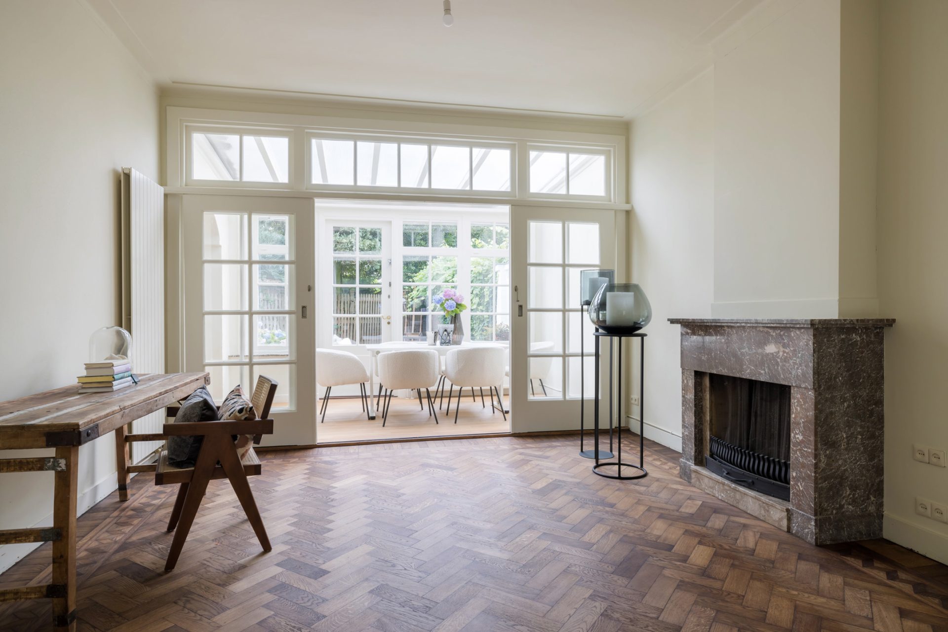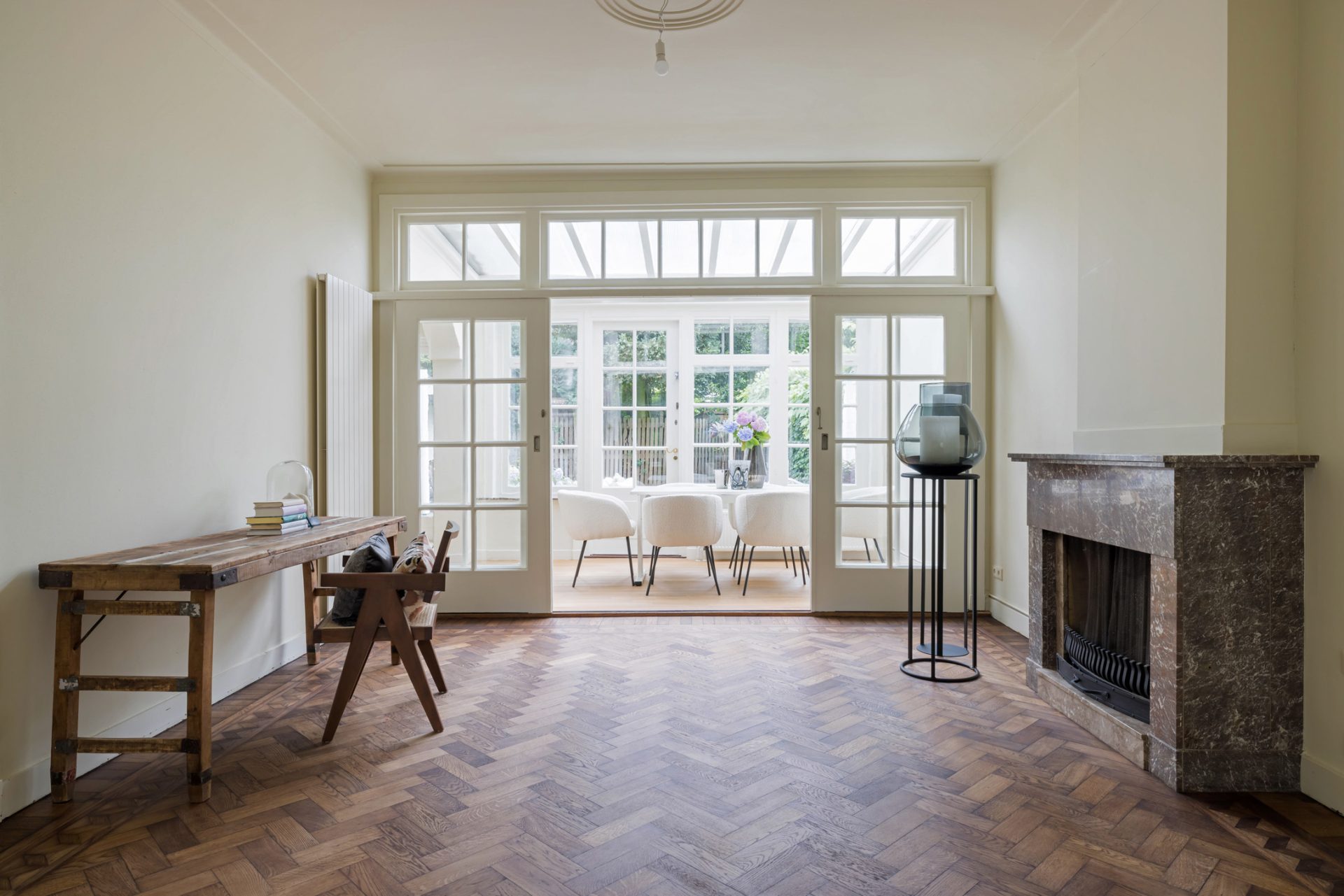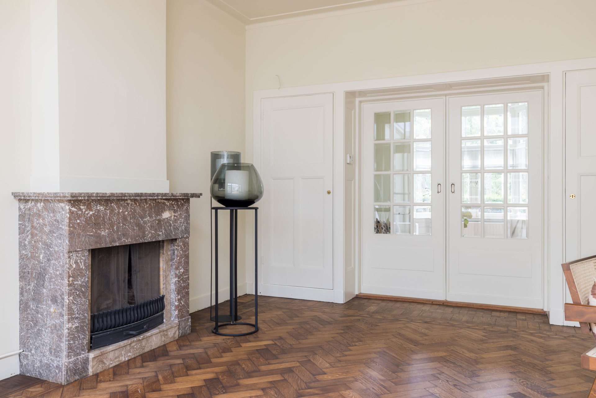 Verrassend is de woonkamer met en-suite verdeling, die aan de achterzijde is uitgebouwd met een tuinkamer. De prachtige parketvloer, marmeren schouw met open haard, inbouwkasten met paneeldeuren en plafondlijsten zorgen voor een aangename sfeer.