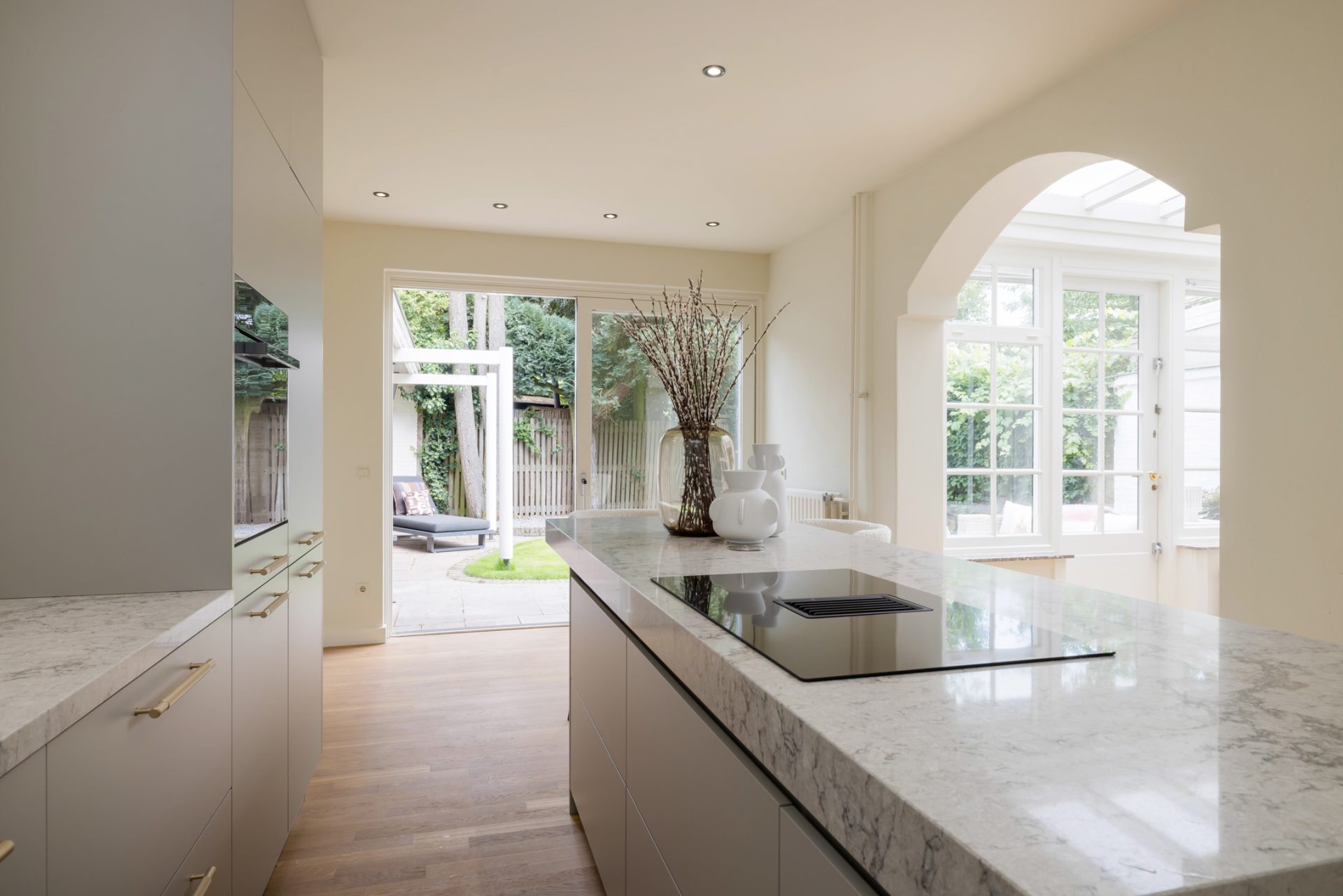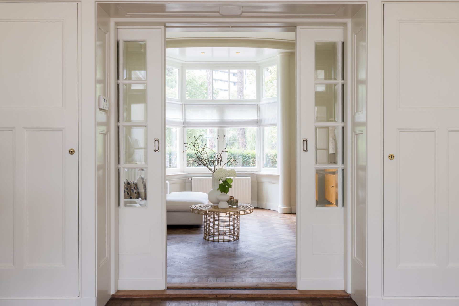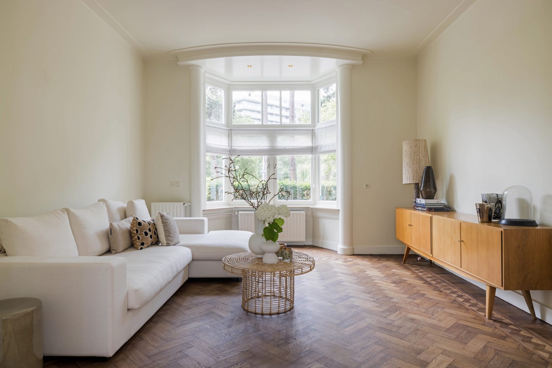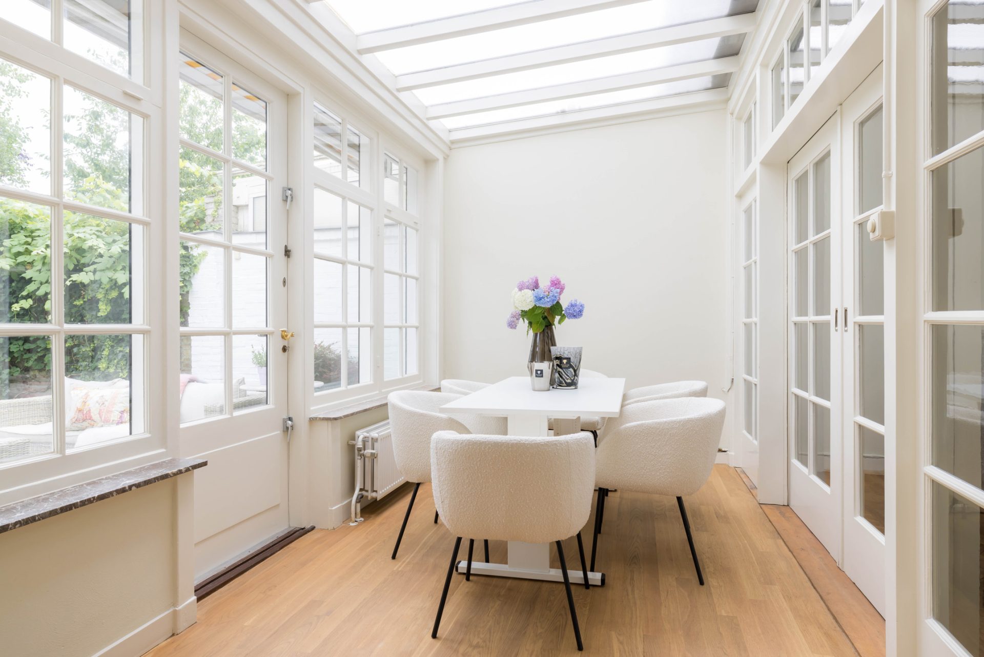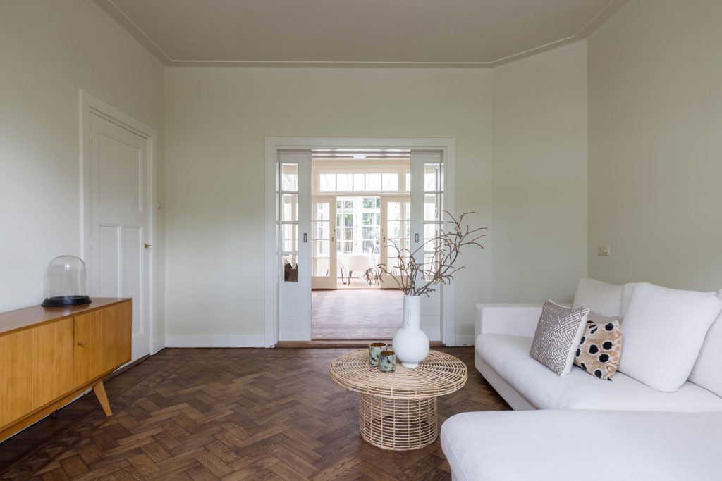 Verrassend is de woonkamer met en-suite verdeling, die aan de achterzijde is uitgebouwd met een tuinkamer. De prachtige parketvloer, marmeren schouw met open haard, inbouwkasten met paneeldeuren en plafondlijsten zorgen voor een aangename sfeer.