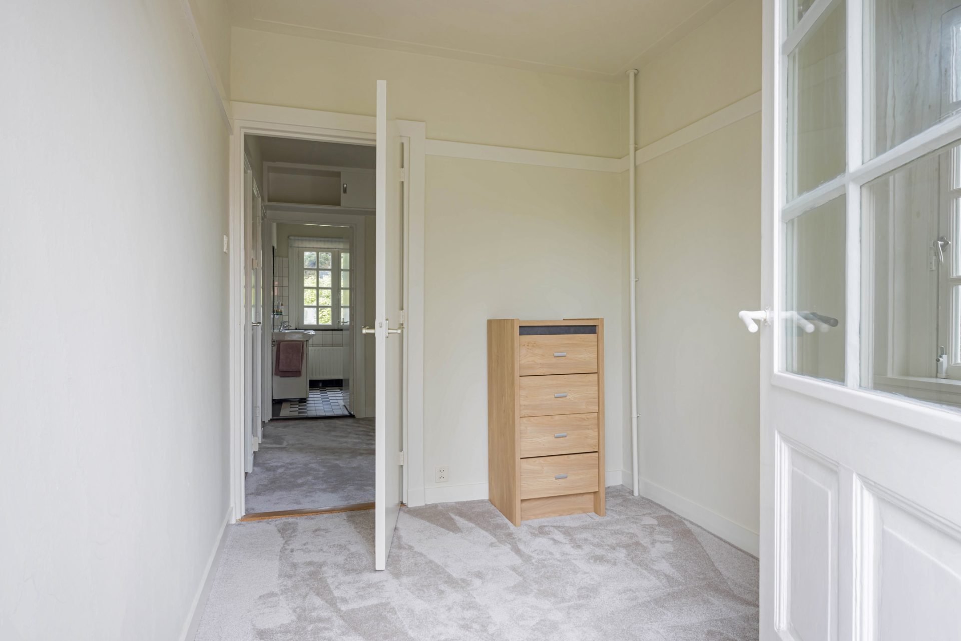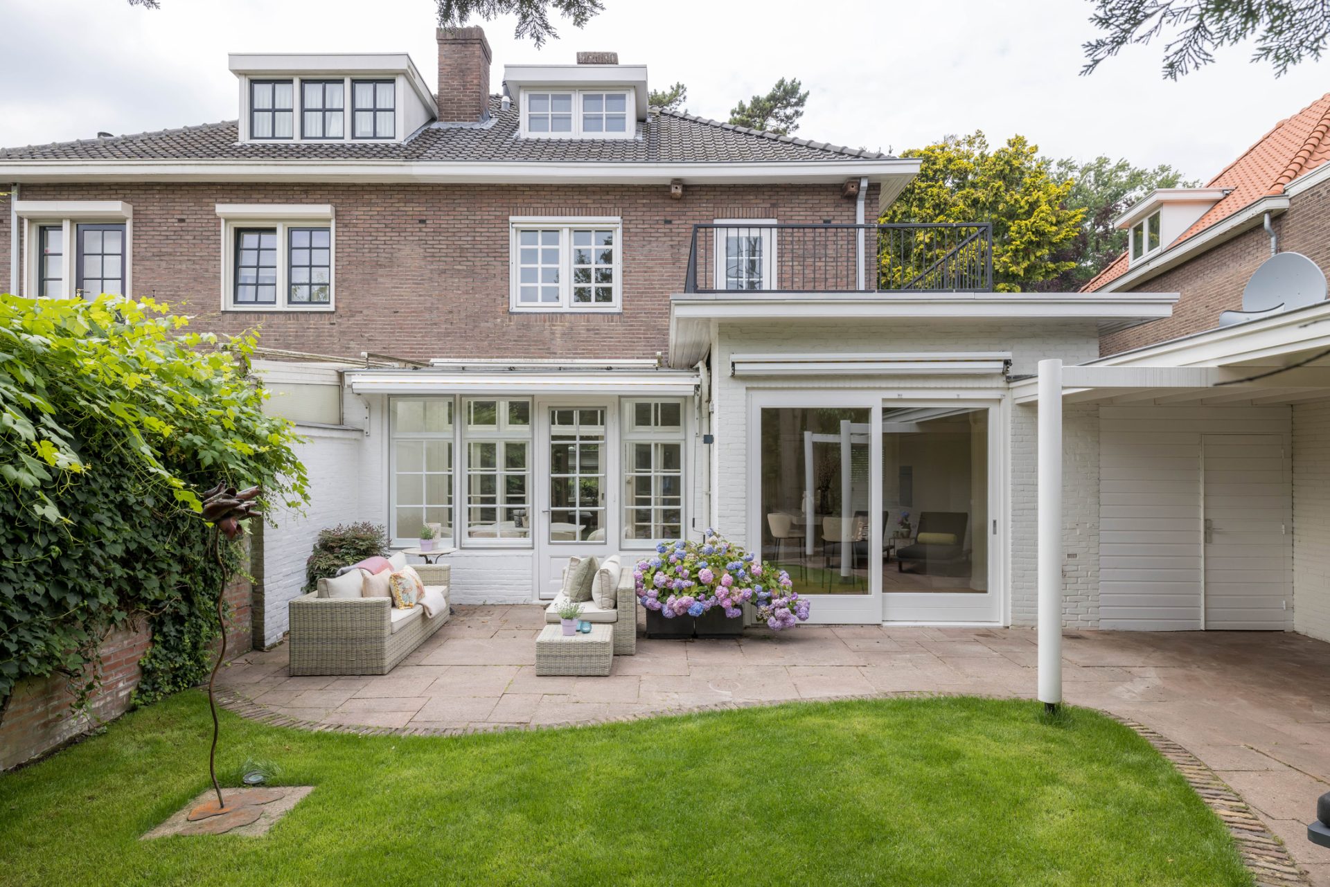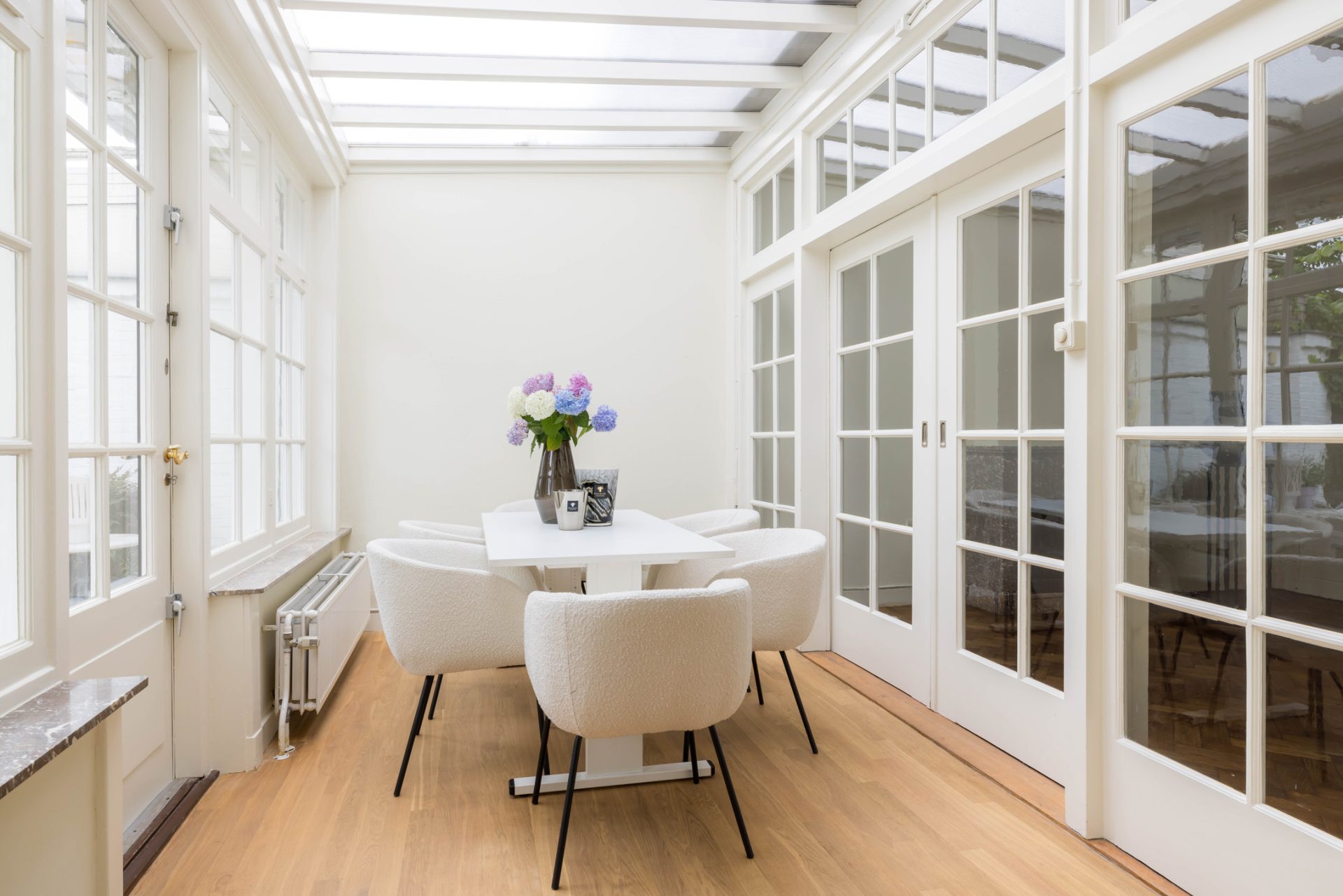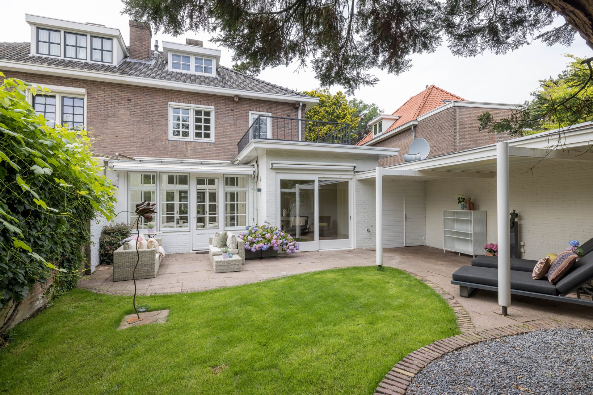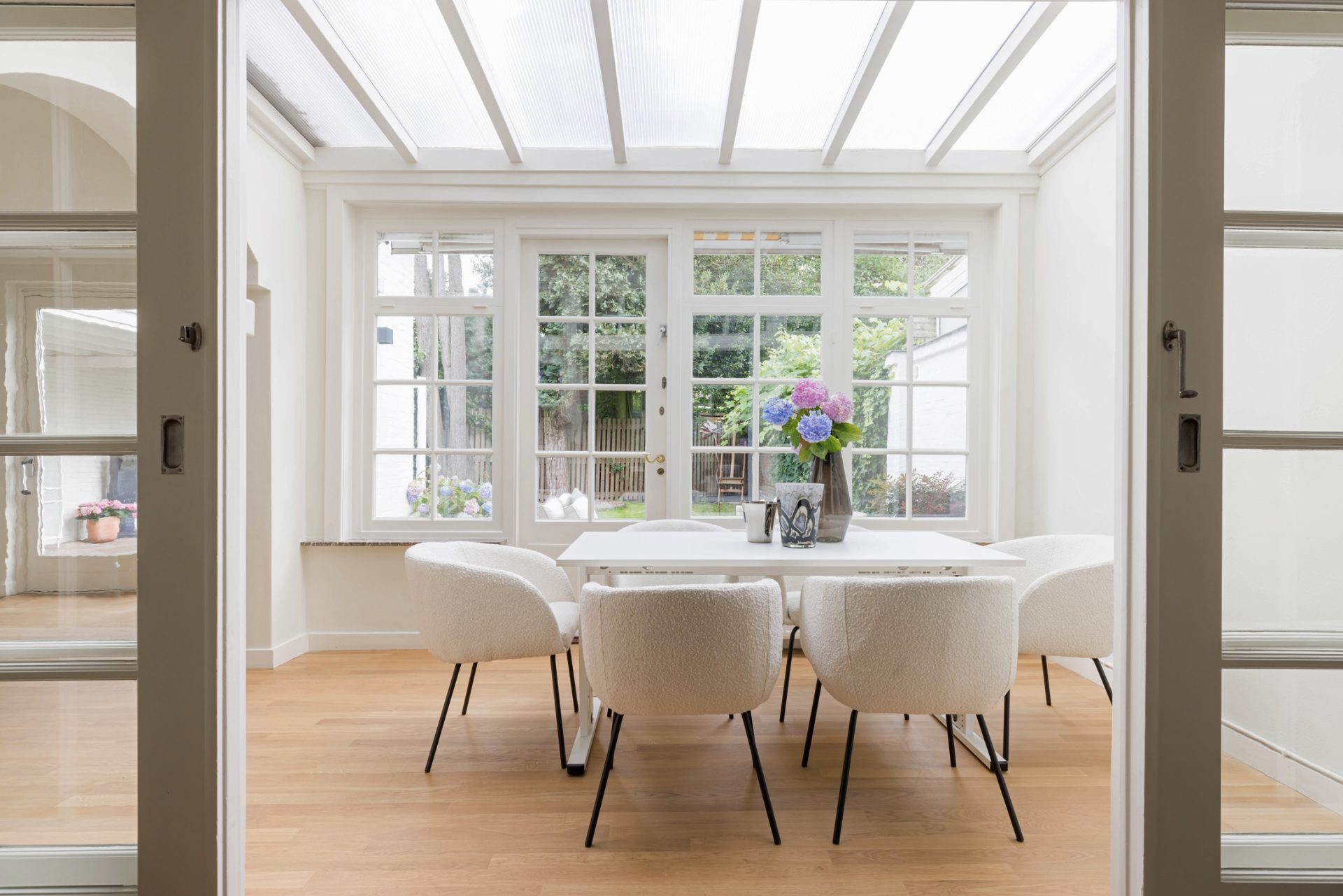 Verrassend is de woonkamer met en-suite verdeling, die aan de achterzijde is uitgebouwd met een tuinkamer. De prachtige parketvloer, marmeren schouw met open haard, inbouwkasten met paneeldeuren en plafondlijsten zorgen voor een aangename sfeer.