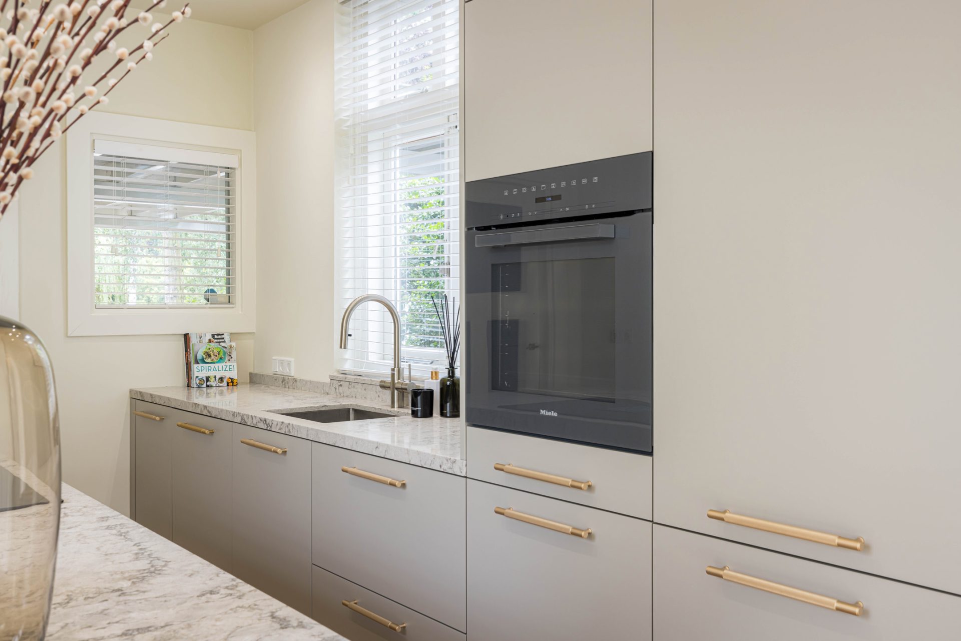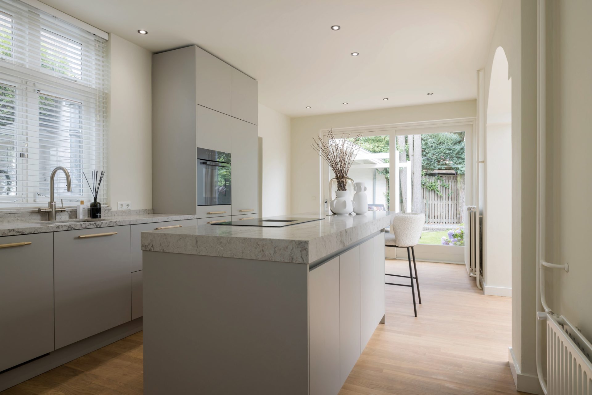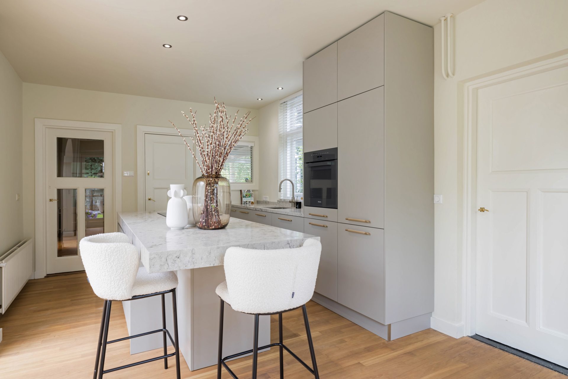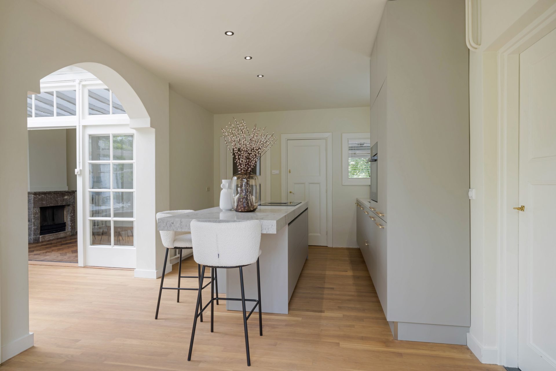 Een scherp contrast is de keuken met een moderne uitstraling en alle denkbare luxe van nu. Een schuifpui verbindt de keuken met de tuin en onder de trap is een diepe kast. De keukenopstelling met eiland is voorzien van alle benodigde inbouwapparatuur en het dikke, marmeren blad is een van de blikvangers. De bijkeuken met spoelbak en vaste kast staat in verbinding met het overdekte terras en de oprit.