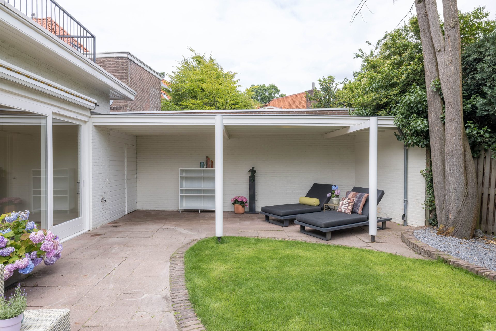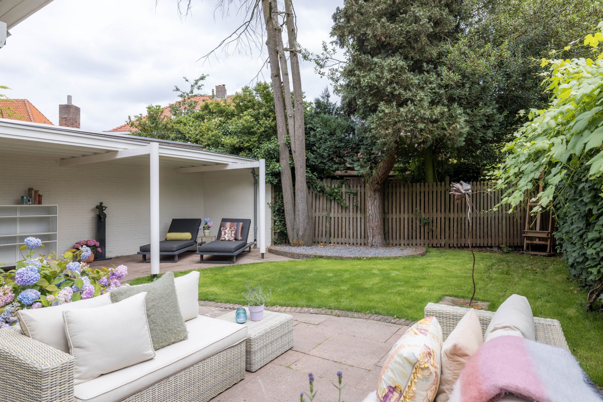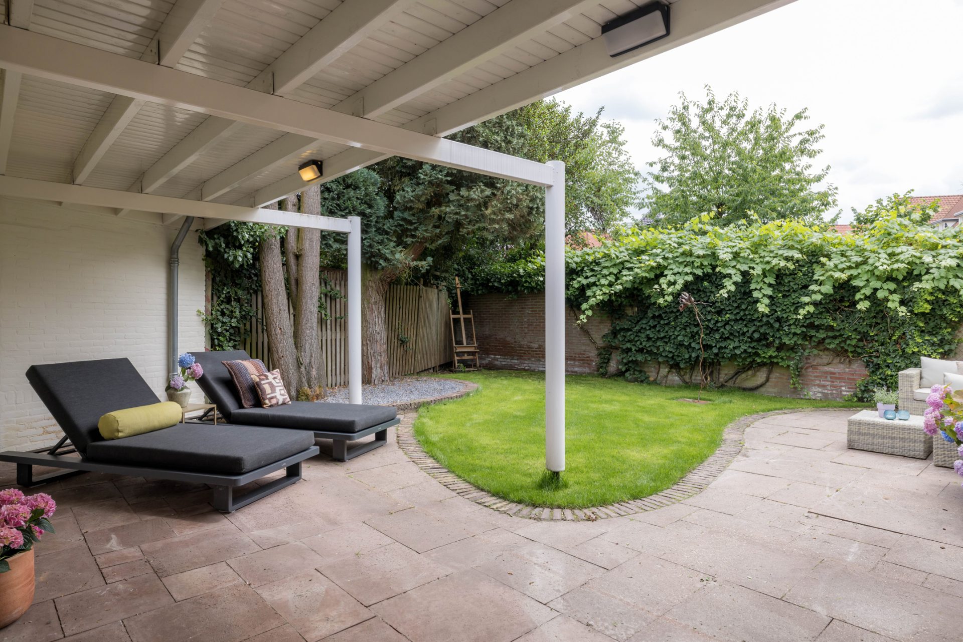 Aan de voorzijde zie je een mooi aangelegde voortuin en een oprit met pergola. Aan het einde is de deur naar de bijkeuken, die in verbinding staat met de achtertuin. Blikvanger in de achtertuin is het overdekte terras met een goede zonligging, waar je het gehele jaar door kan genieten.