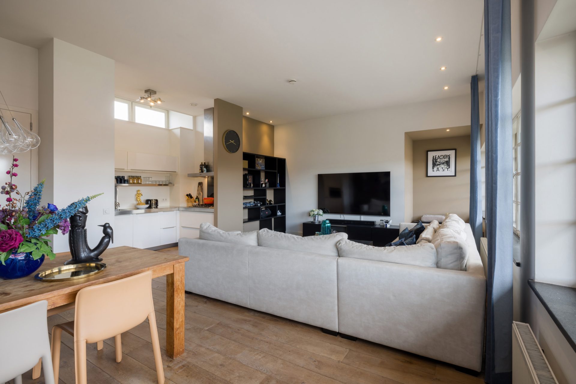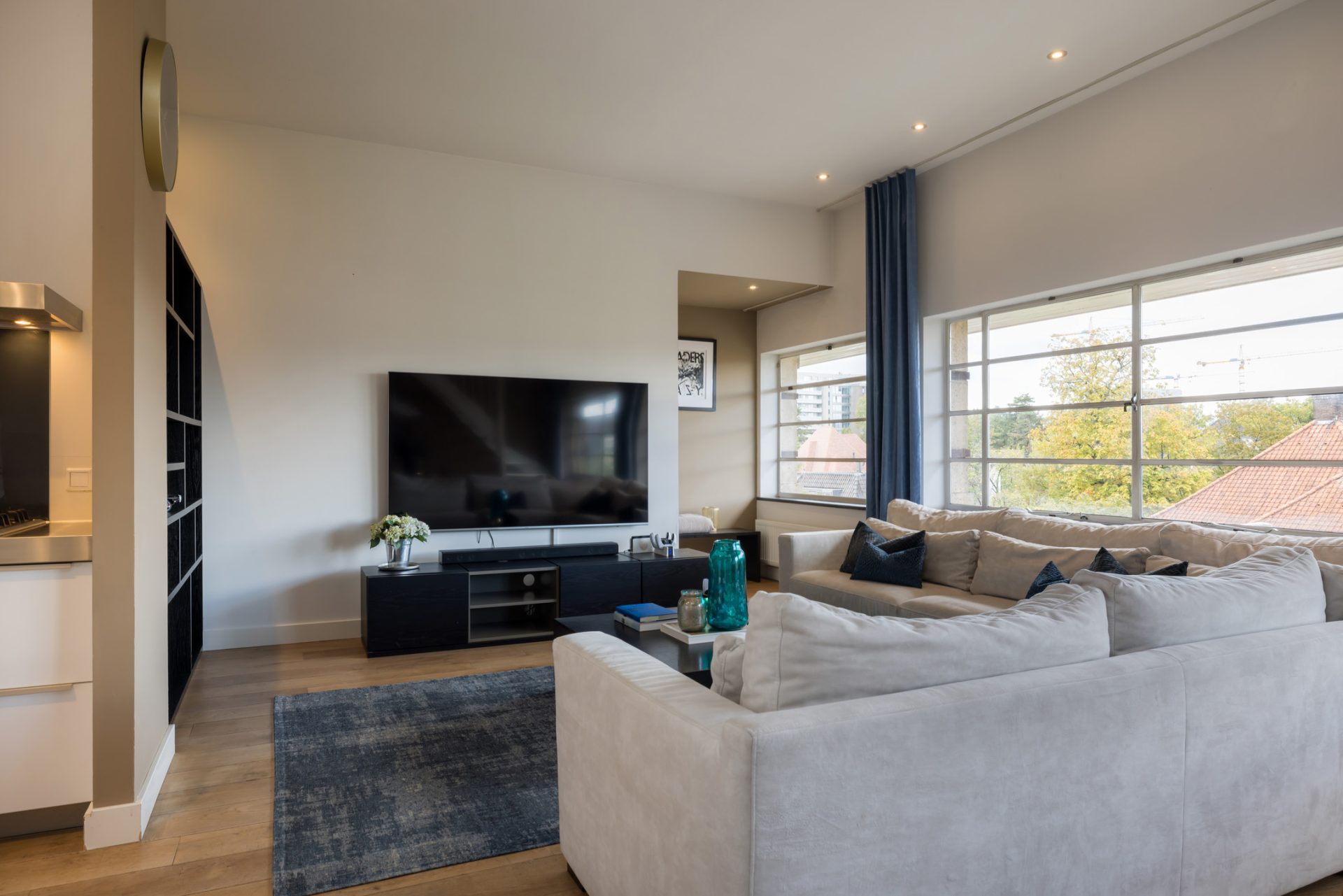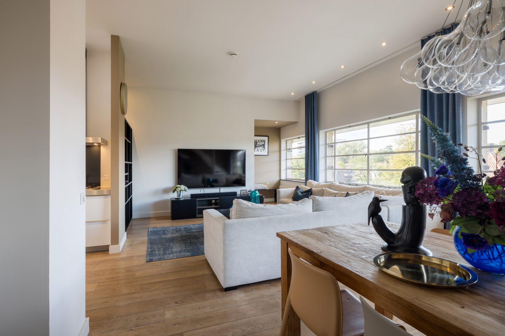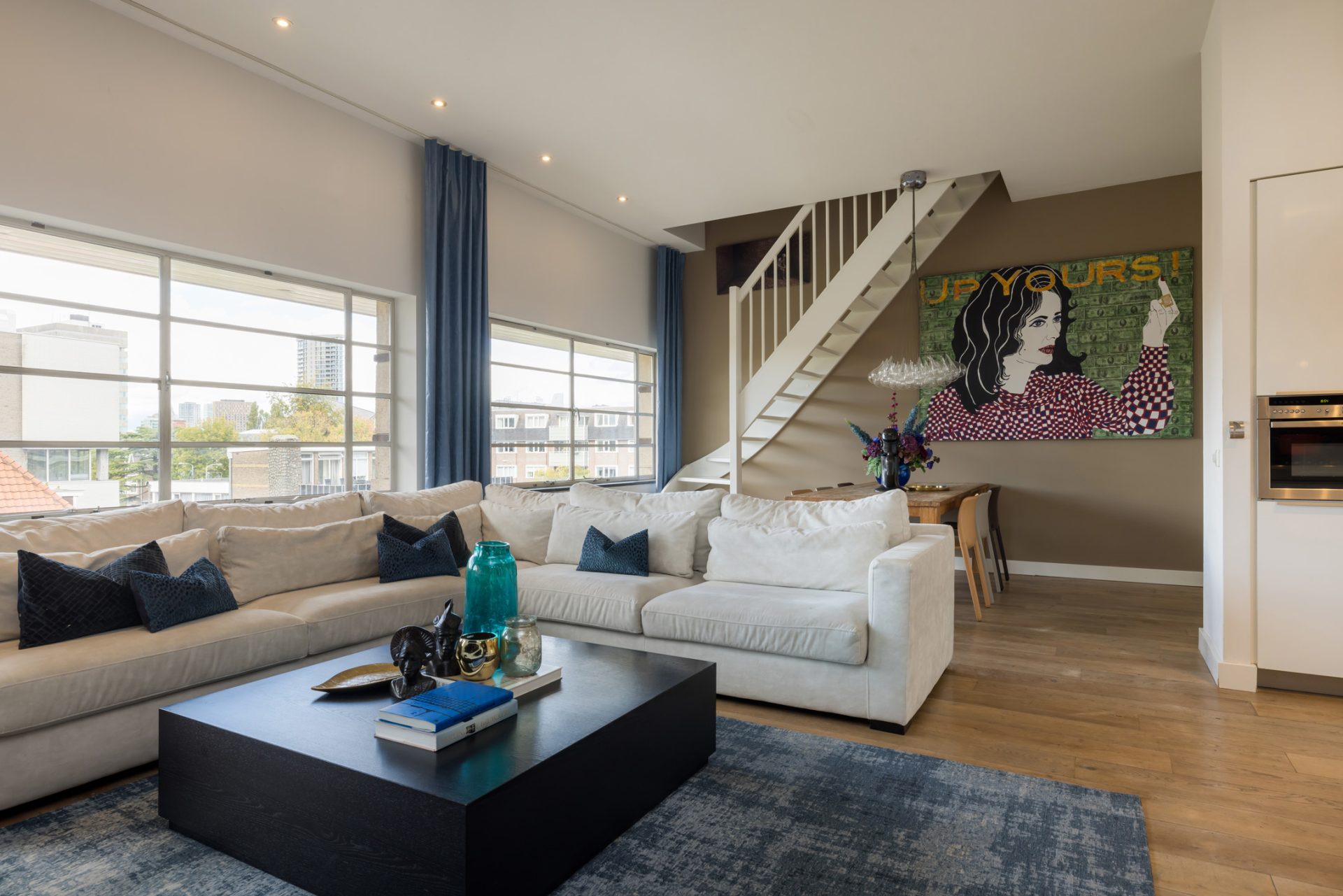 De woonkamer met halfopen keuken heeft een hoog plafond en grote ramen aan de noordwestkant. Dit zorgt voor veel natuurlijke lichtinval bij het ruime zitgedeelte en het eetgedeelte. Het uitzicht naar klassieke (halfvrijstaande) villa’s, het Medisch Kwartier Eindhoven en de woontorens in het centrum is fraai.