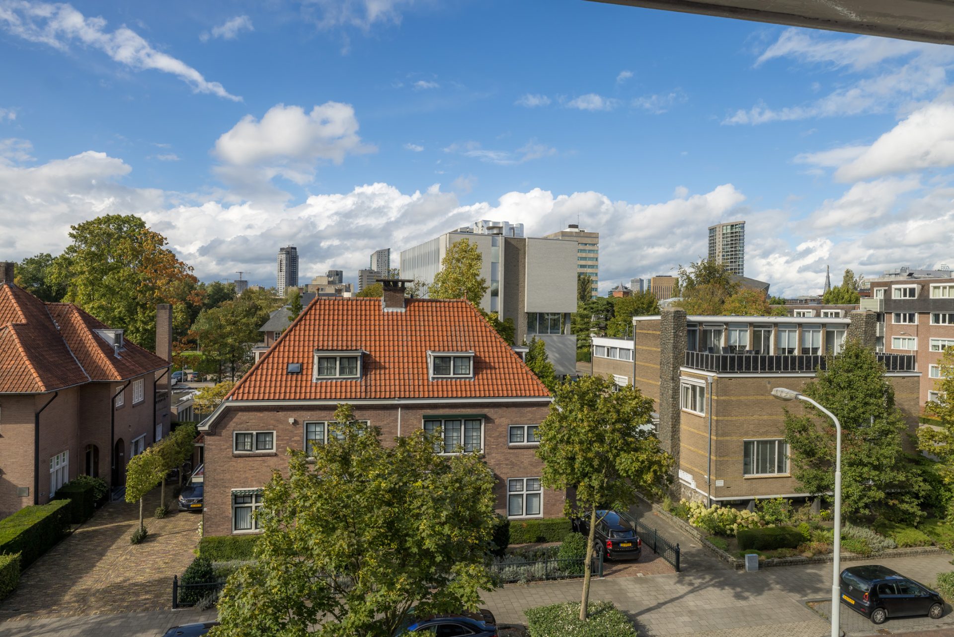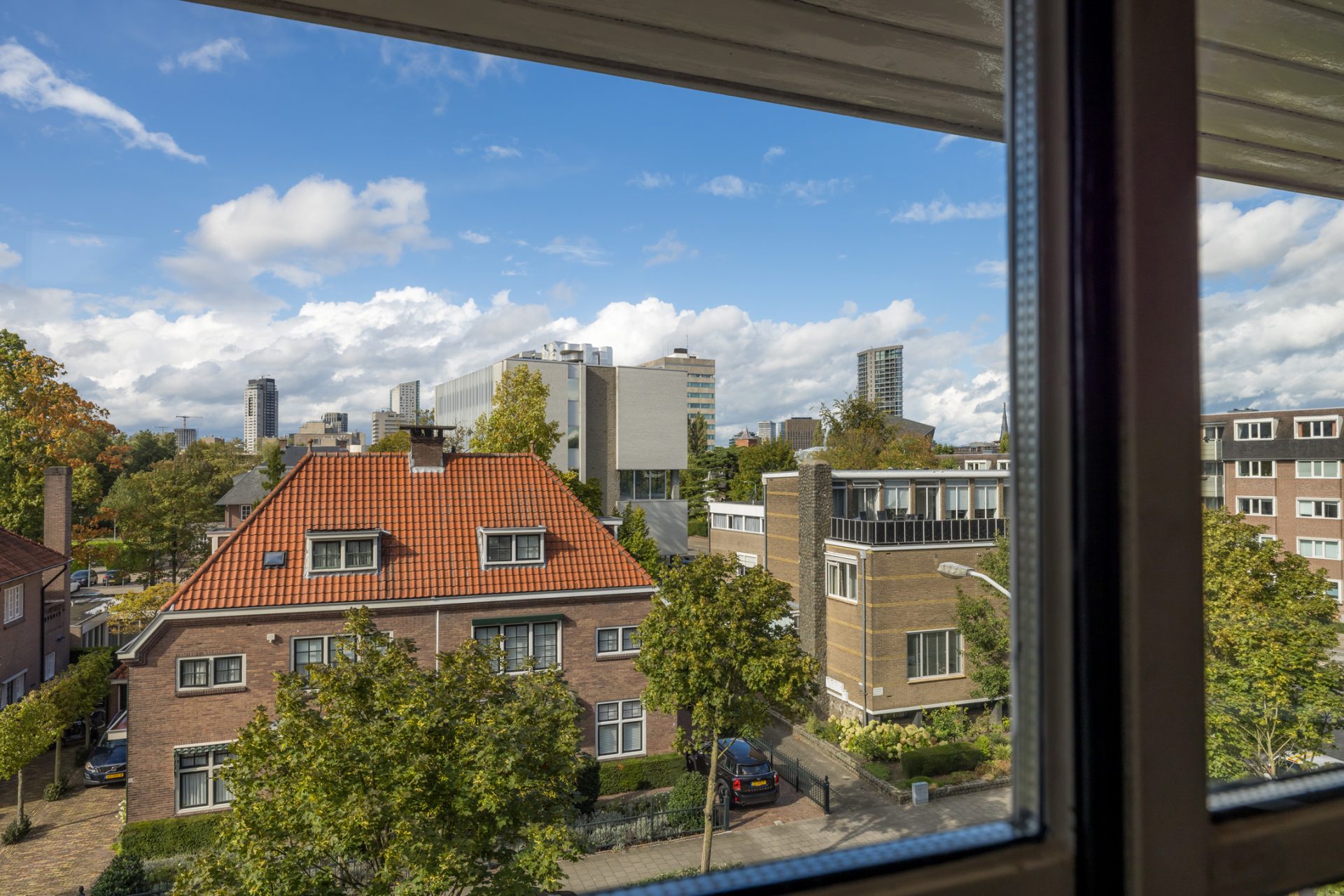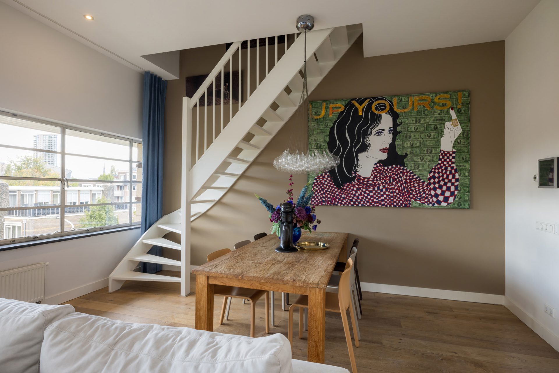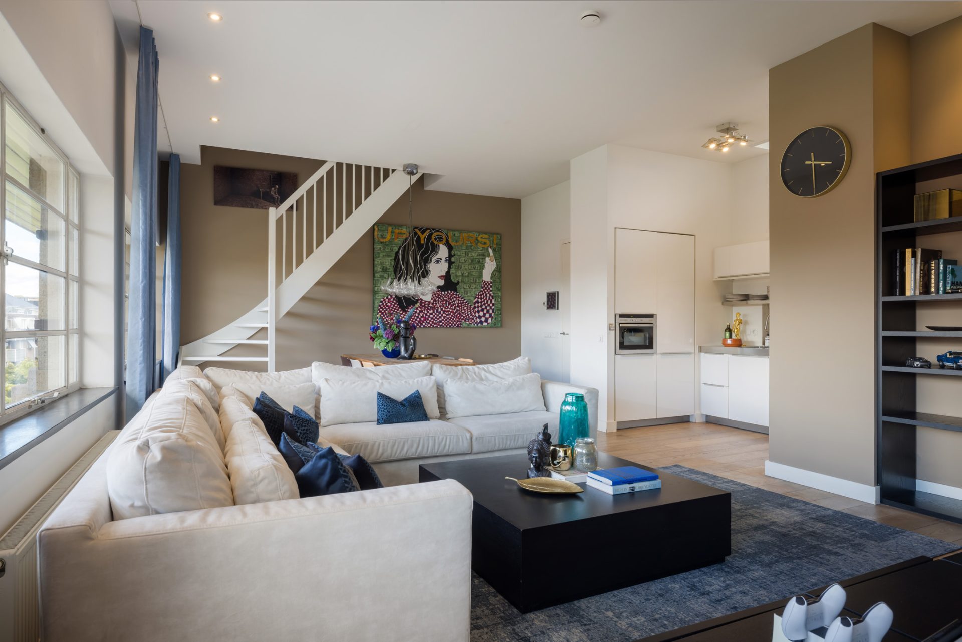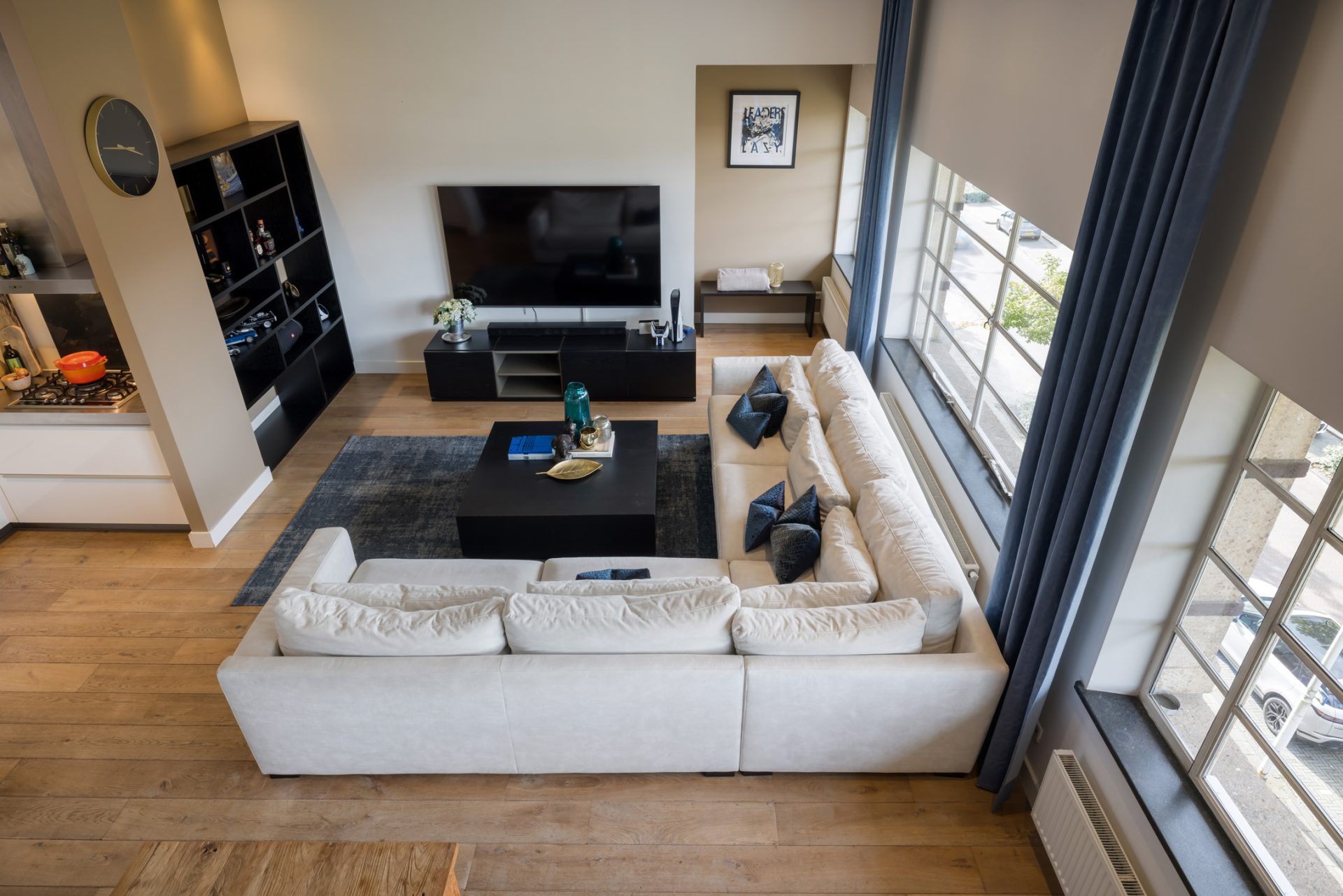 De woonkamer met halfopen keuken heeft een hoog plafond en grote ramen aan de noordwestkant. Dit zorgt voor veel natuurlijke lichtinval bij het ruime zitgedeelte en het eetgedeelte. Het uitzicht naar klassieke (halfvrijstaande) villa’s, het Medisch Kwartier Eindhoven en de woontorens in het centrum is fraai.