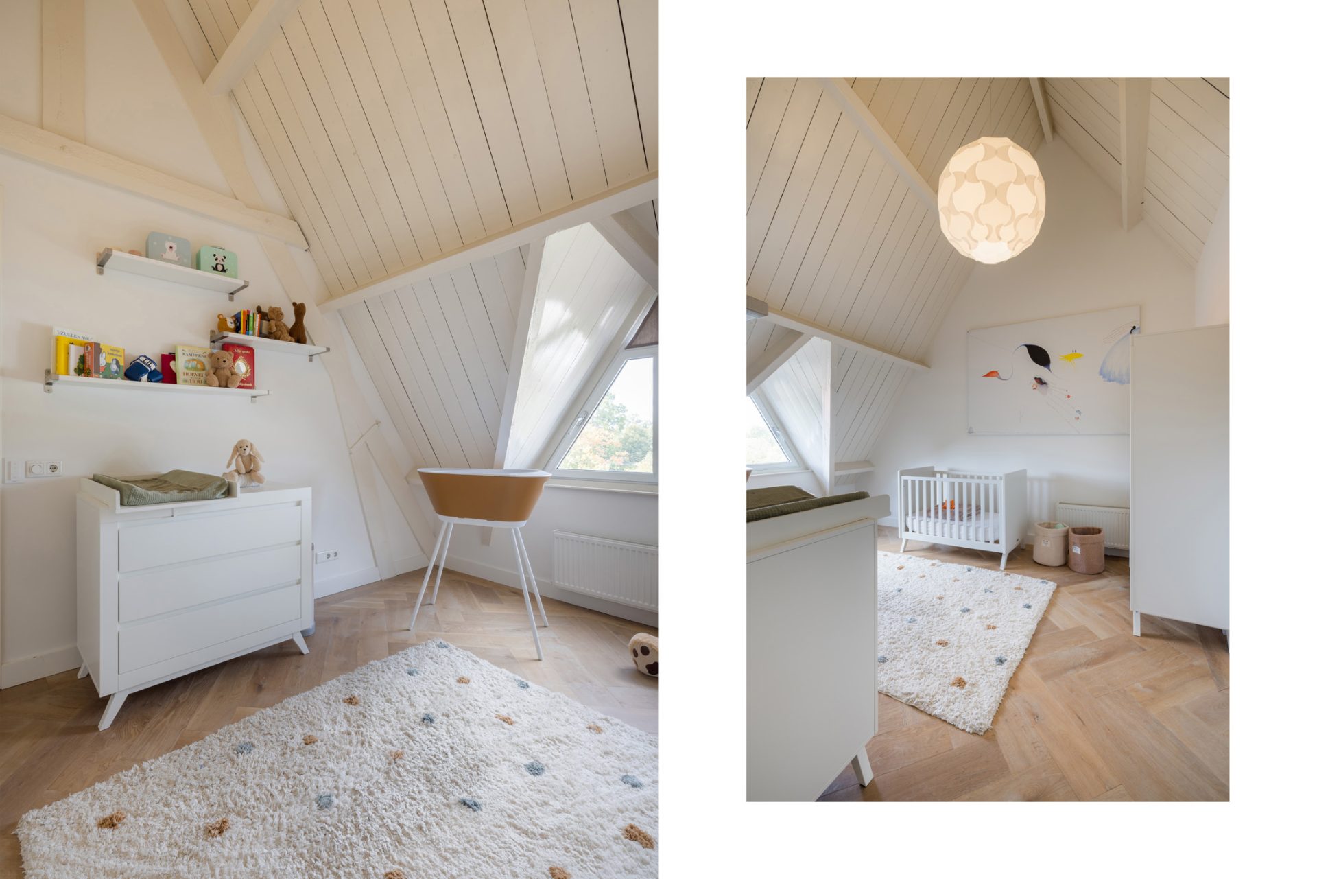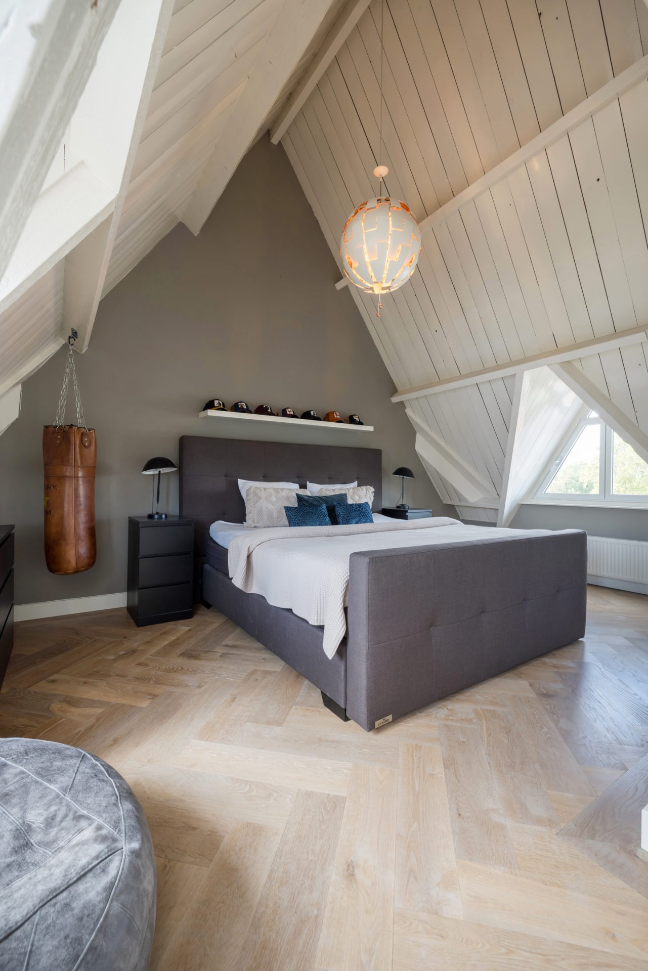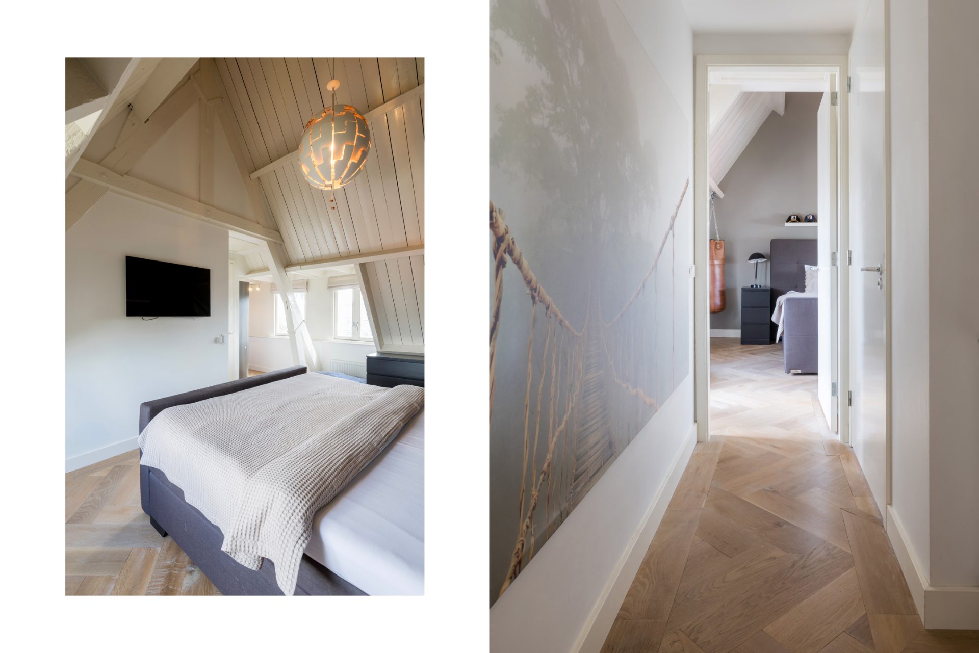 Volg de trap vanuit de woonkamer naar de derde verdieping, onder het prachtige houten dak. Vanaf de overloop zijn twee ruime slaapkamers en de badkamer te bereiken. Sfeermakers zijn de visgraat eikenhouten vloer, het zicht tot in de nok en het behang op de overloop.