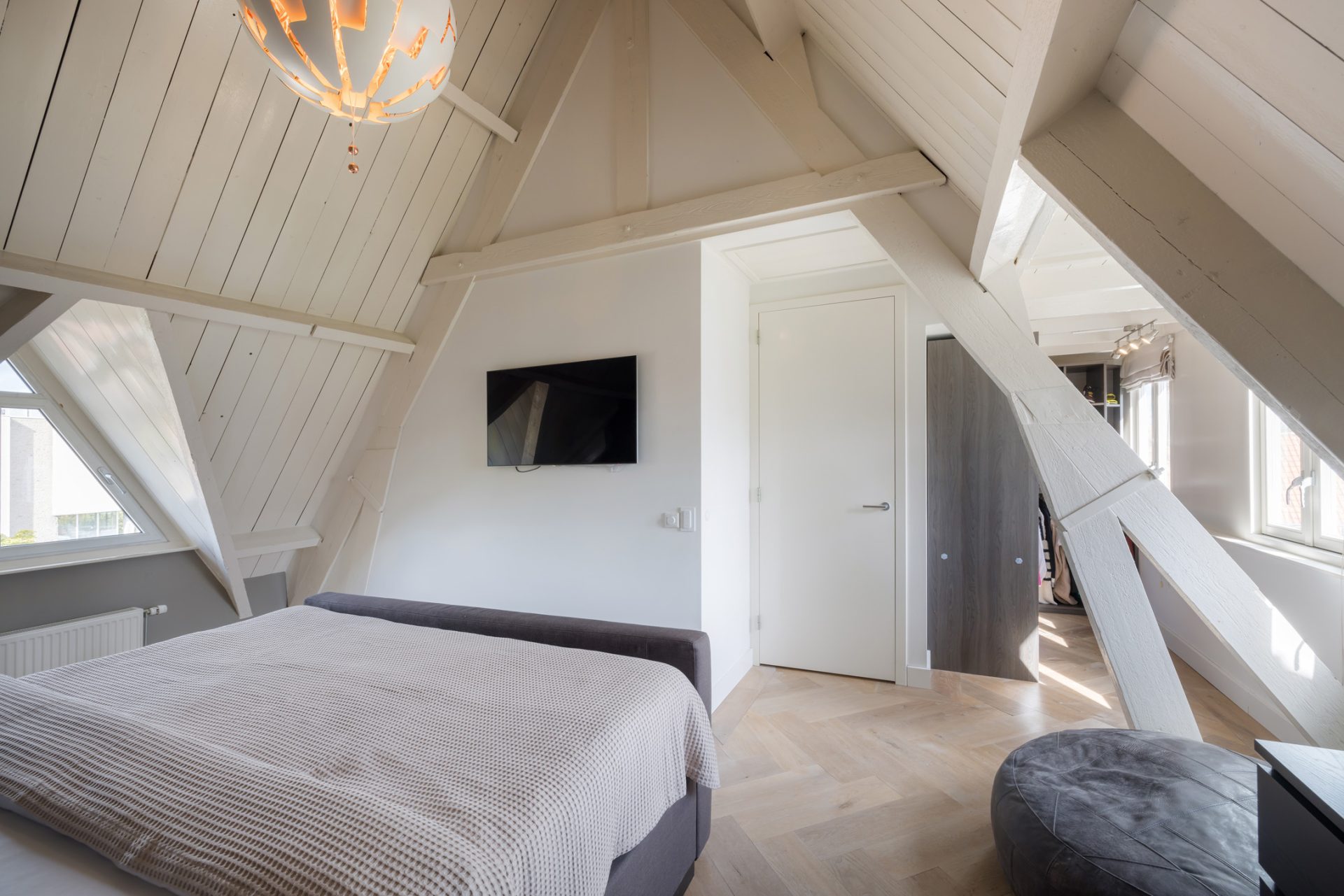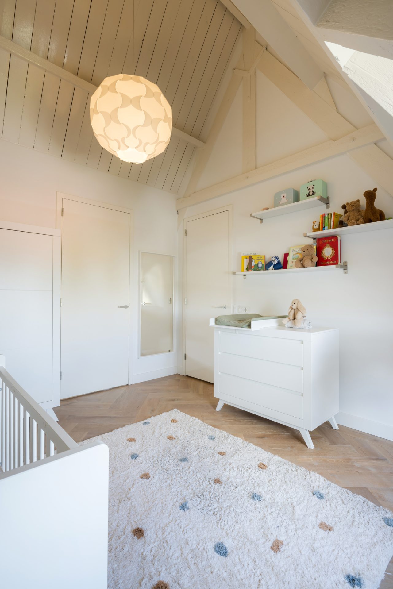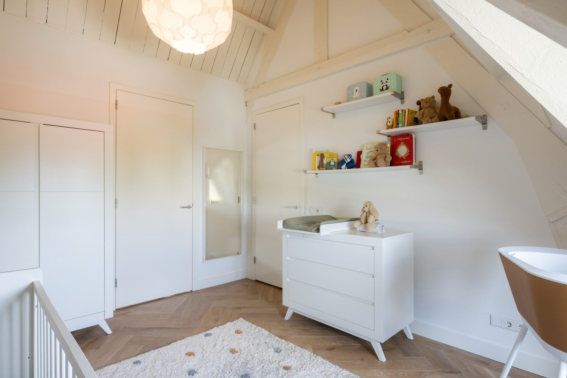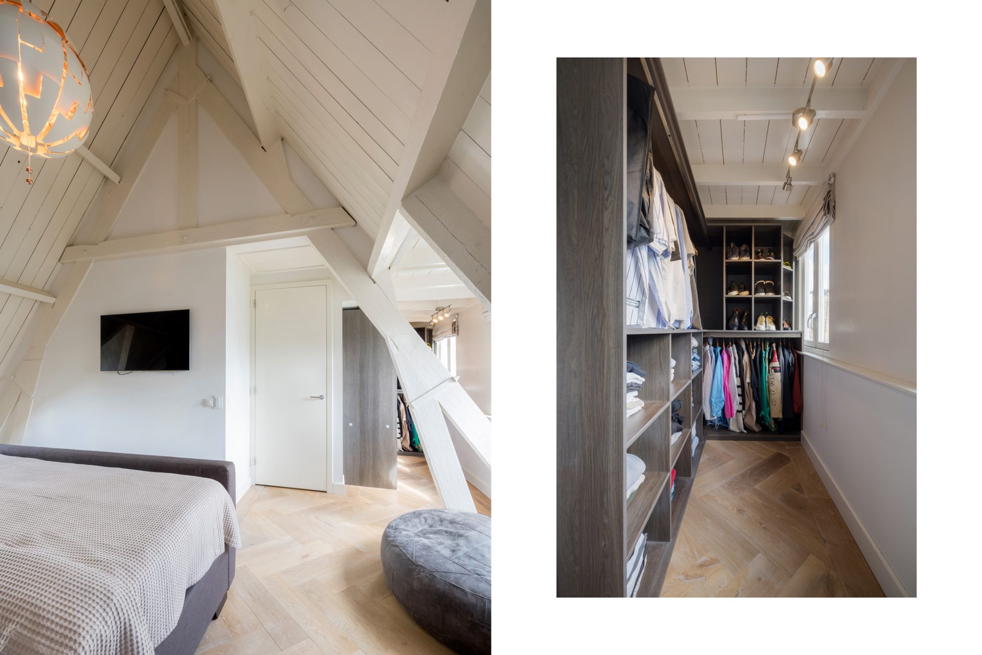 Volg de trap vanuit de woonkamer naar de derde verdieping, onder het prachtige houten dak. Vanaf de overloop zijn twee ruime slaapkamers en de badkamer te bereiken. Sfeermakers zijn de visgraat eikenhouten vloer, het zicht tot in de nok en het behang op de overloop.