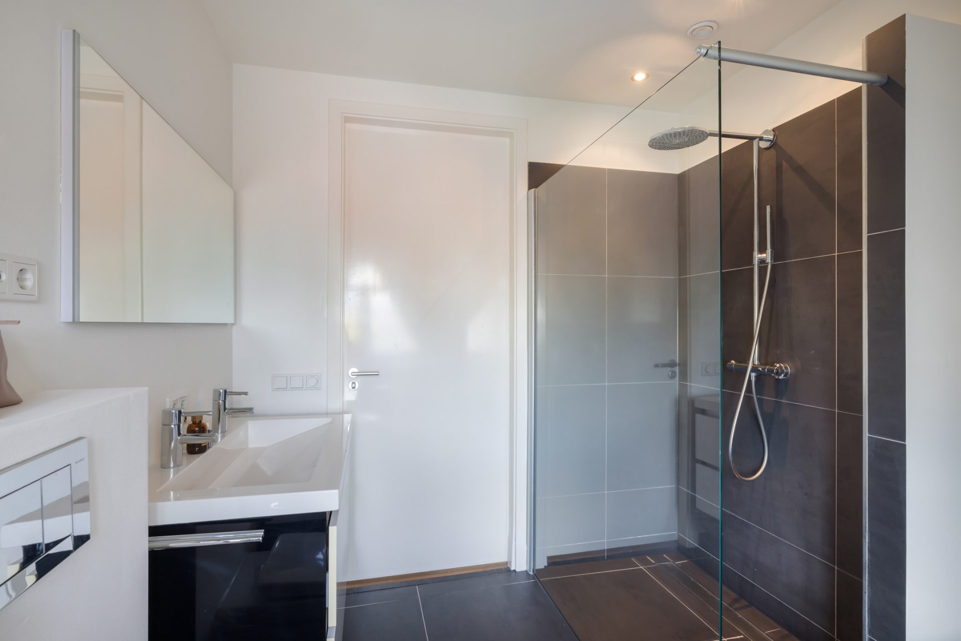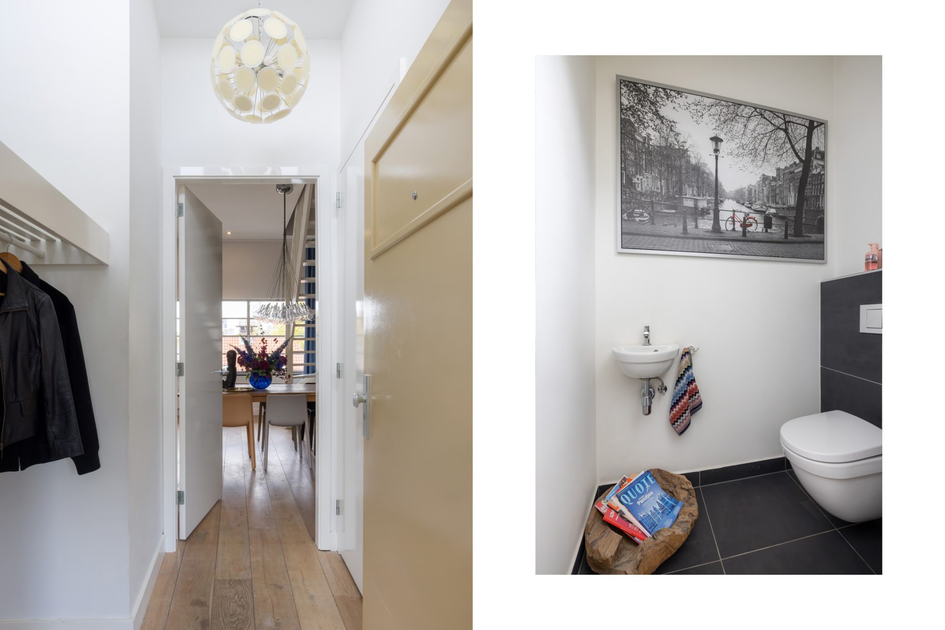 In de hal met hoog plafond zie je een nis voor de kapstok en aan de andere zijde een deur naar de ruime toiletruimte met fonteintje. Je ziet direct dat de afwerking zeer goed is, waardoor je niet hoeft te verbouwen.