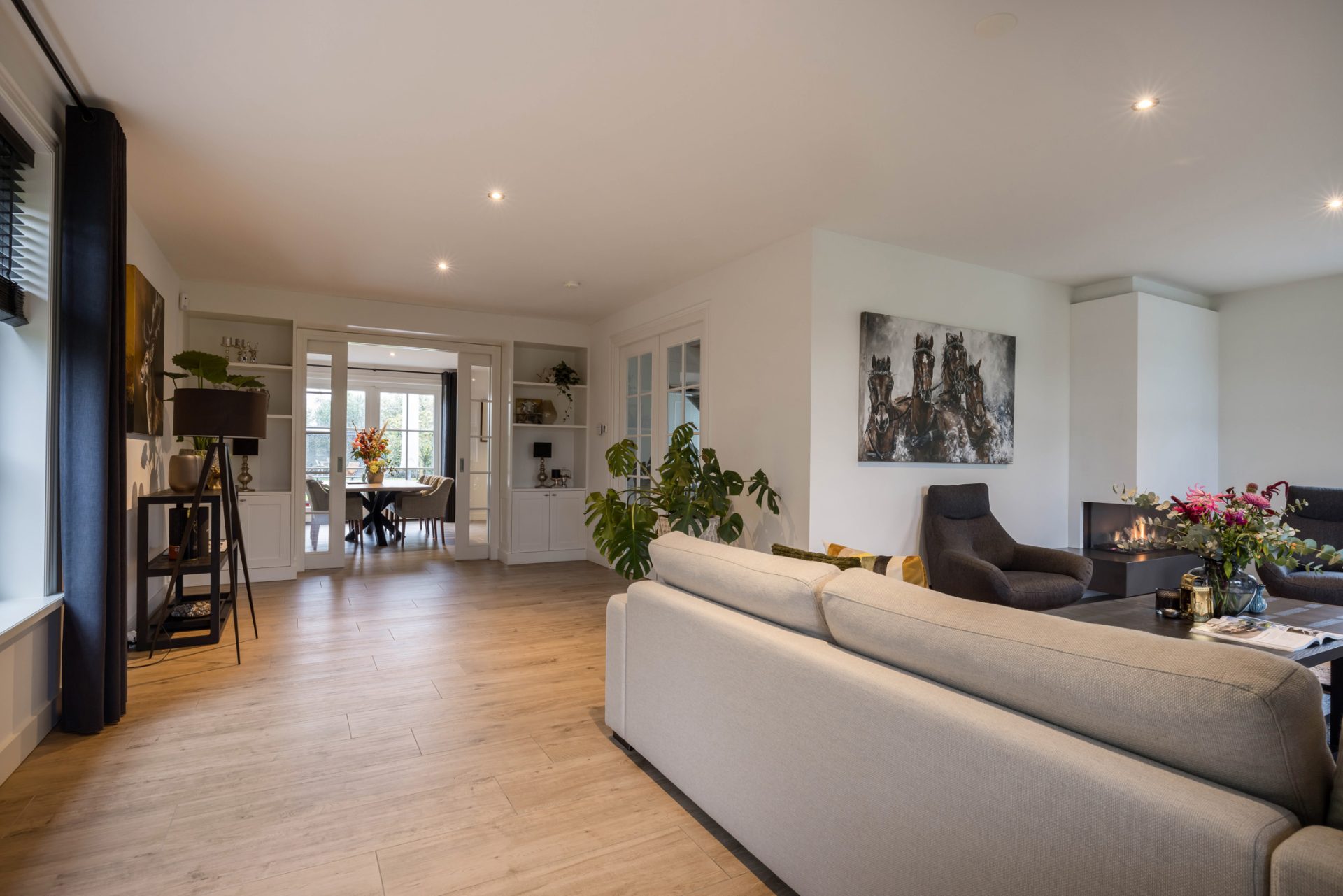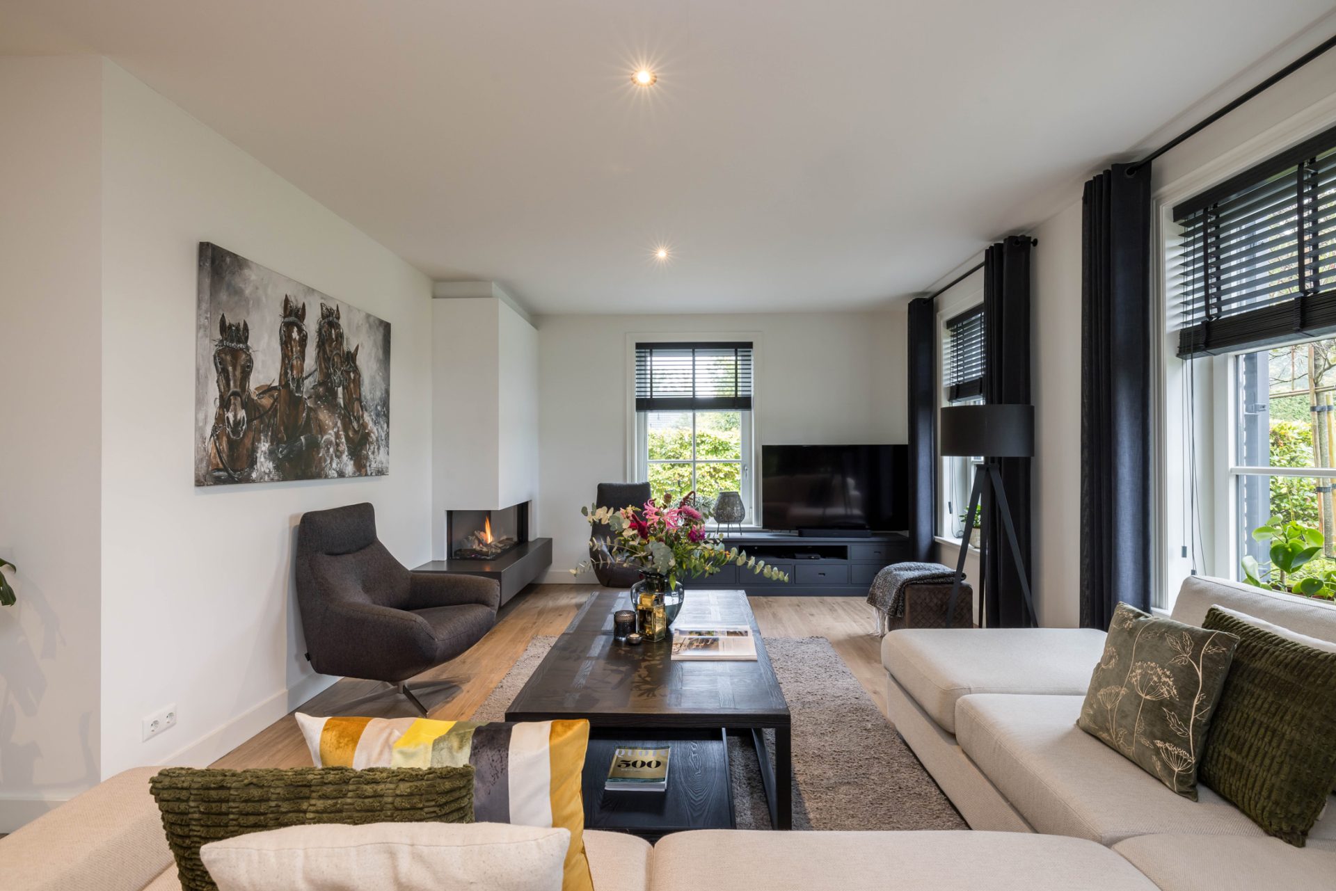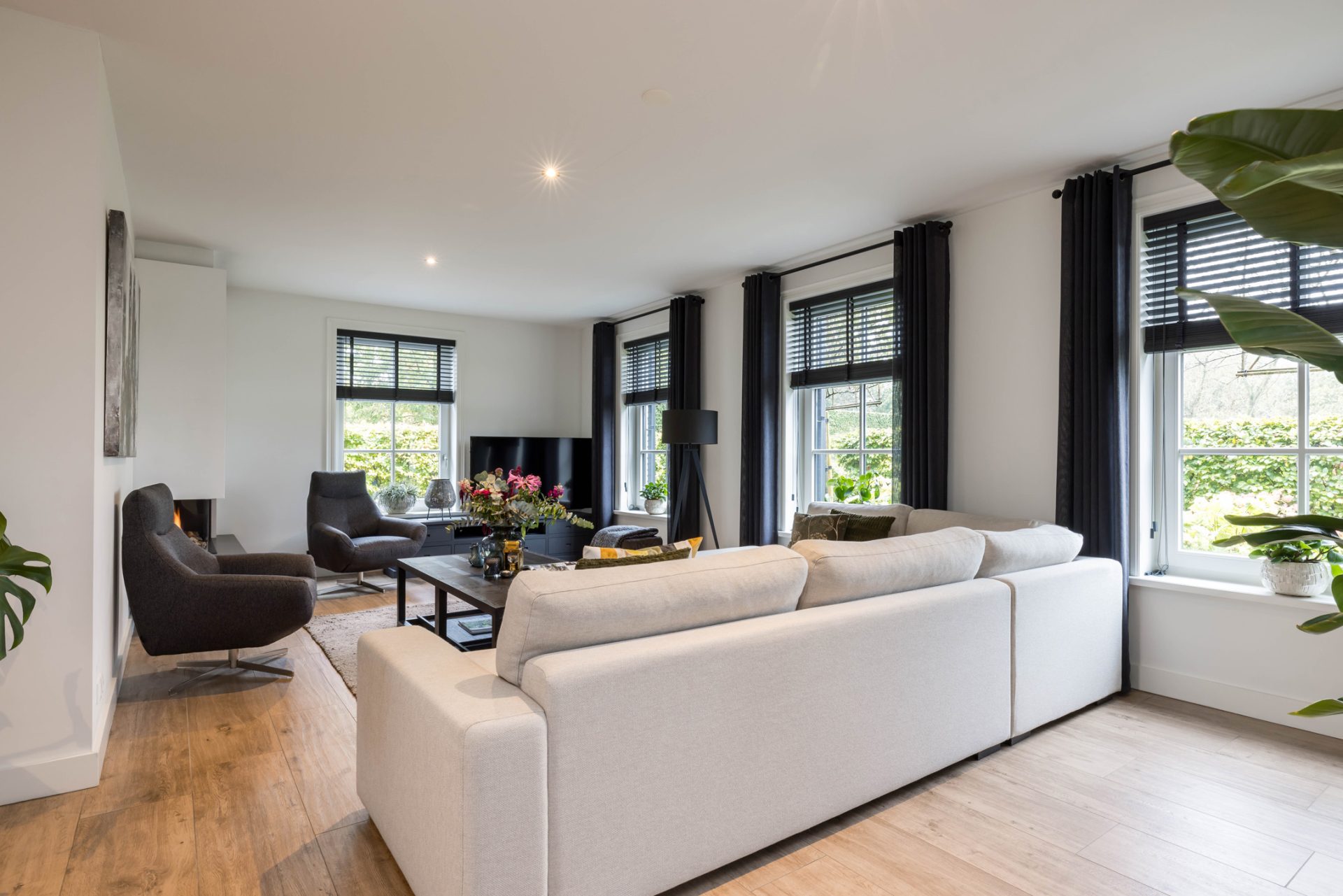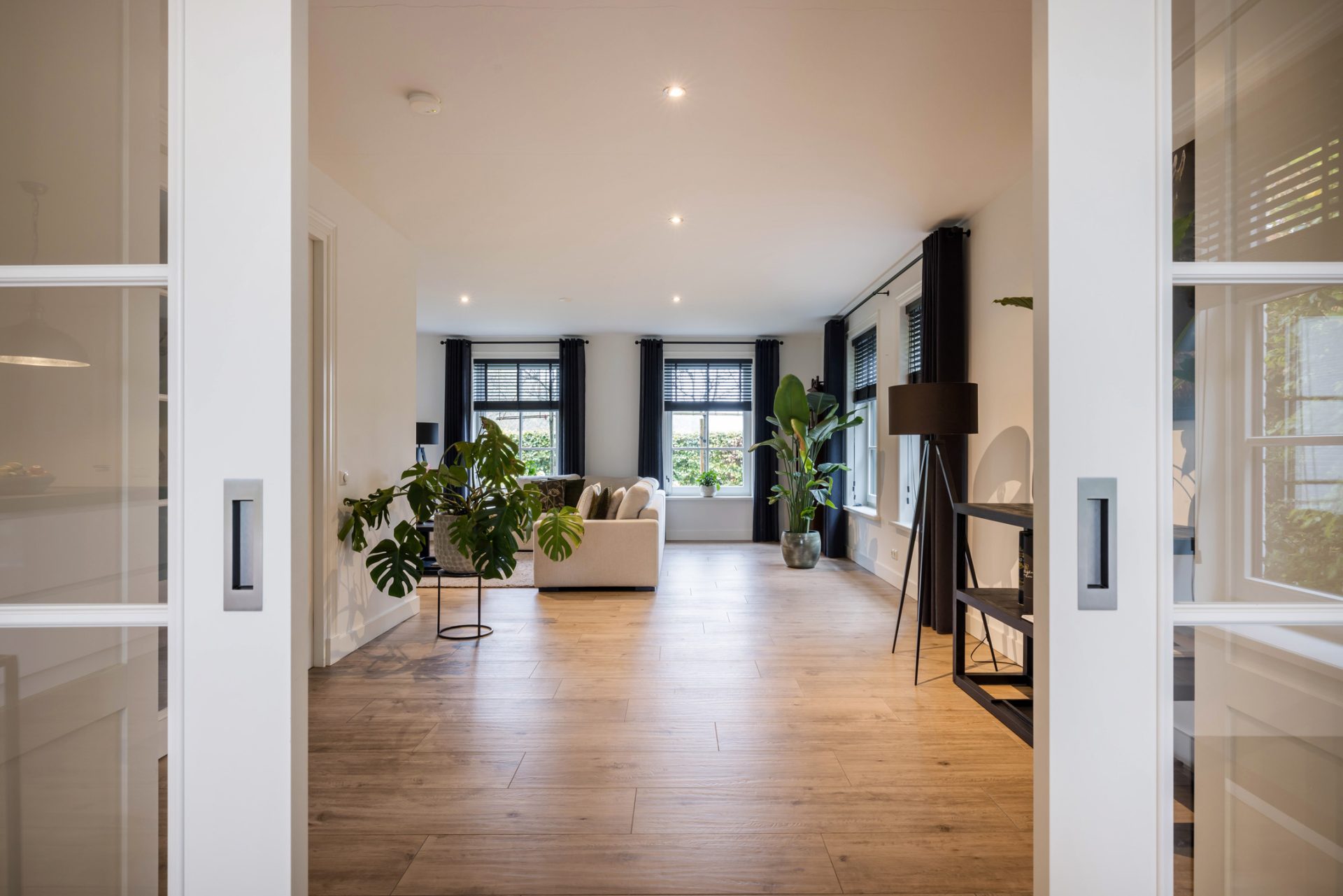 Dubbele deuren met glas verbinden de hal met de L-vormige woonkamer, die geheel als zitkamer ingericht kan worden. Mooie elementen zijn de grote ramen met brede vensterbanken, de moderne gashaard en de en-suite verdeling met vaste kasten.