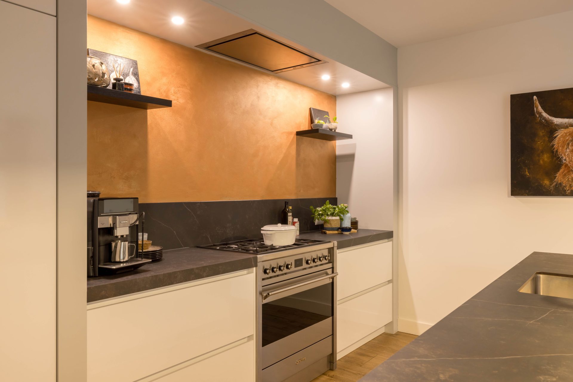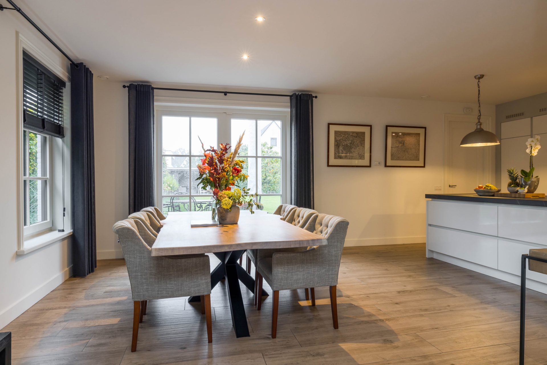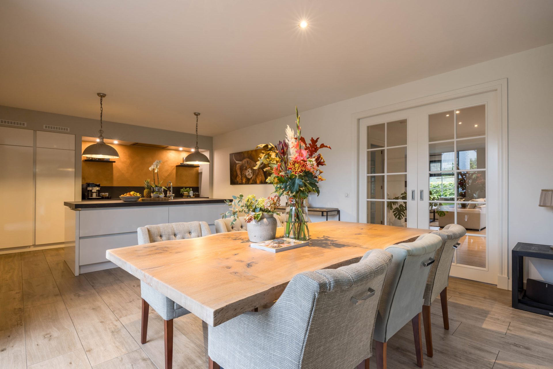 Achter de schuifdeuren is de eetkeuken met fraai uitzicht naar de achtertuin. Er is genoeg ruimte om met vrienden of familie te dineren en de openslaande deuren verbinden de keuken met het ruime terras. De prachtige keukenopstelling met groot eiland is het toppunt van luxe waarbij is gekozen voor een mooi, maar ingetogen kleurenpalet. Alle benodigde inbouwapparatuur voor het maken van jouw favoriete gerechten is aanwezig.