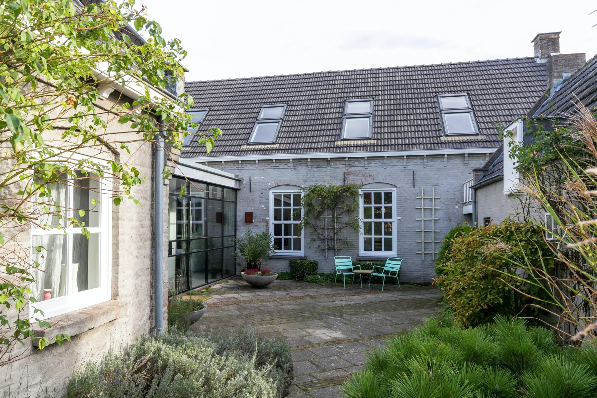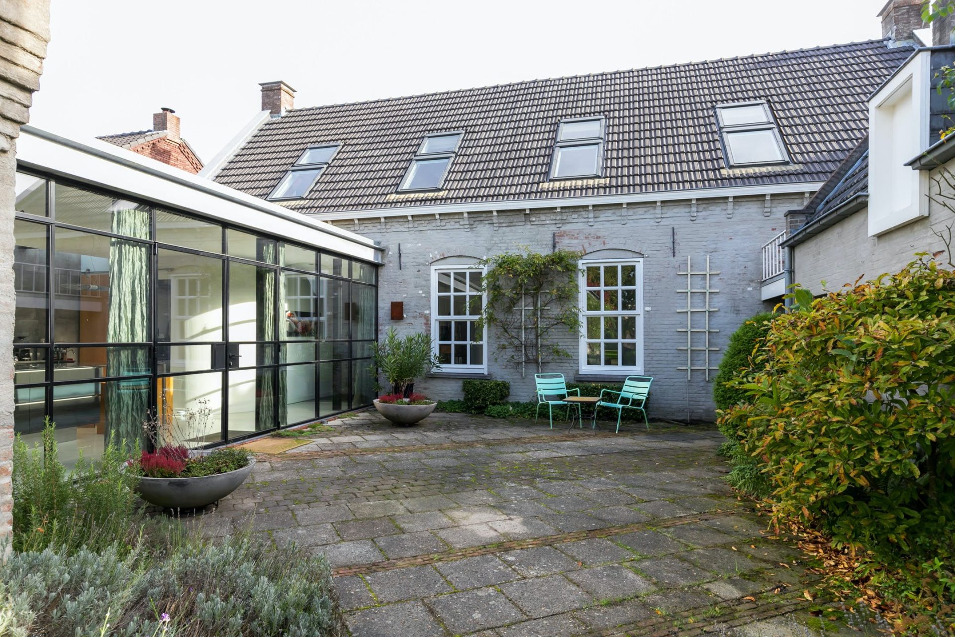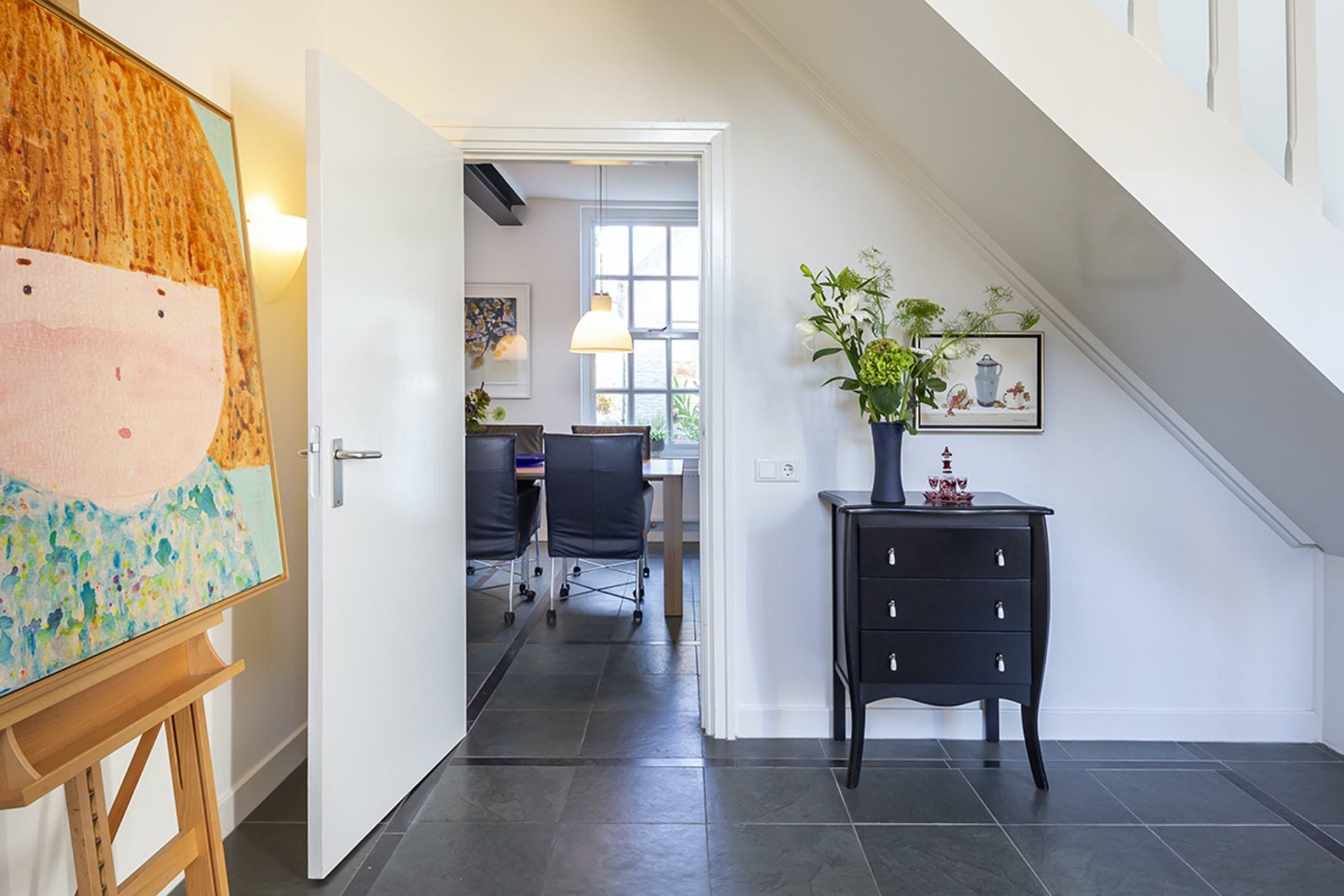 De prachtige voorgevel met de raamluiken, ramen in roedeverdeling en de details in het metselwerk. Via de mooie voordeur met levensboom loopt u de hal in waaraan een tweede hal, de eetkamer en een werkkamer grenzen. In de tweede hal zijn de garderobe en de toiletruimte met fonteintje gesitueerd. De werkkamer met balkenplafond is een mooie, lichte ruimte met mooi uitzicht naar de Kapelstraat.