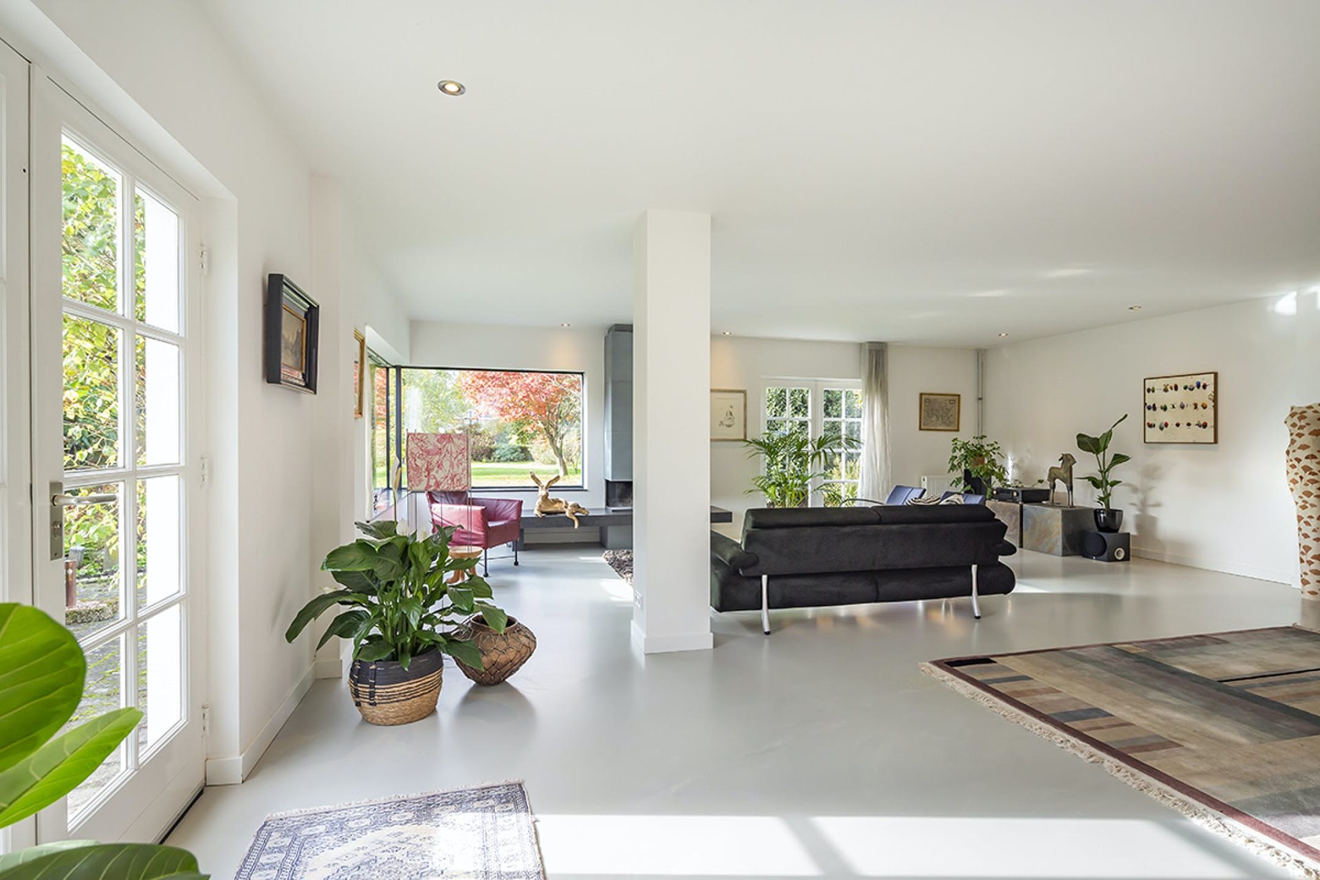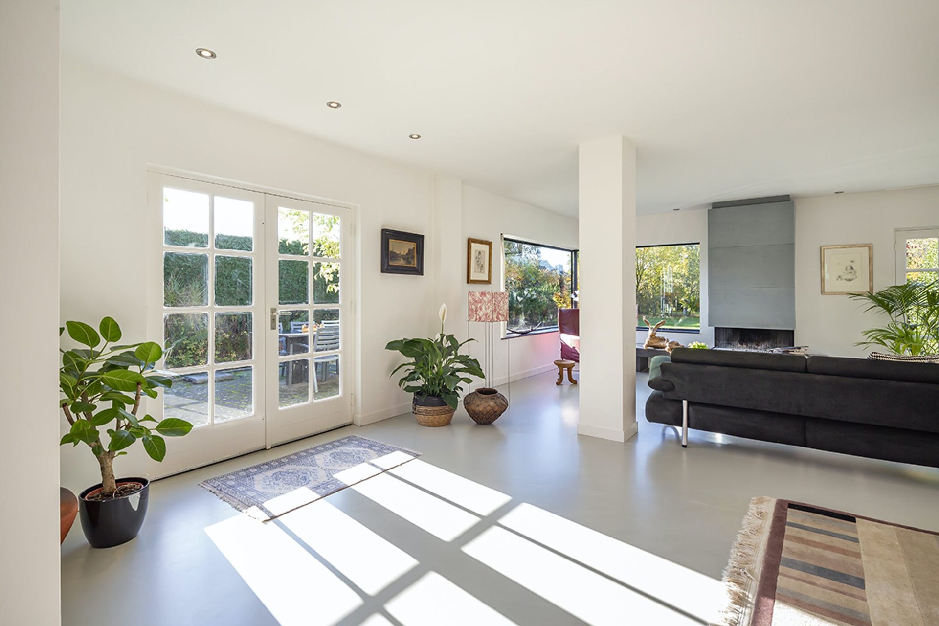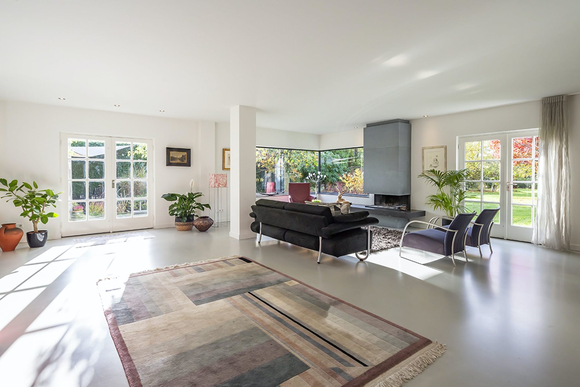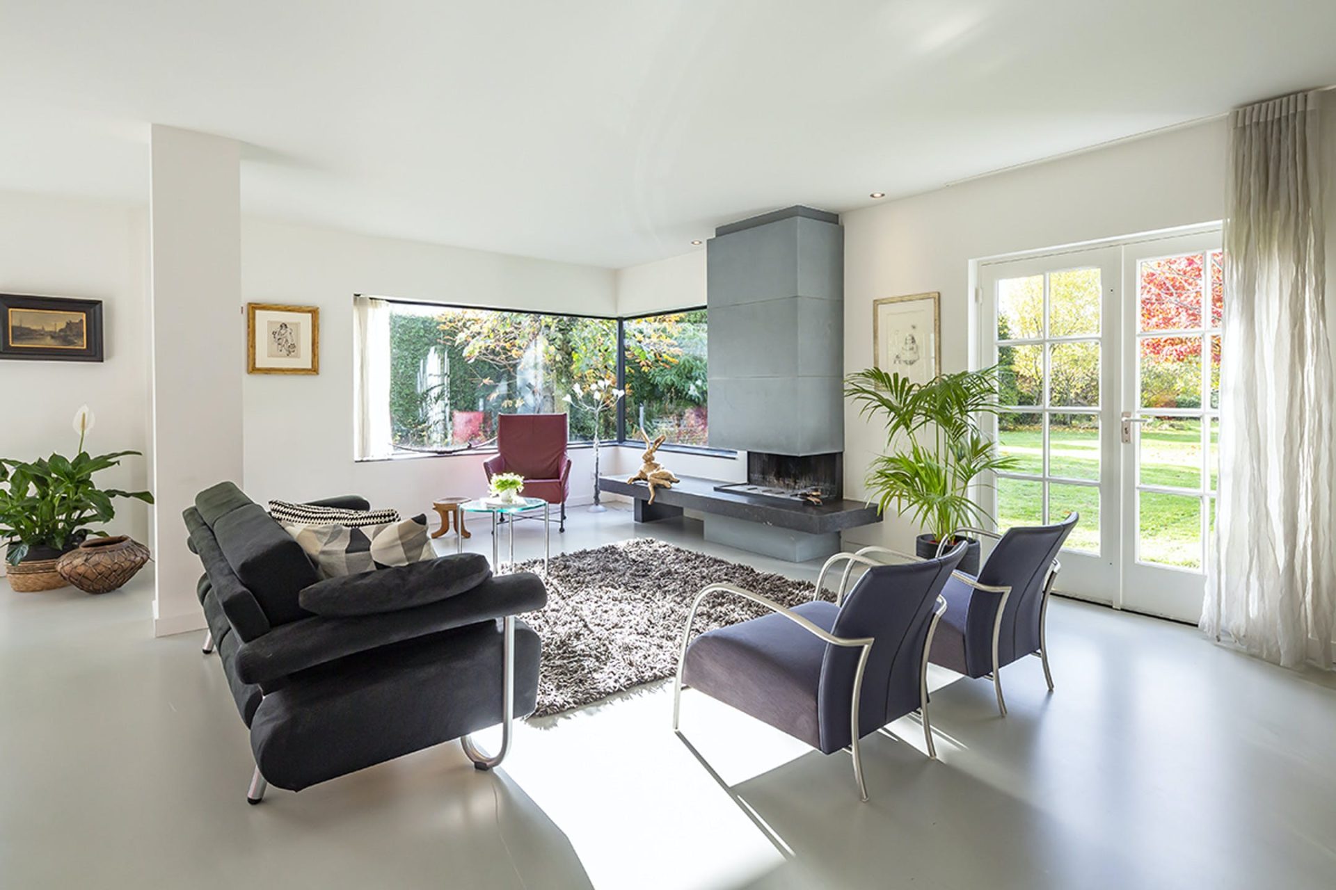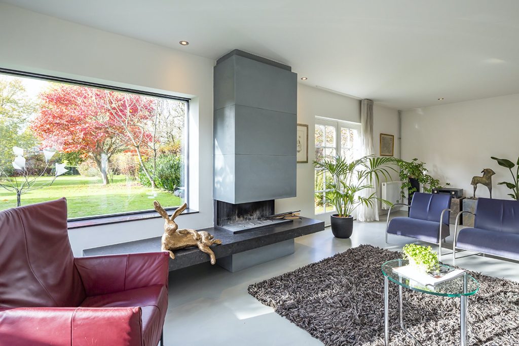 In het verlengde van de keuken is de woonkamer met open haard gesitueerd. De moderne uitstraling met grote ramen, hoekramen en openslaande deuren zorgen, met de karakteristieke voorgevel in gedachten, voor een groot verrassingseffect. Ook in dit deel van de woning is een toiletruimte, te bereiken via een portaal.