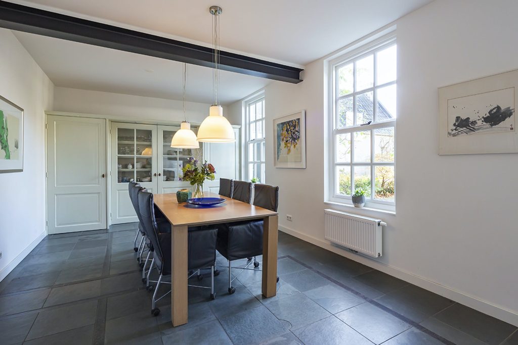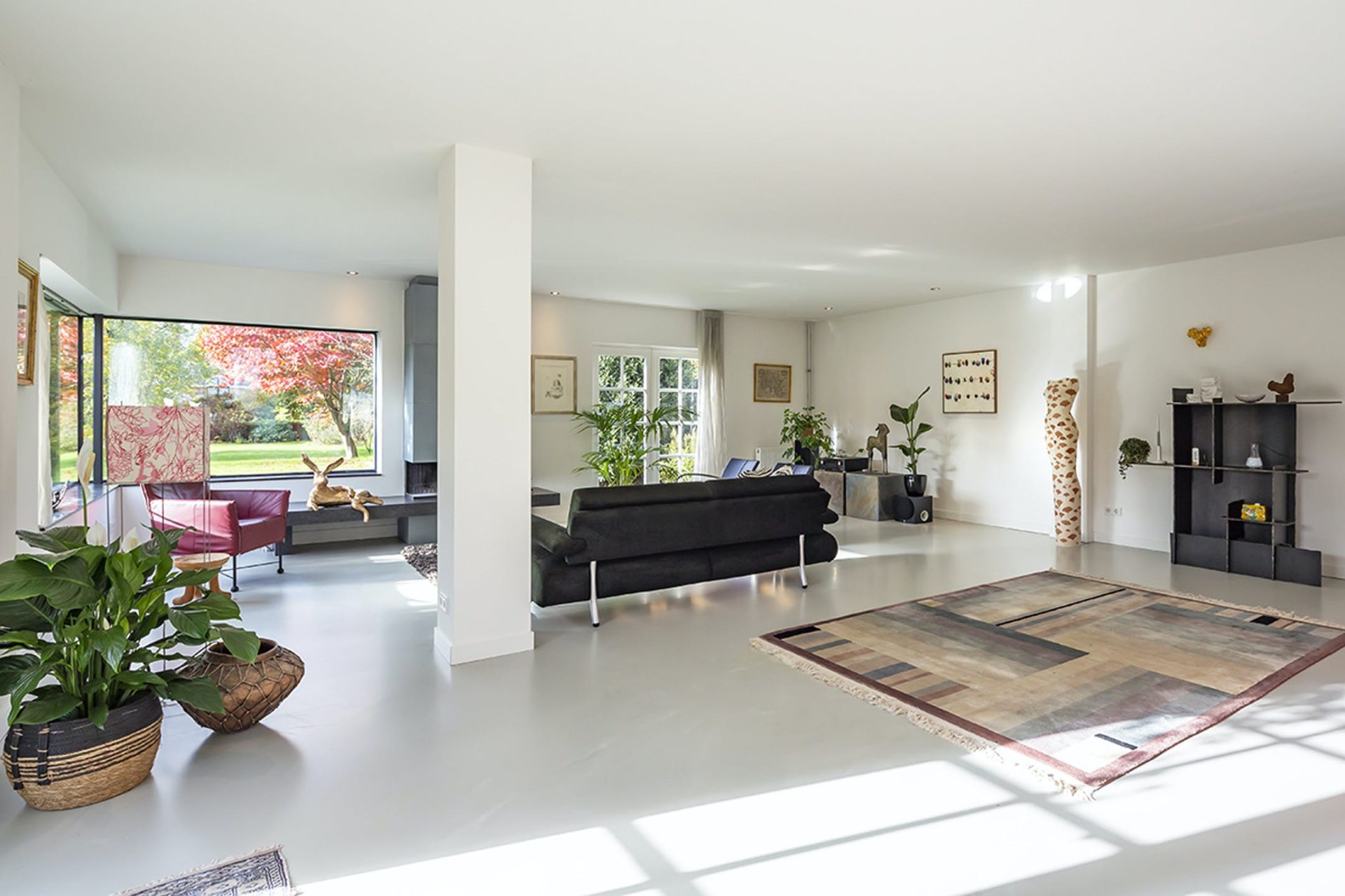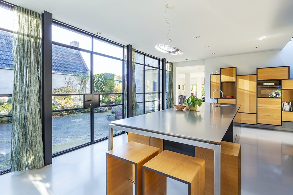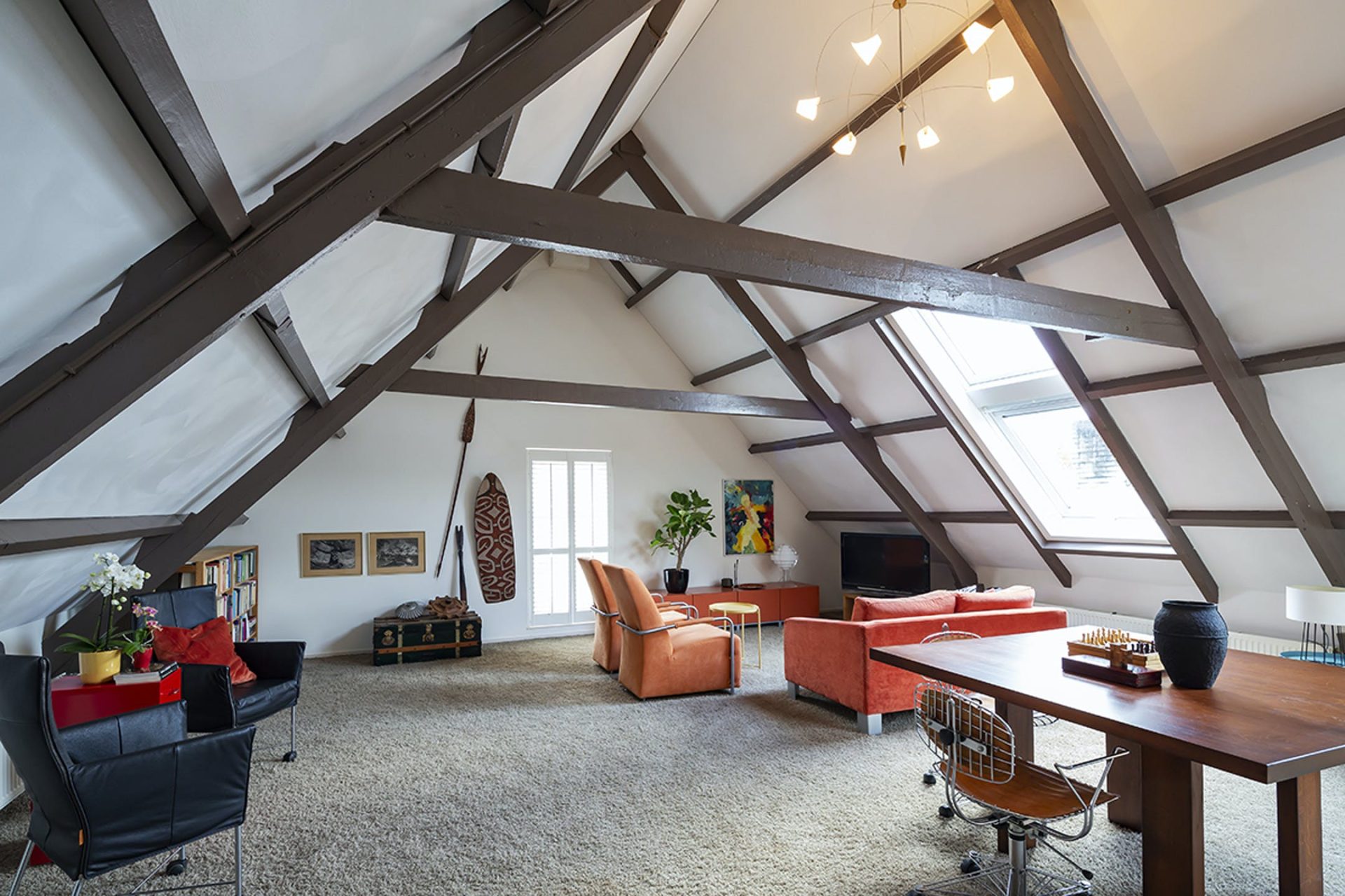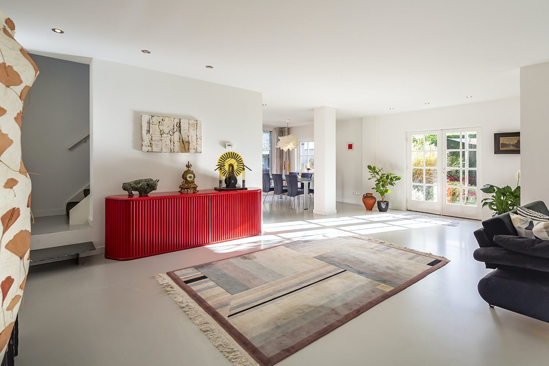 In het verlengde van de keuken is de woonkamer met open haard gesitueerd. De moderne uitstraling met grote ramen, hoekramen en openslaande deuren zorgen, met de karakteristieke voorgevel in gedachten, voor een groot verrassingseffect. Ook in dit deel van de woning is een toiletruimte, te bereiken via een portaal.