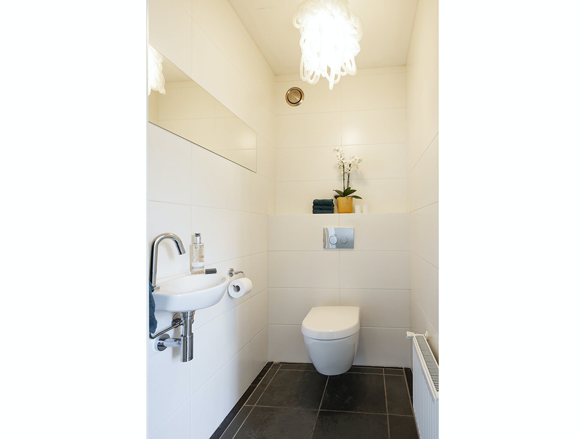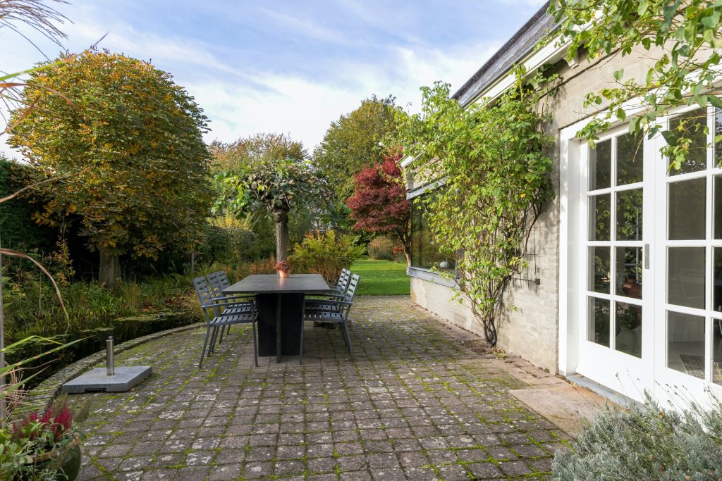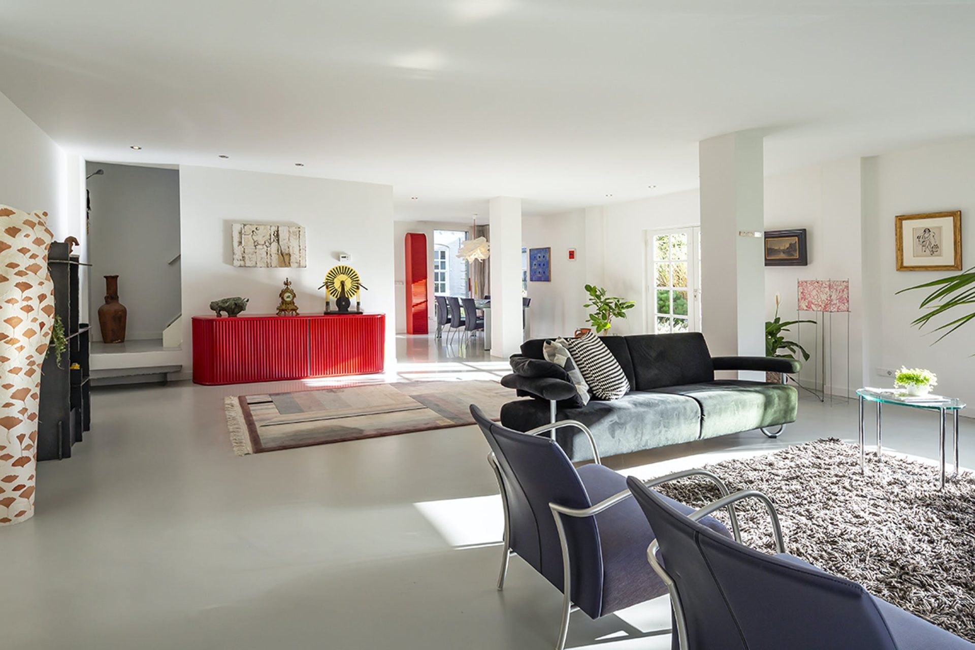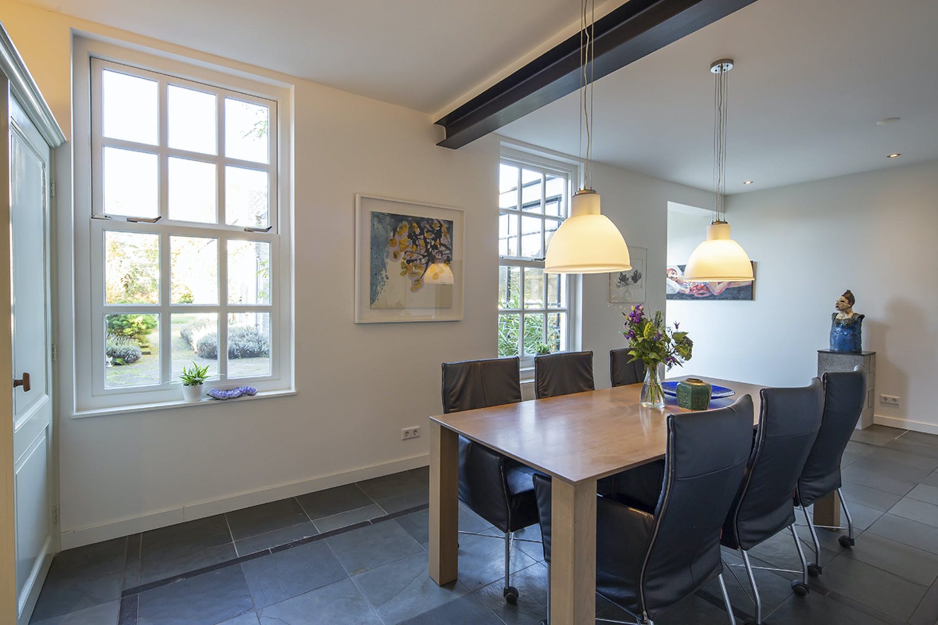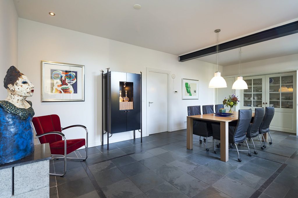 In het verlengde van de keuken is de woonkamer met open haard gesitueerd. De moderne uitstraling met grote ramen, hoekramen en openslaande deuren zorgen, met de karakteristieke voorgevel in gedachten, voor een groot verrassingseffect. Ook in dit deel van de woning is een toiletruimte, te bereiken via een portaal.