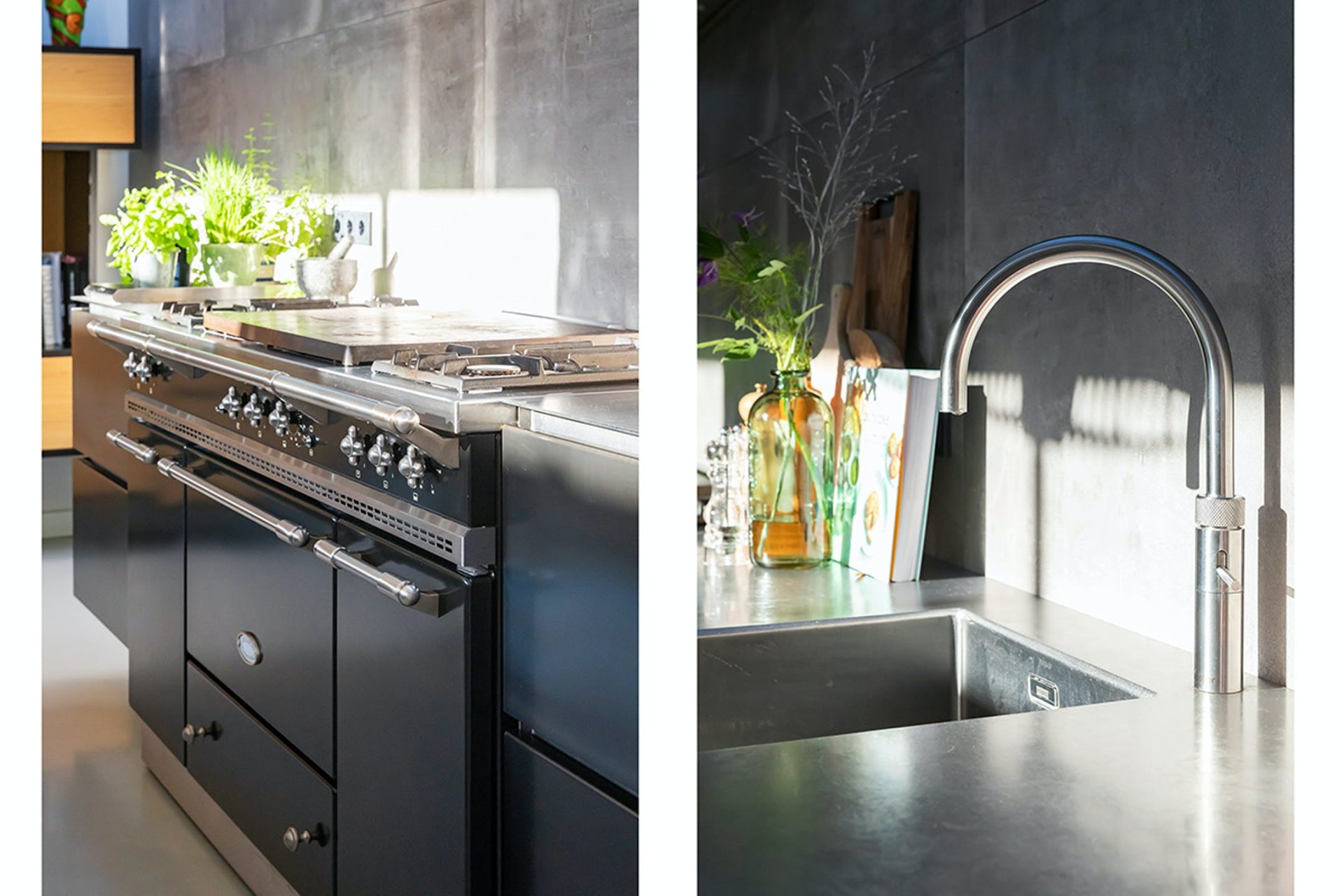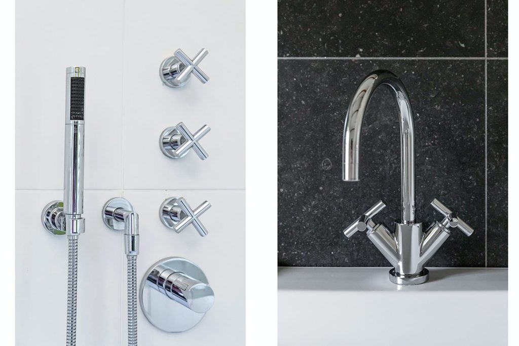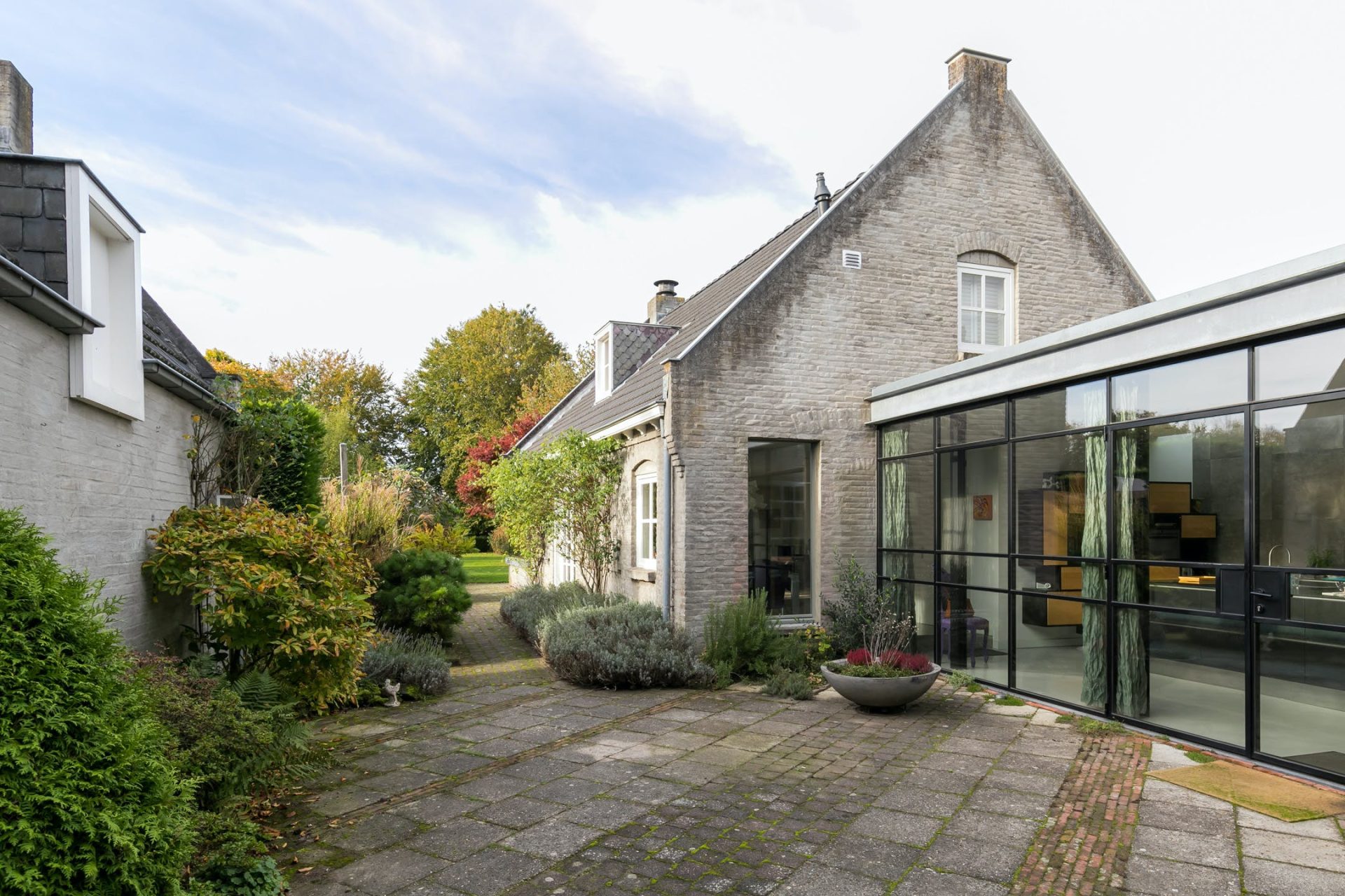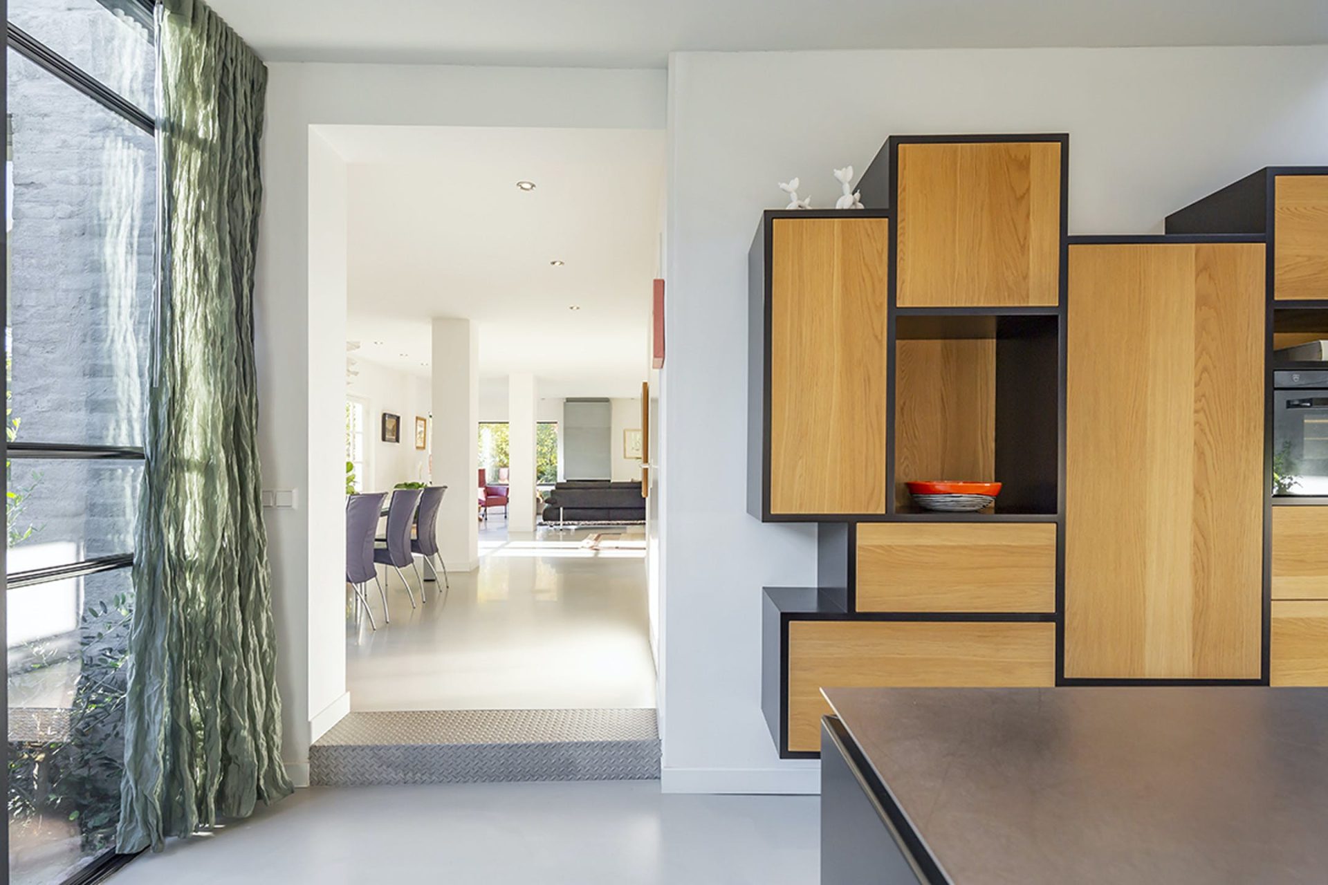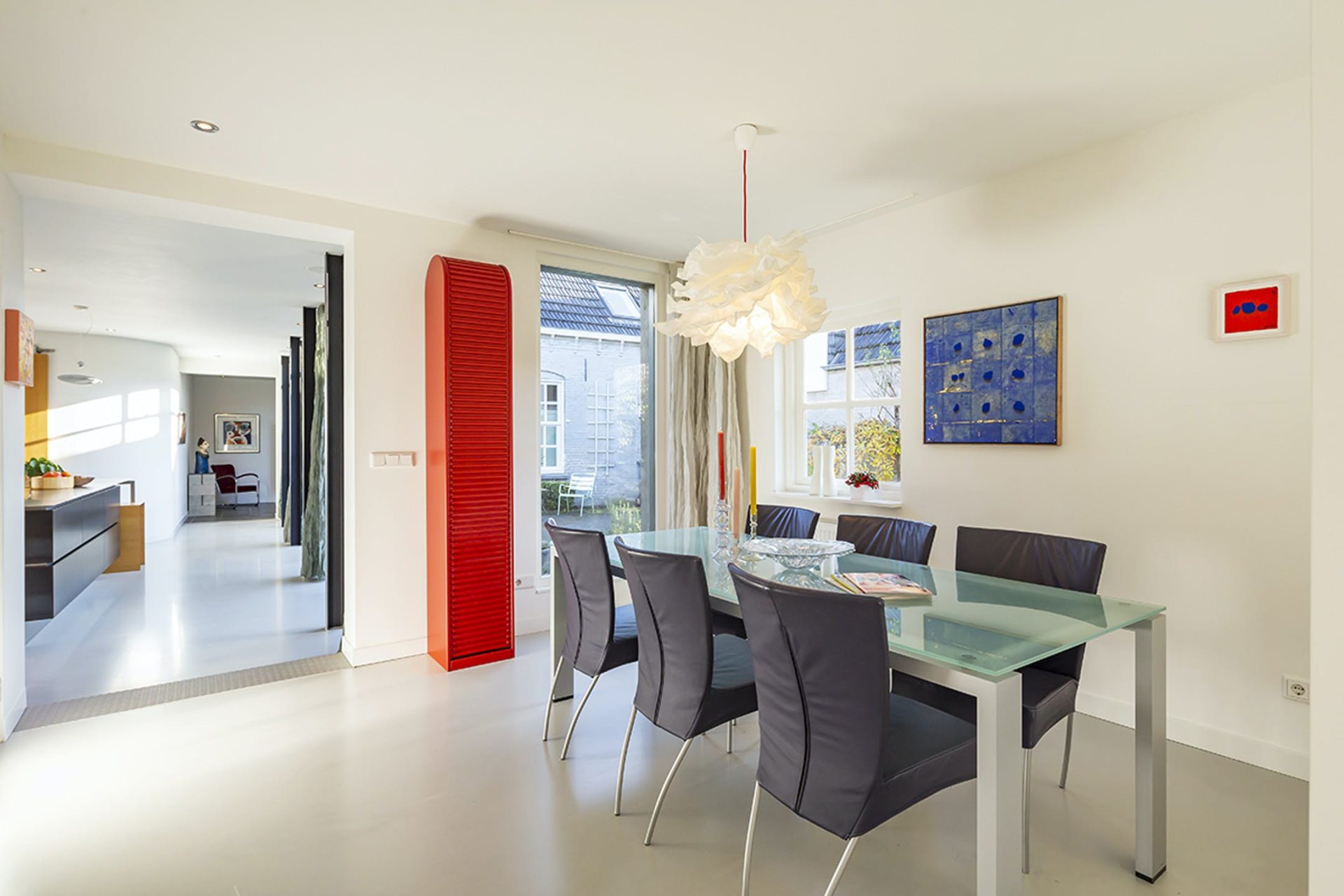 In het verlengde van de keuken is de woonkamer met open haard gesitueerd. De moderne uitstraling met grote ramen, hoekramen en openslaande deuren zorgen, met de karakteristieke voorgevel in gedachten, voor een groot verrassingseffect. Ook in dit deel van de woning is een toiletruimte, te bereiken via een portaal.