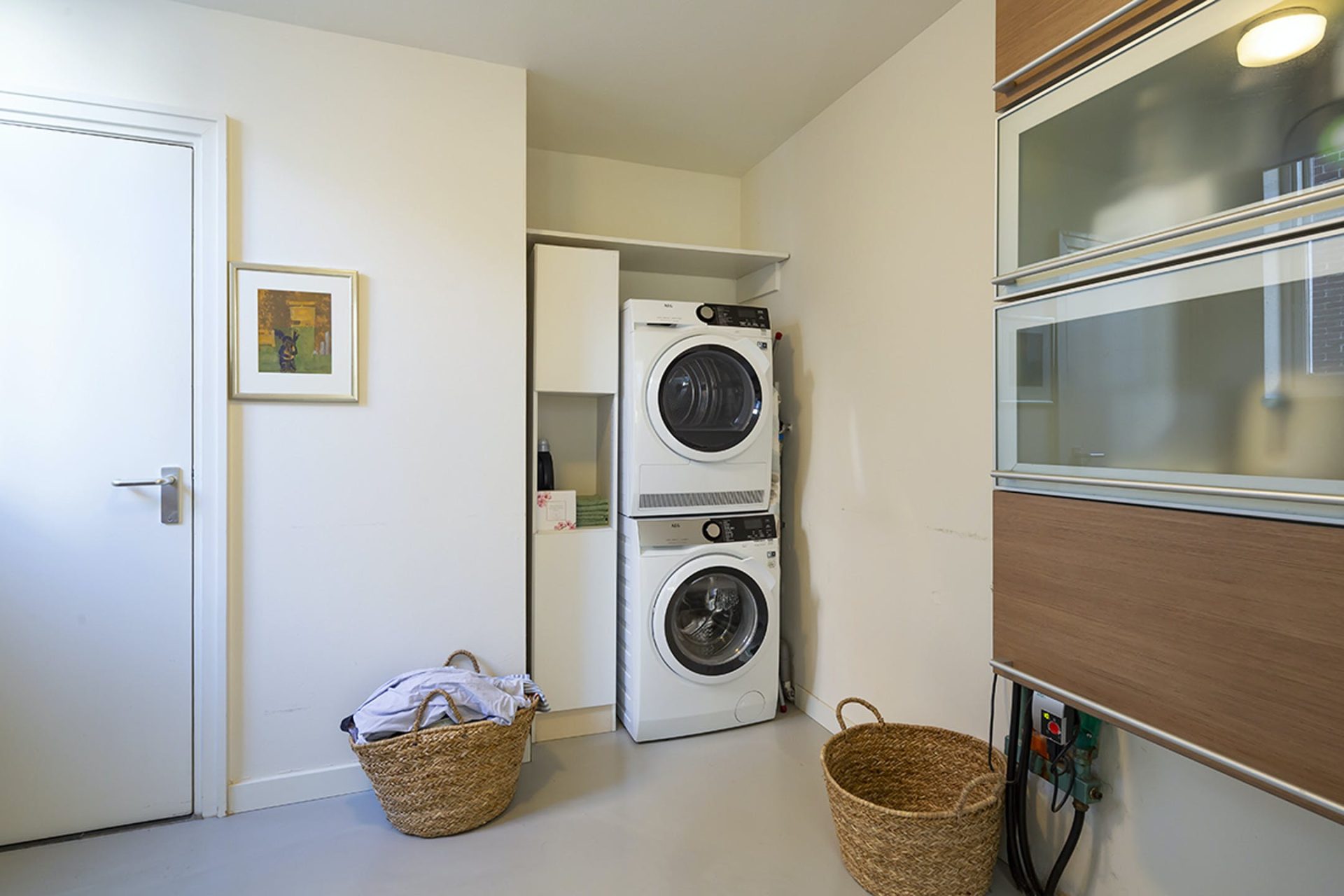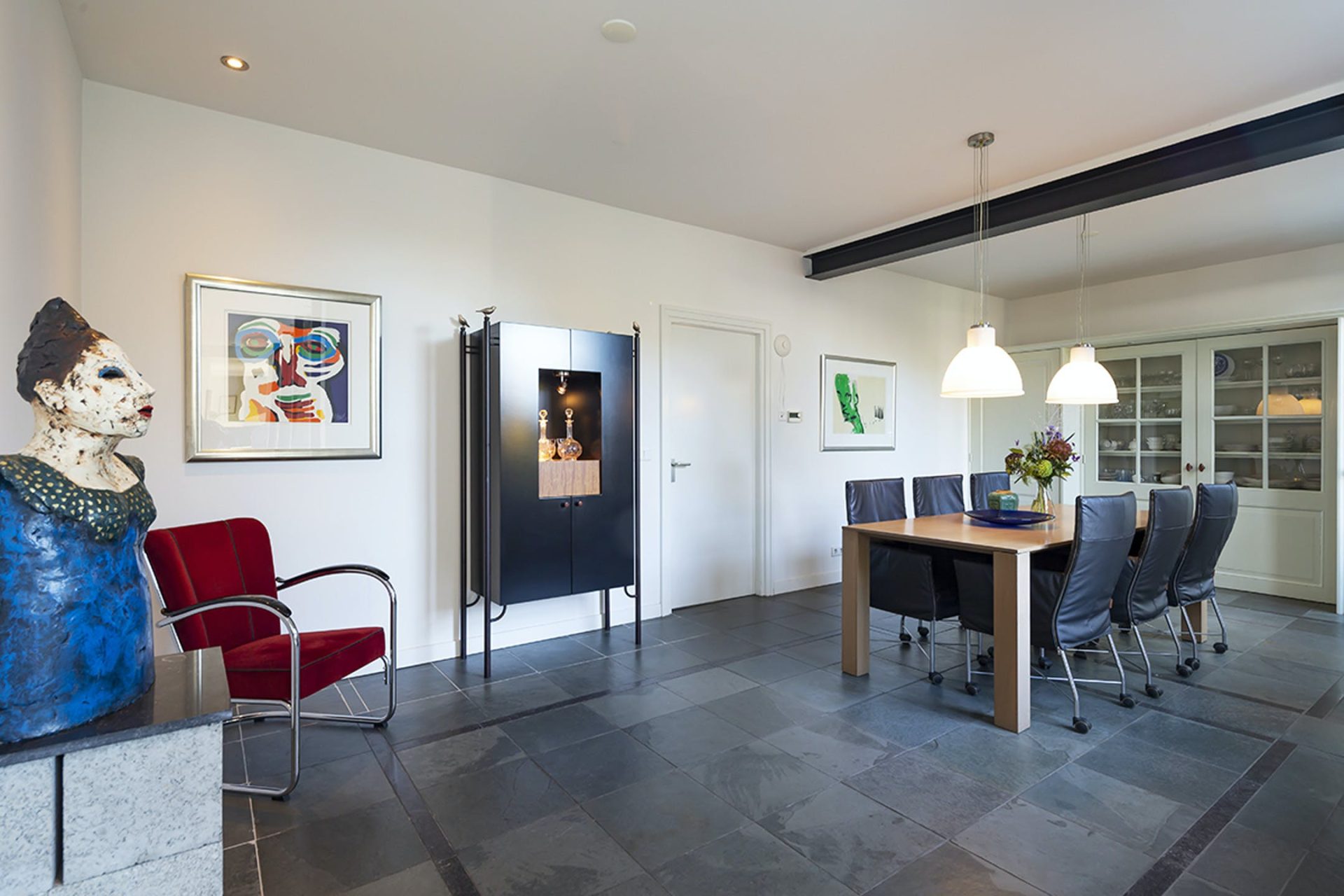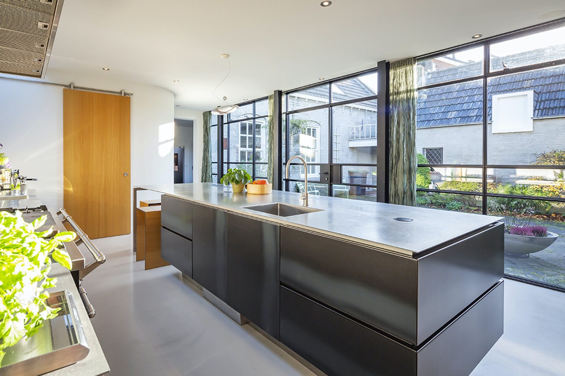 De eetkamer is een stijlvolle ruimte met op maat gemaakte kasten, voorzien van paneeldeuren in een mooie kleurstelling. Er is genoeg ruimte voor een grote eettafel waar u kunt dineren met fraai uitzicht naar de achtertuin. Een scherp contrast is de zeer moderne keuken met een lichtstraat, grote ramen en openslaande tuindeuren. Het grote eiland, de wandopstelling met stijlvol fornuis en de kastenwand trekken direct uw aandacht. Via een portaal is een bijkeuken/wasruimte bereikbaar. In de bijkeuken is een deur naar de wijn-/provisiekelder.