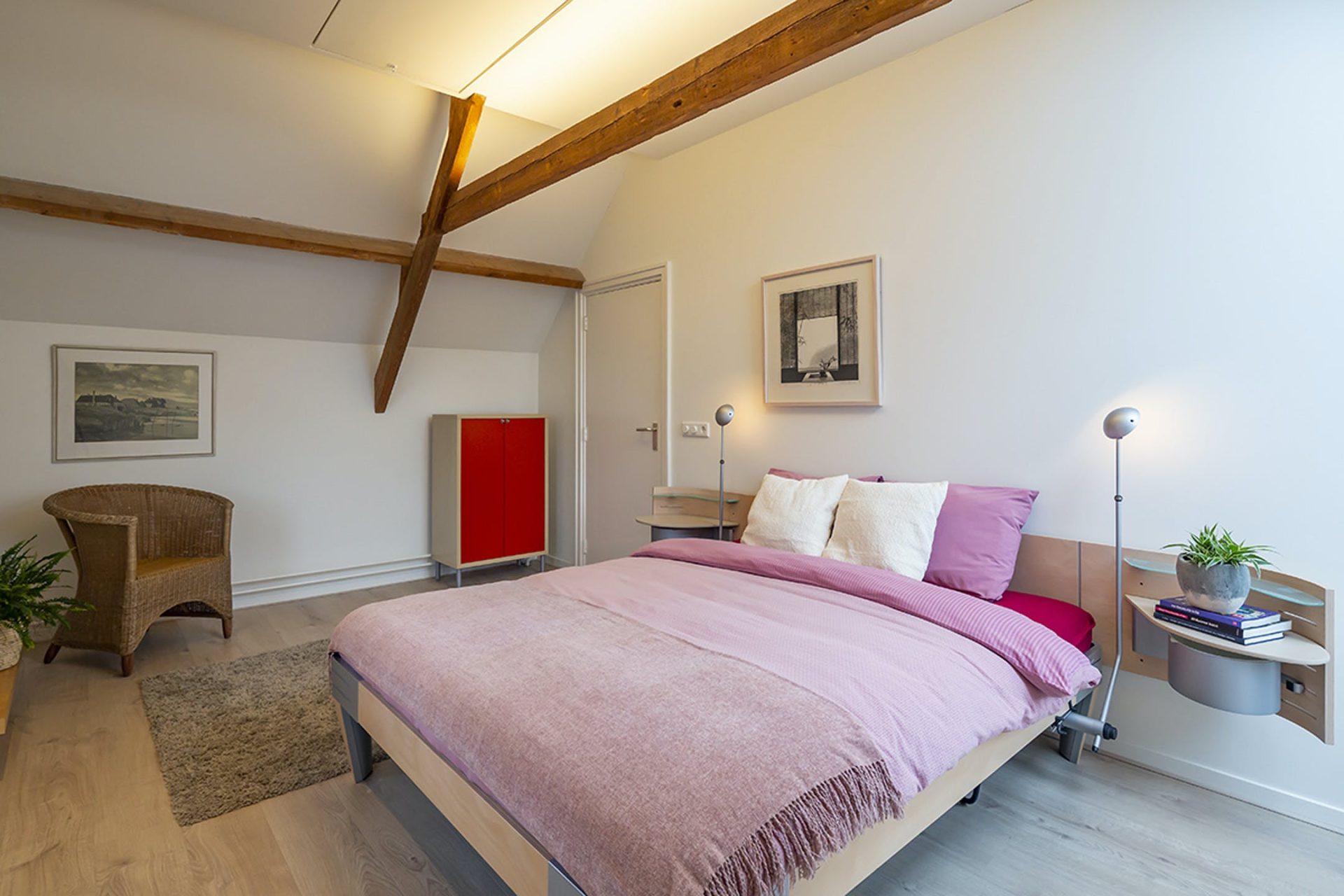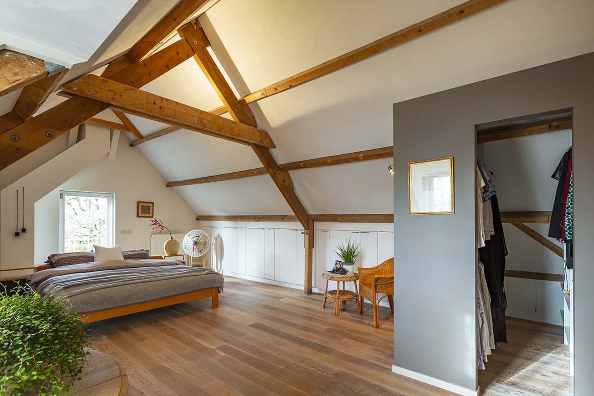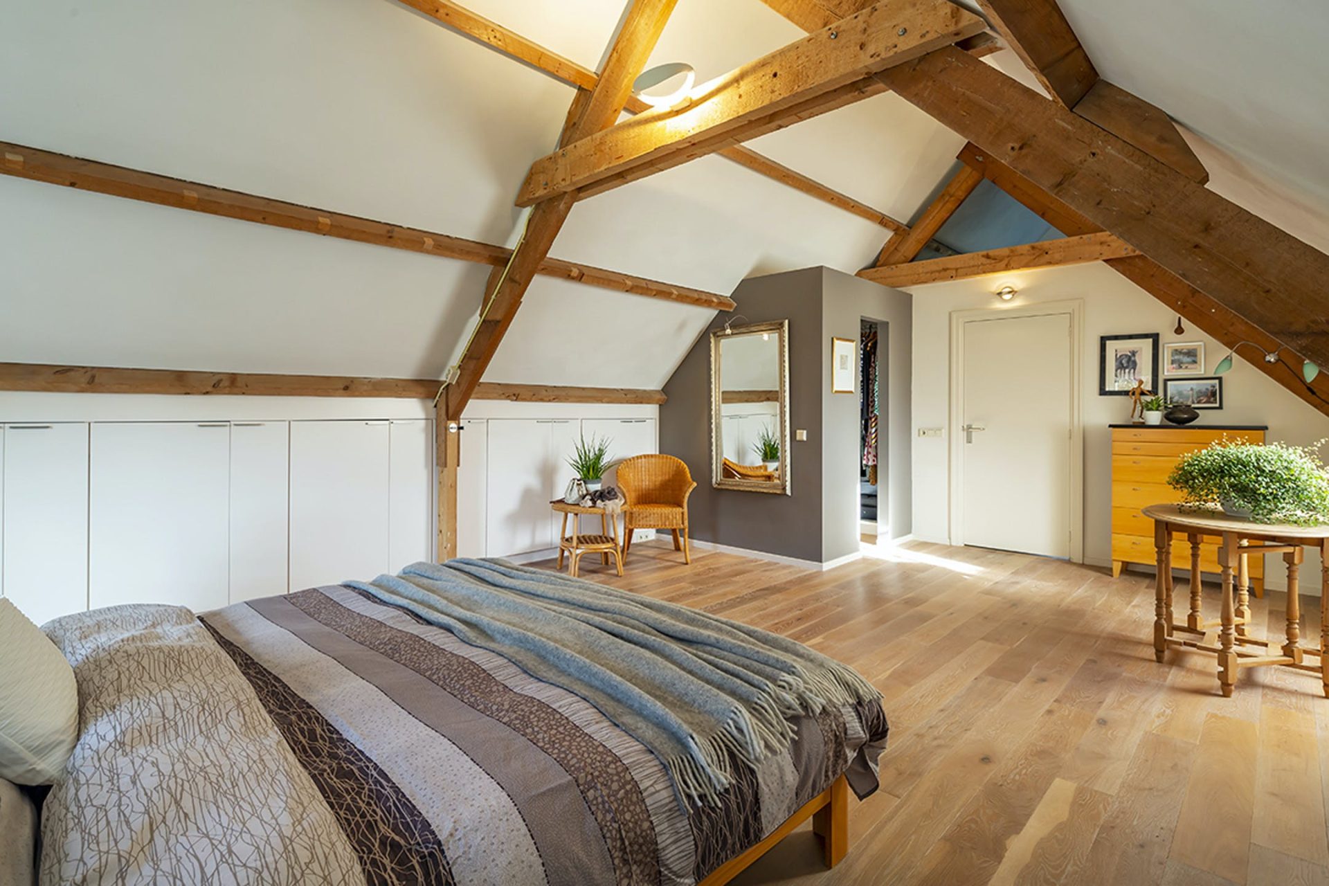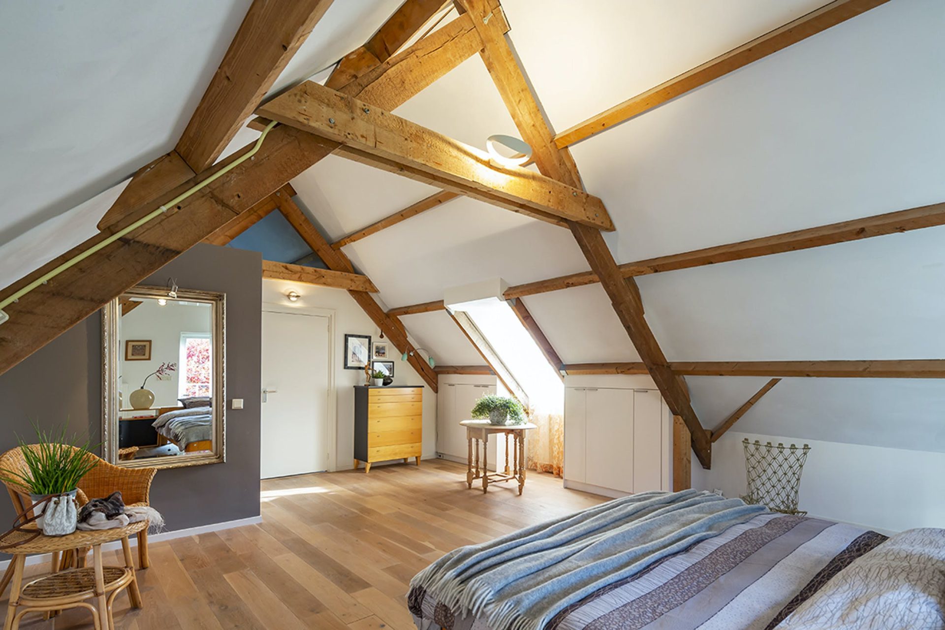 Volg de bordestrap naar de eerst verdieping van het achterhuis. Dit is de plek van een zeer ruime slaapkamer met een inloopkast en een eigen badkamer. De houten dakconstructie en houten vloer zorgen voor een aangename sfeer. De moderne designbadkamer is ingedeeld met een inloopdouche, toilet en een tweepersoons wastafel.