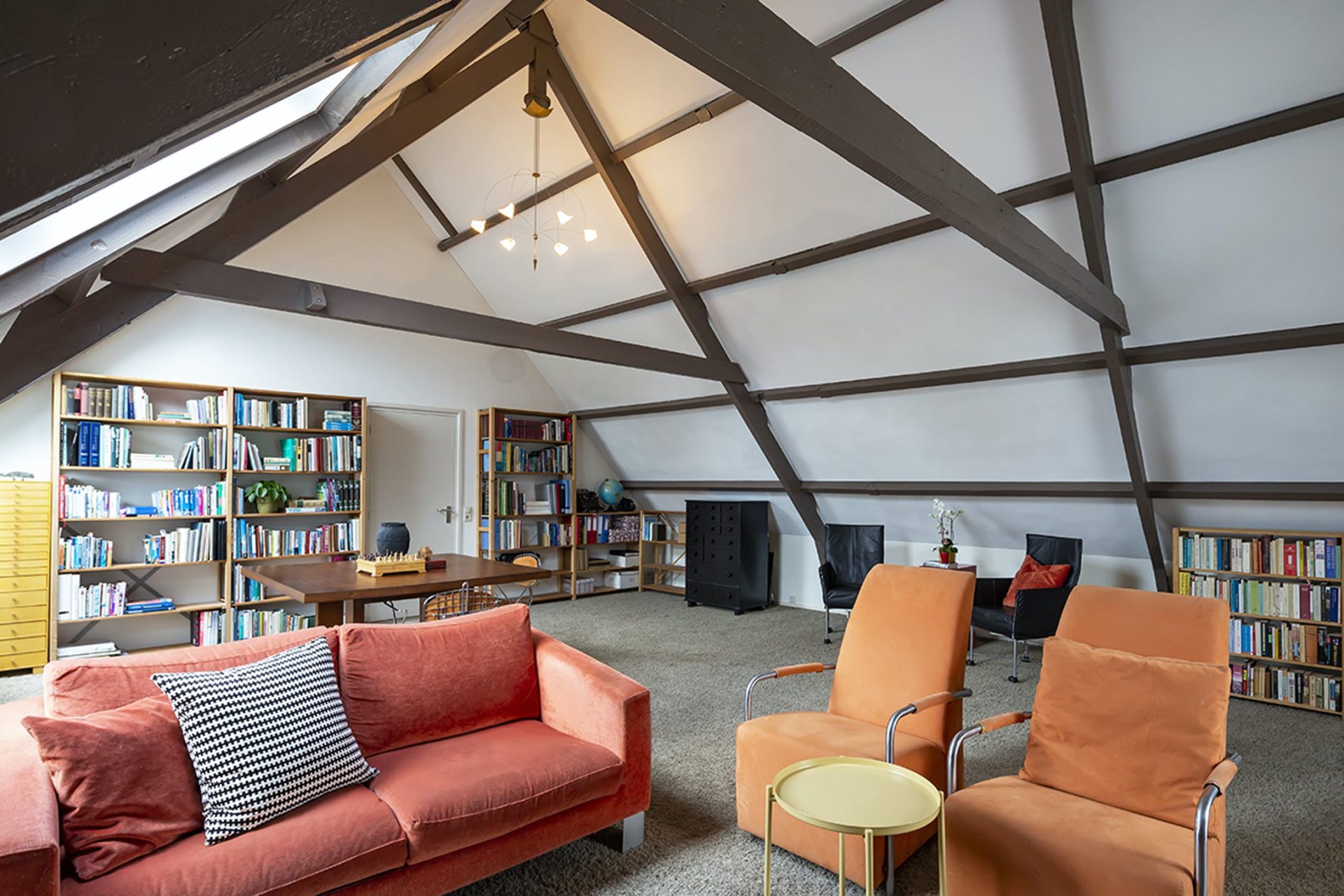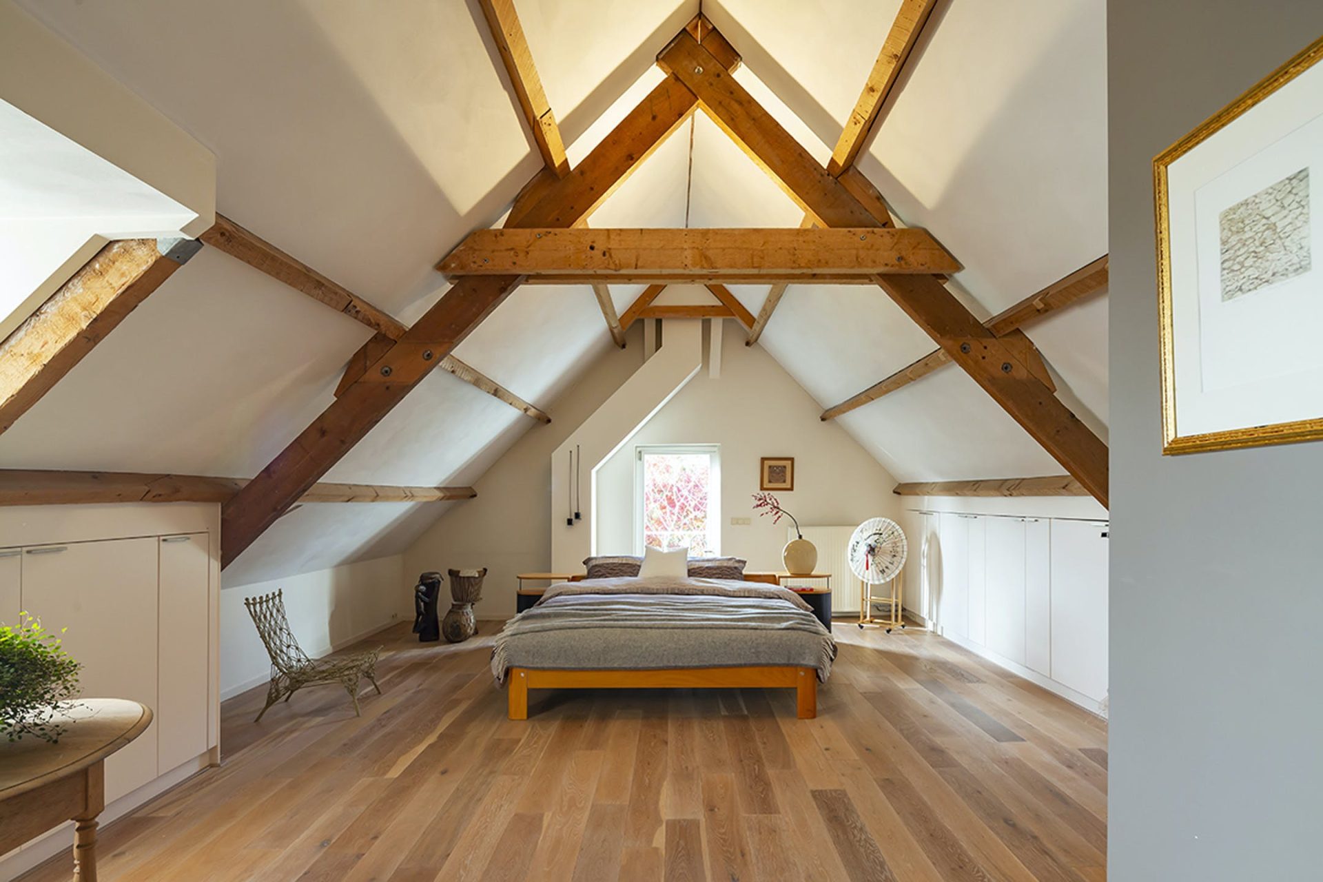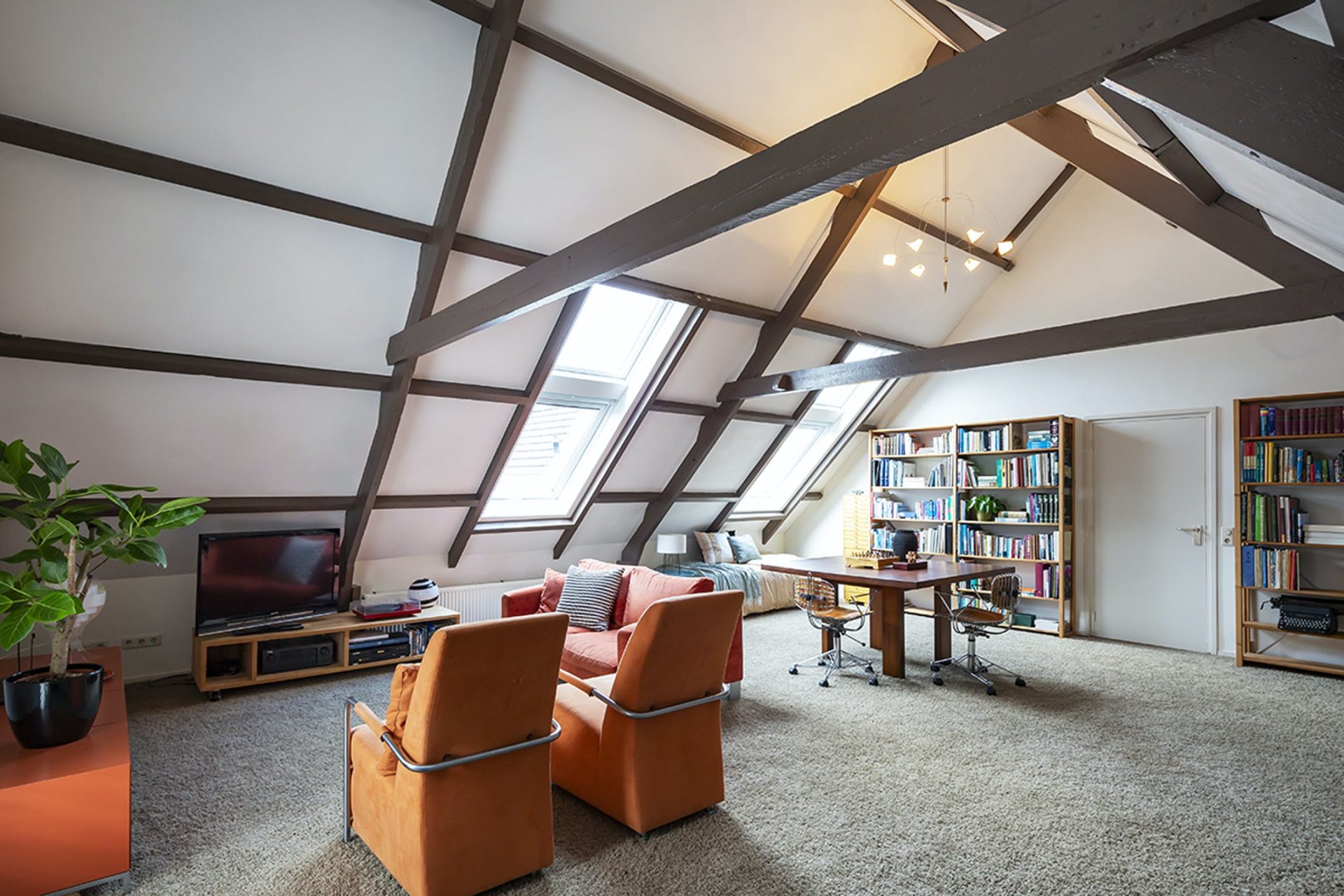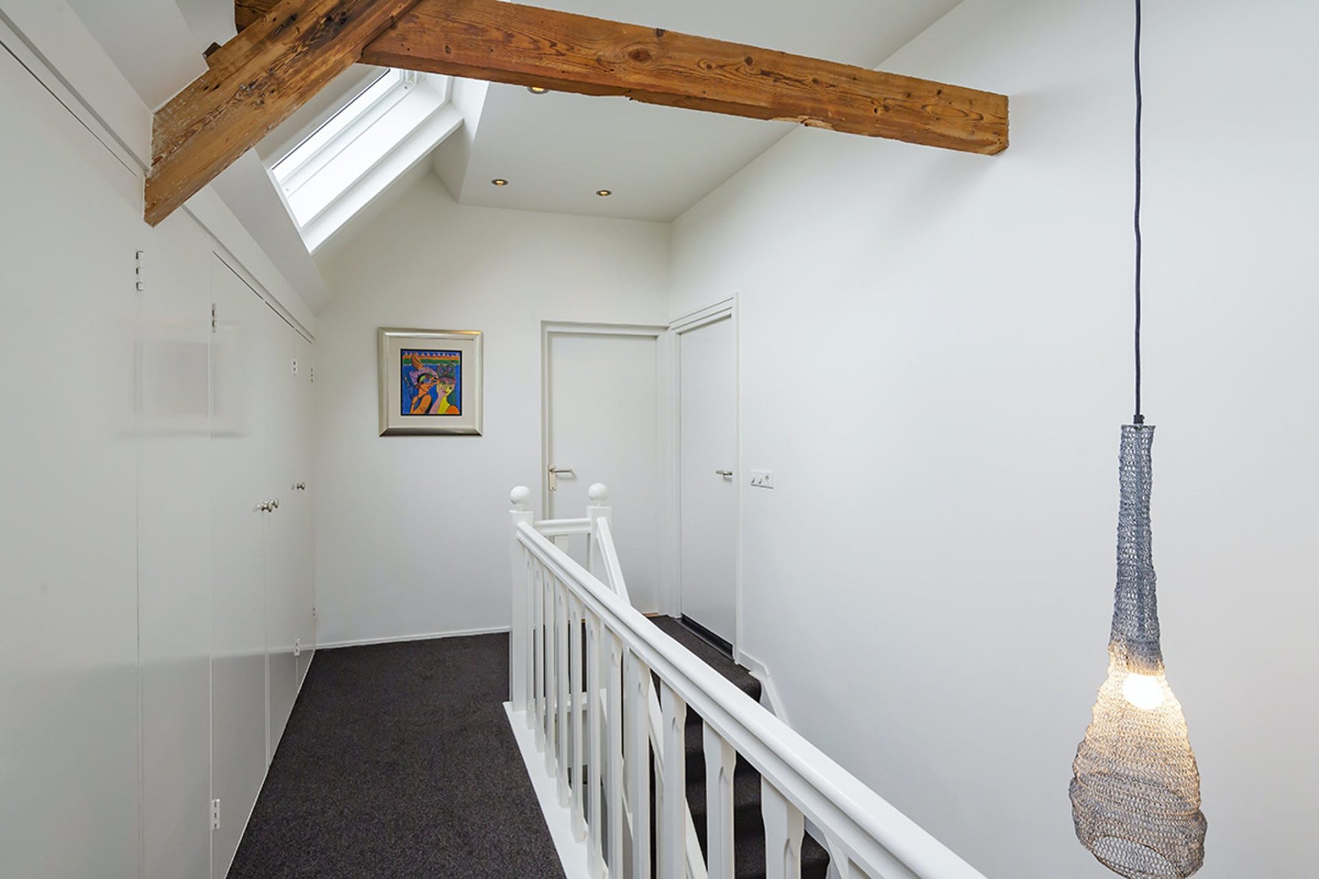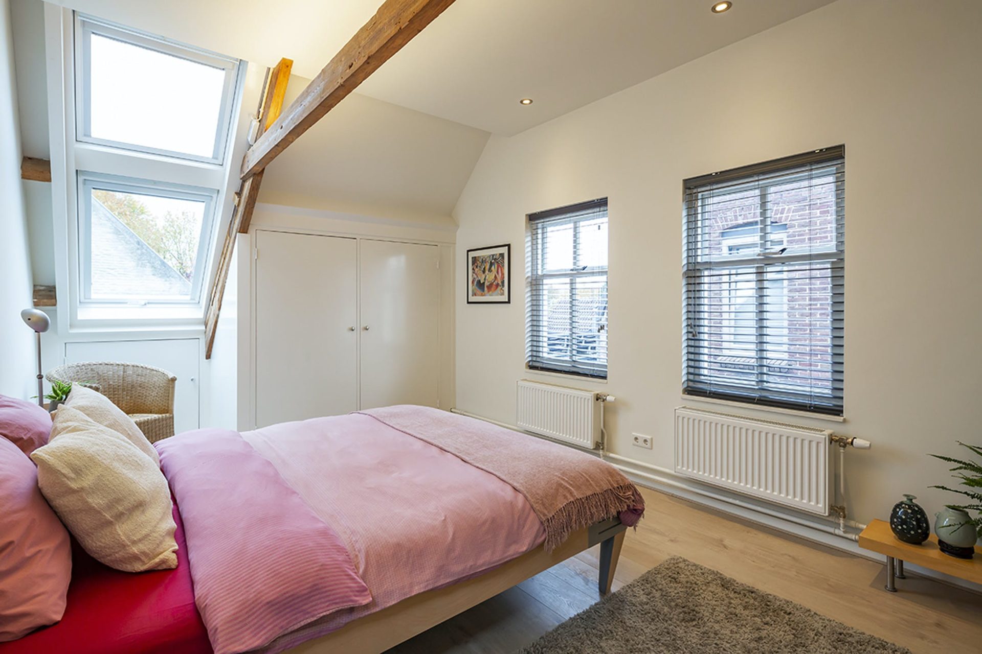Volg de bordestrap naar de eerst verdieping van het achterhuis. Dit is de plek van een zeer ruime slaapkamer met een inloopkast en een eigen badkamer. De houten dakconstructie en houten vloer zorgen voor een aangename sfeer. De moderne designbadkamer is ingedeeld met een inloopdouche, toilet en een tweepersoons wastafel.