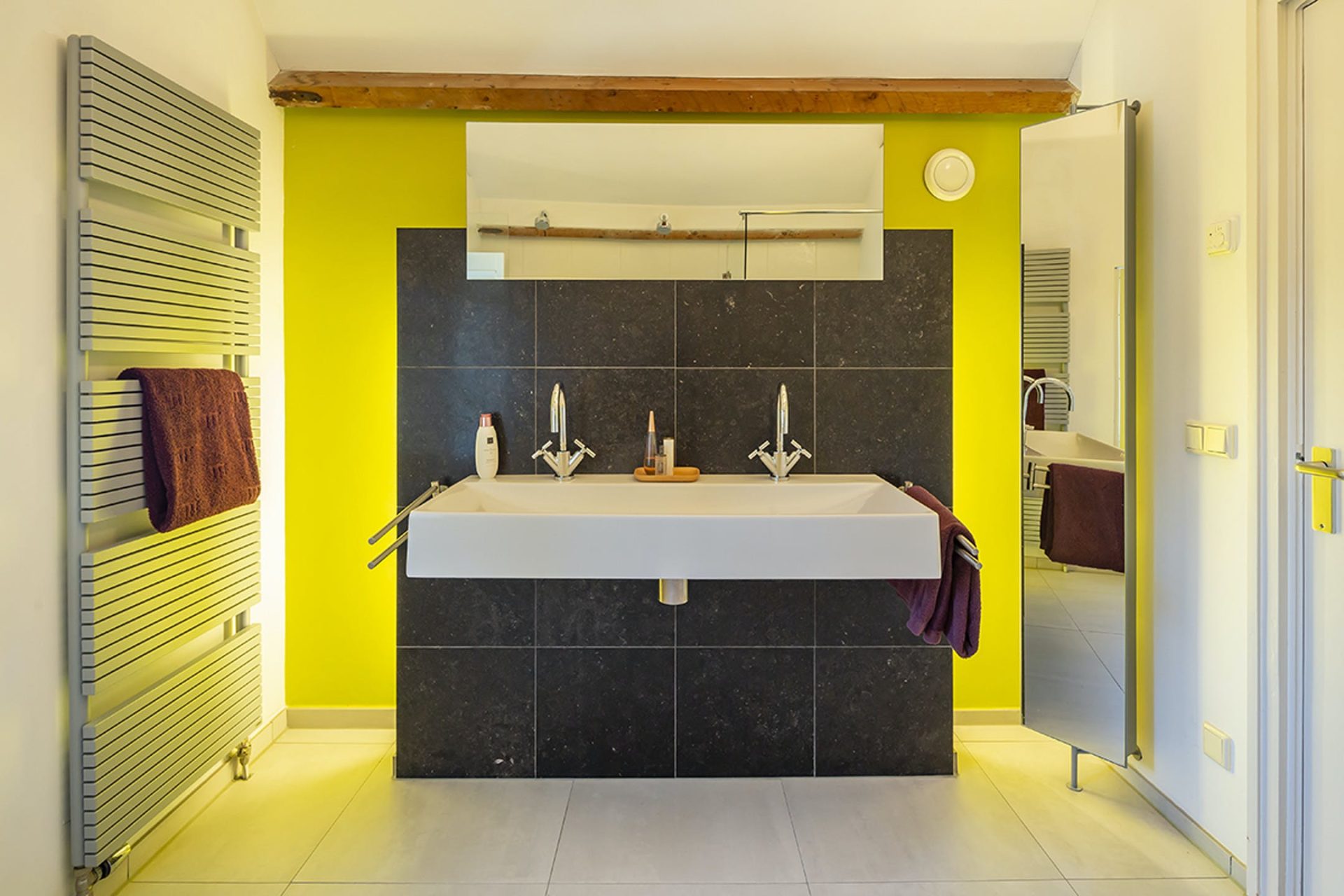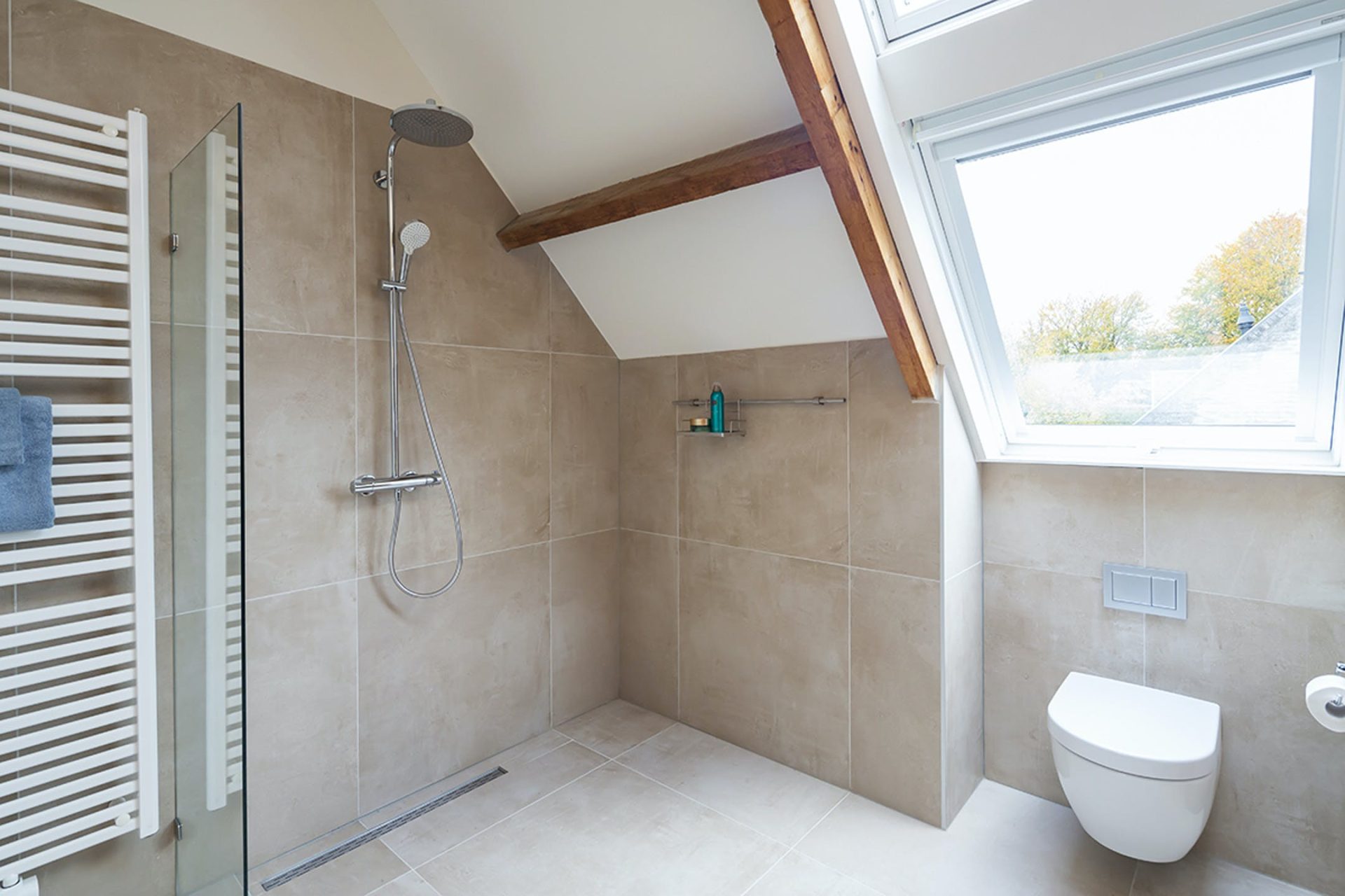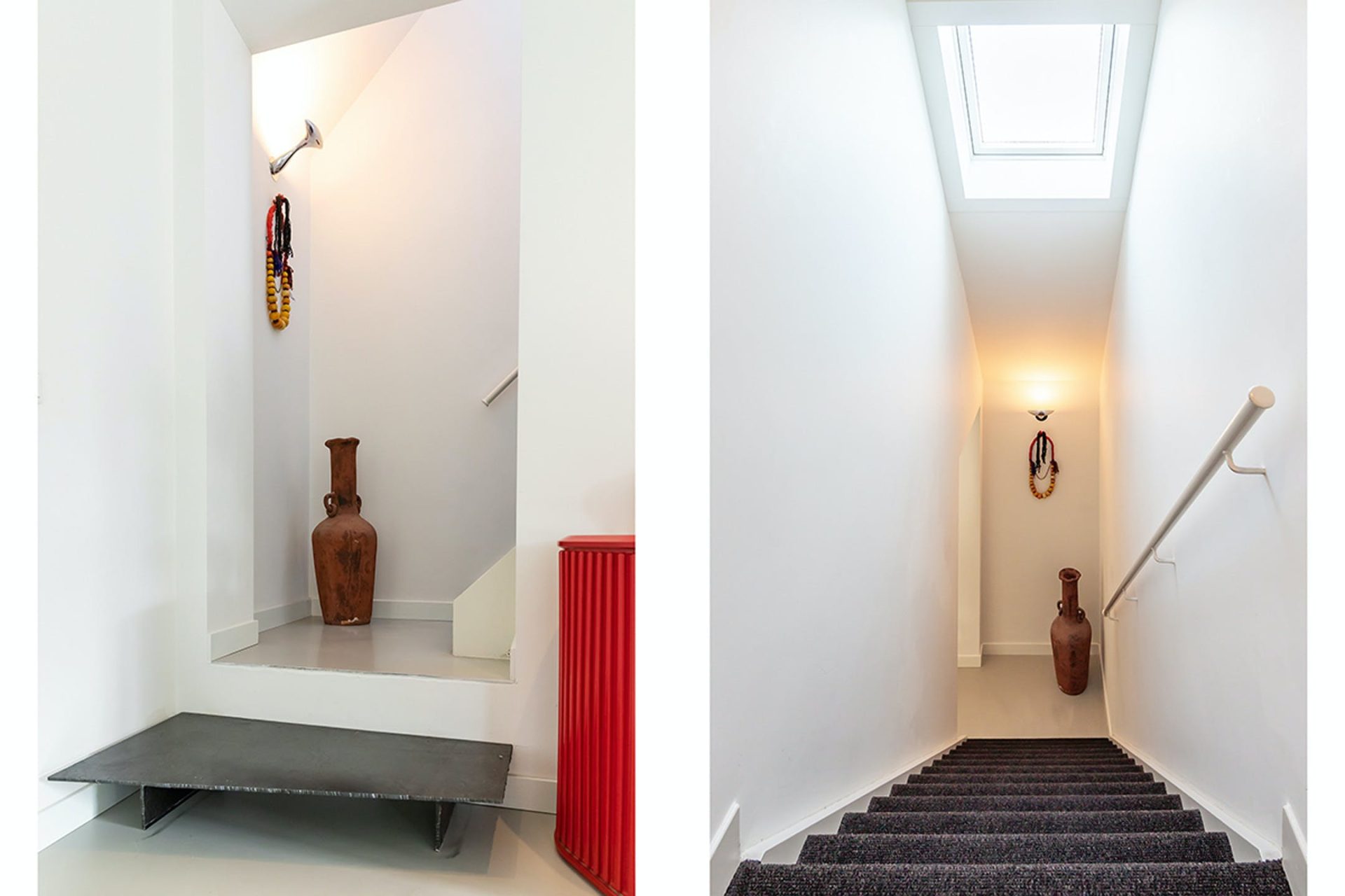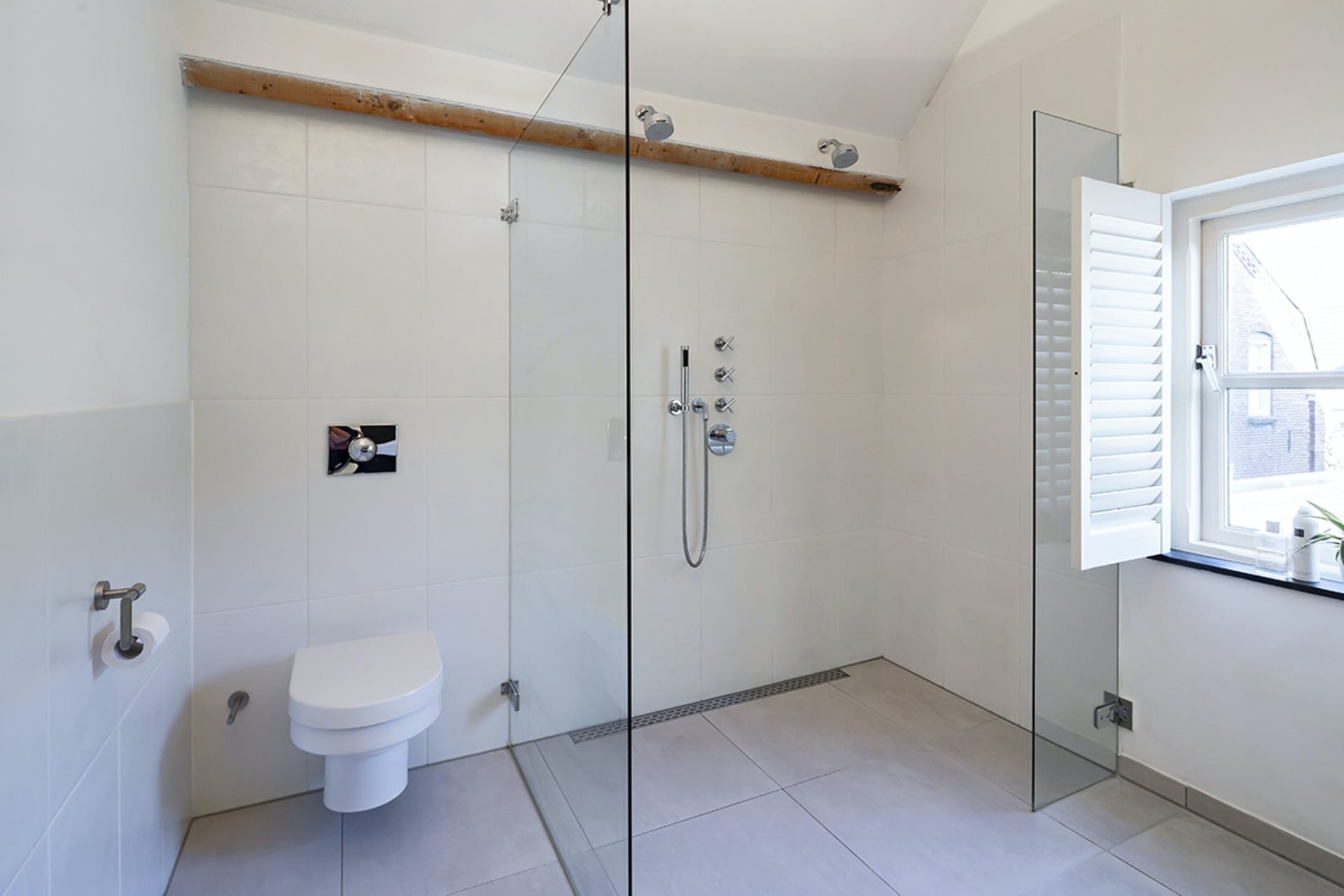 Volg de bordestrap naar de eerst verdieping van het achterhuis. Dit is de plek van een zeer ruime slaapkamer met een inloopkast en een eigen badkamer. De houten dakconstructie en houten vloer zorgen voor een aangename sfeer. De moderne designbadkamer is ingedeeld met een inloopdouche, toilet en een tweepersoons wastafel.
