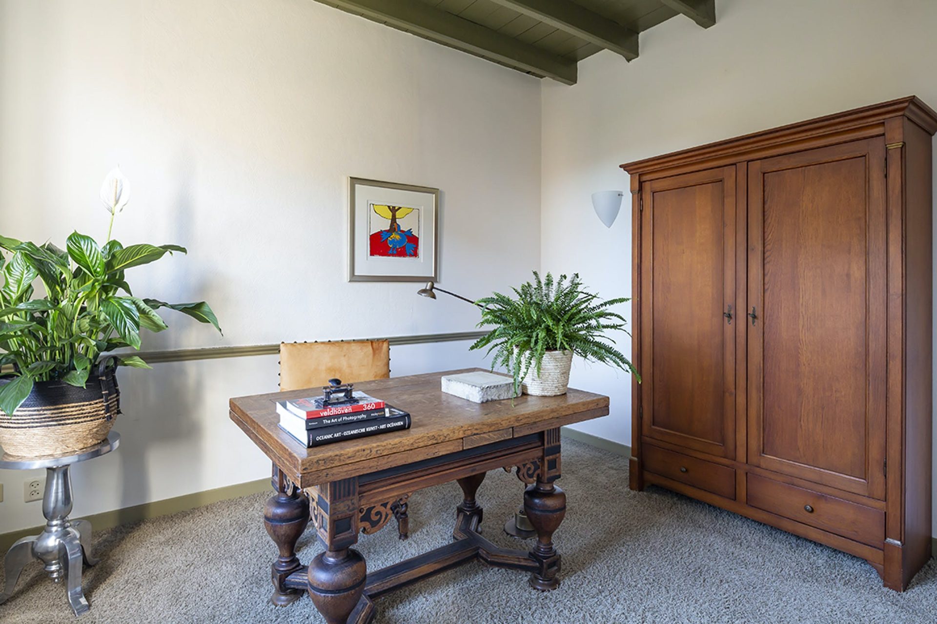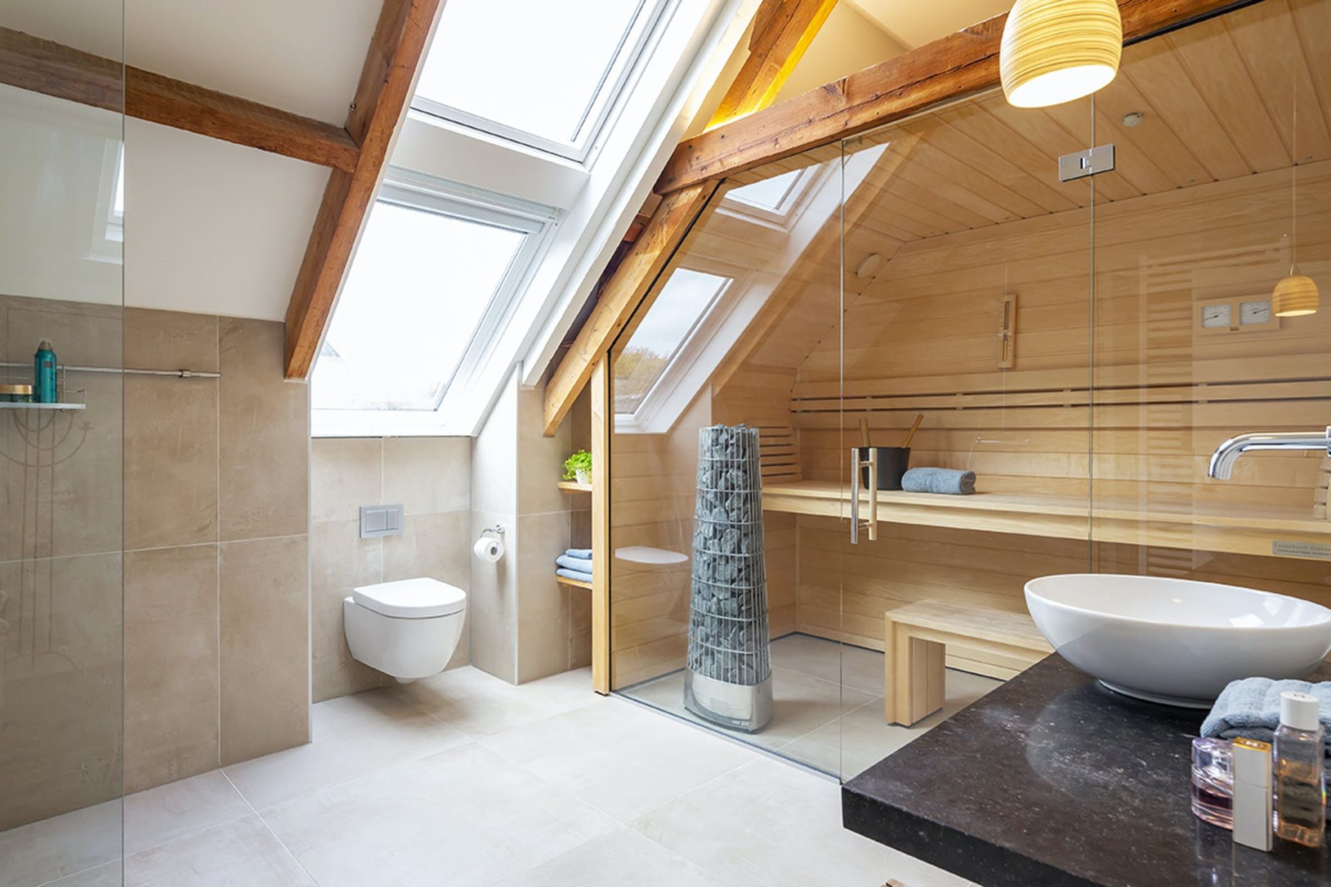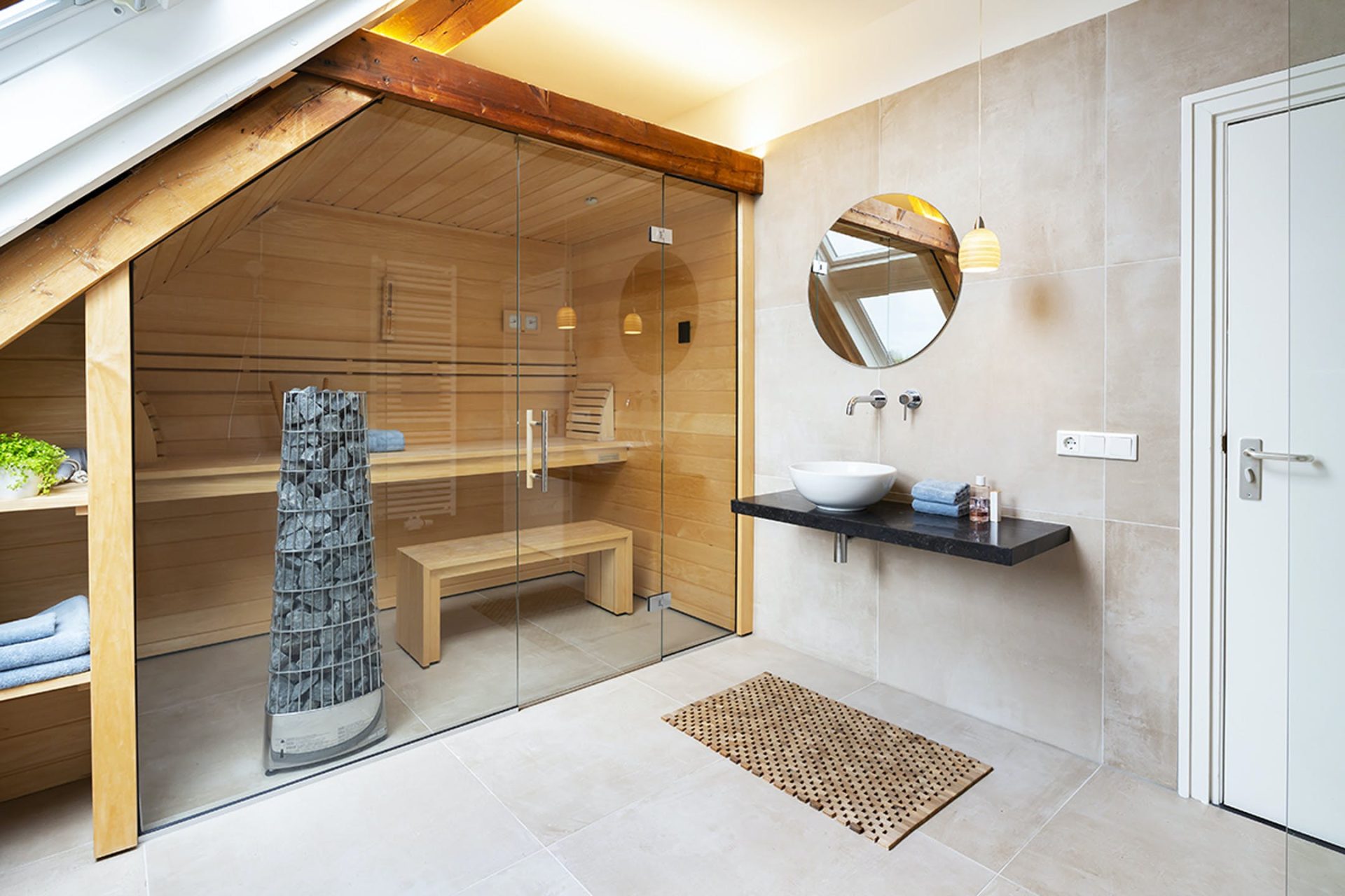 In de hal is een moderne trap naar de eerste verdieping van het voorhuis. Vanaf de overloop zijn twee slaapkamers en een badkamer te bereiken. De grootste slaapkamer wordt nu als werkkamer (multifunctionele ruimte) gebruikt. De mogelijk is hier om twee kamers te creëren. De tweede kamer is ingedeeld als gastenkamer. In de badkamer ziet u een meerpersoons sauna, inloopdouche, toilet en een wastafel op een hardstenen blad.