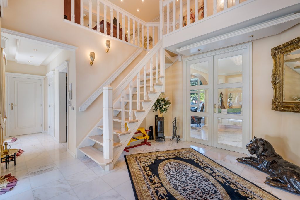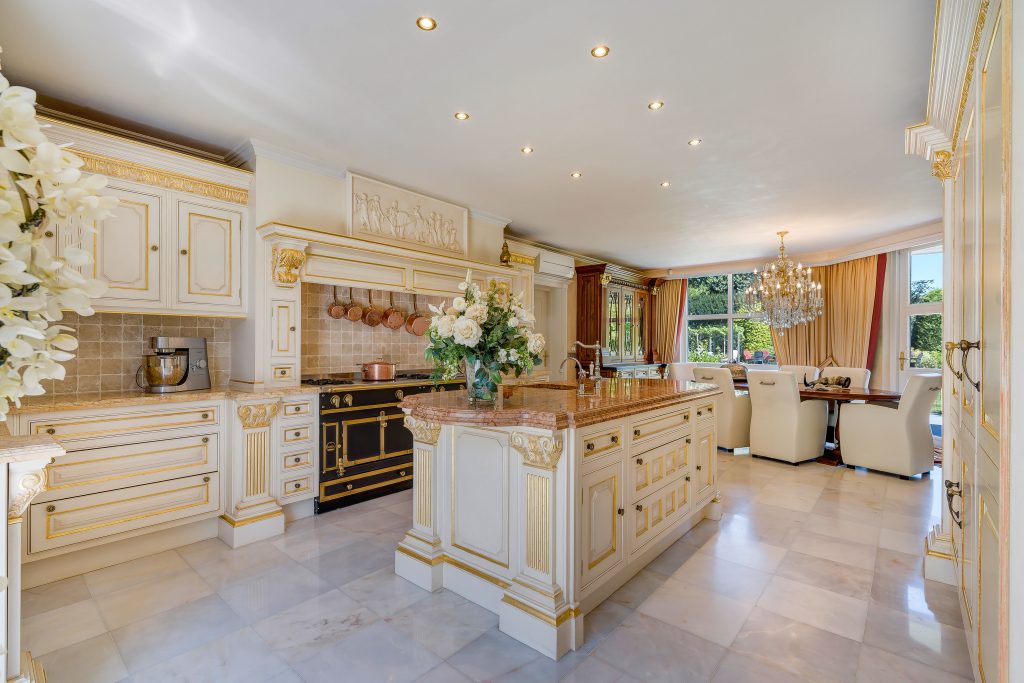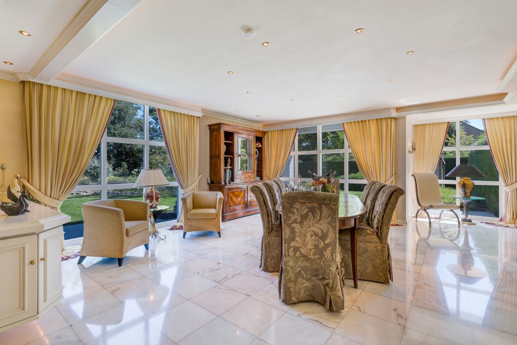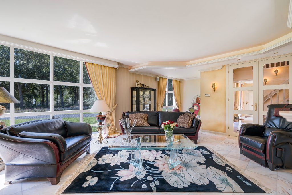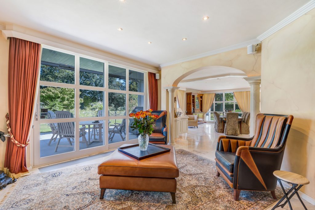 Bij binnenkomst valt de royale ontvangsthal op, afgewerkt met Portugese ‘Arosa’ marmeren vloeren die doorlopen in de woonkamer en leefkeuken. De woonkamer biedt meerdere zitgedeeltes en een sfeervolle doorkijkhaard die het geheel een warme uitstraling geeft. De royale leefkeuken, ontworpen door het Britse ‘Clive Christian Furniture’, is een droom voor kookliefhebbers. Het beschikt over een spoeleiland, een groot fornuis met gaspitten en een stoomoven, en is volledig uitgerust met hoogwaardige inbouwapparatuur. Door de openslaande deuren naar de tuin lopen binnen en buiten vloeiend in elkaar over.