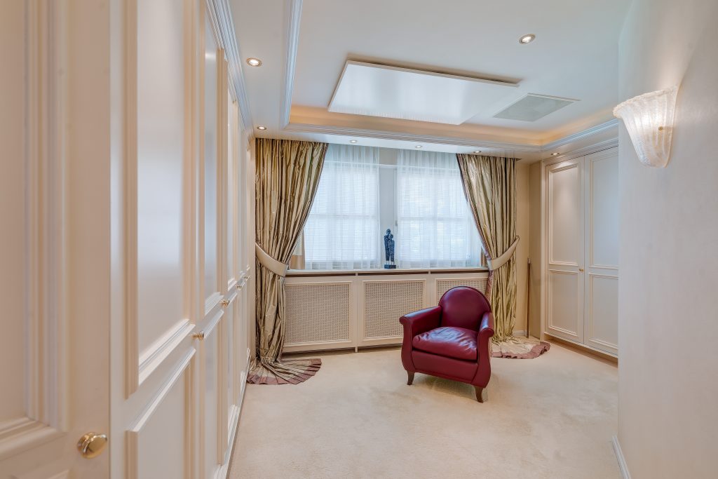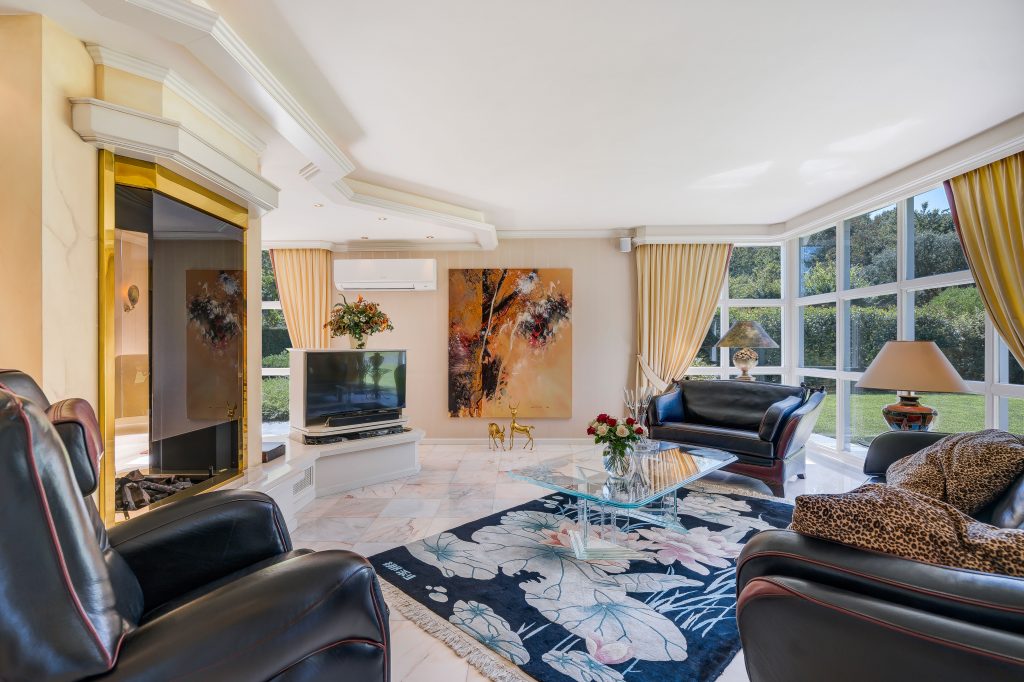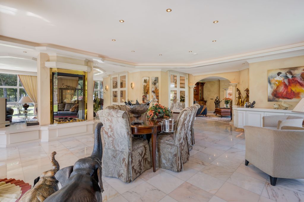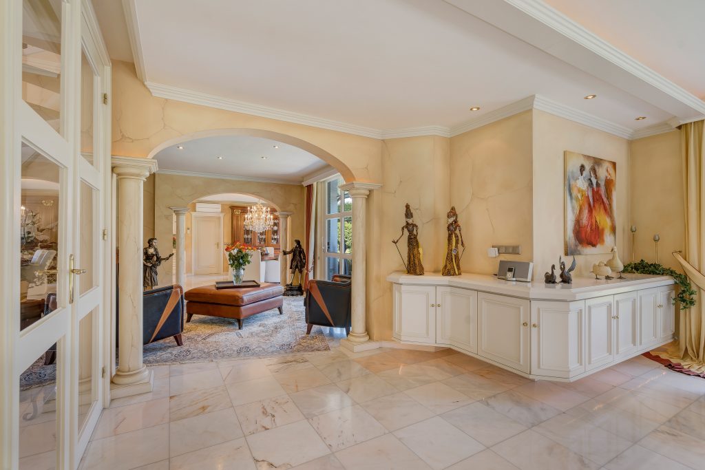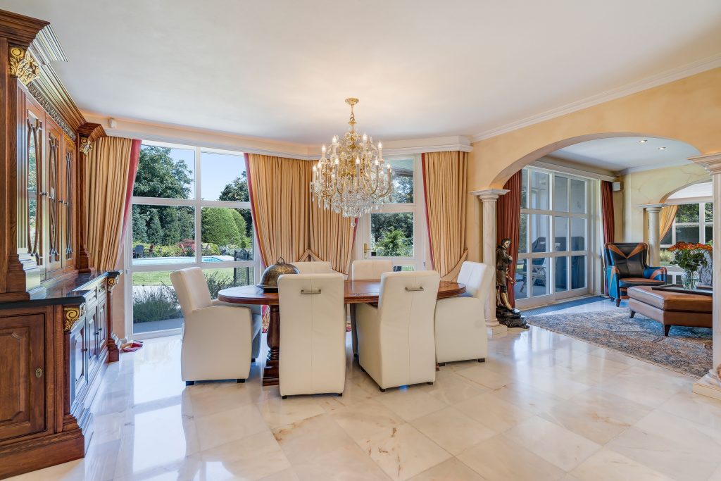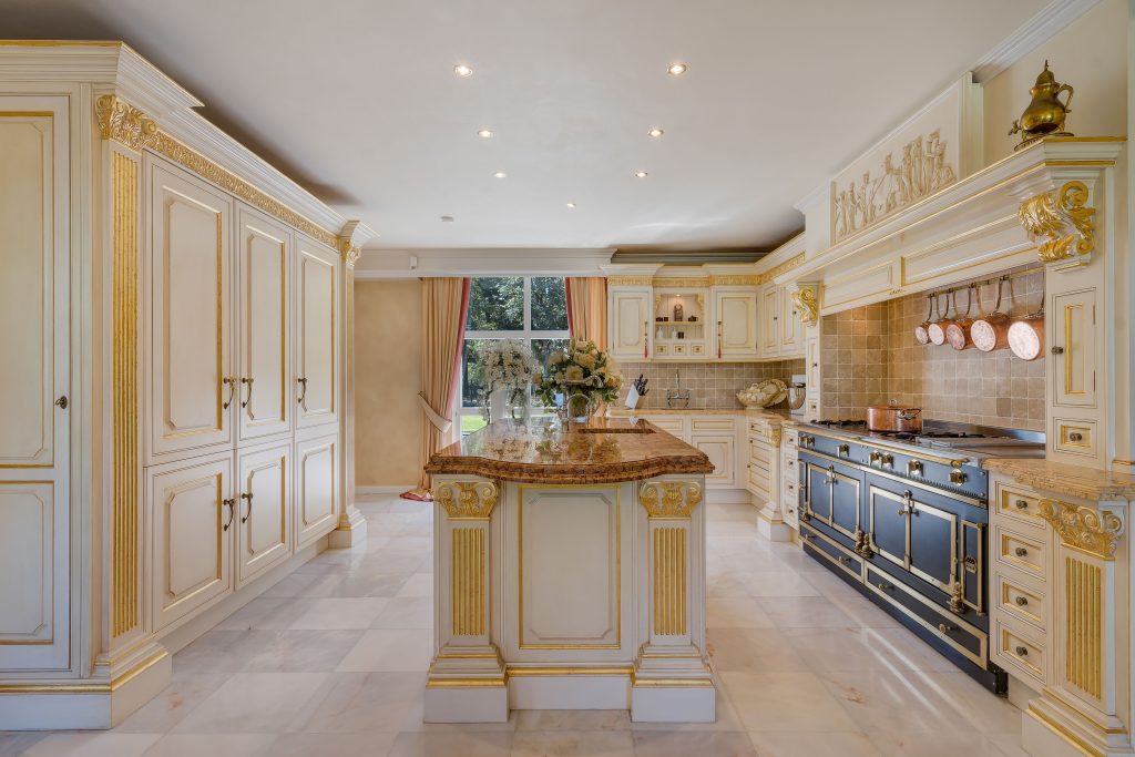 Bij binnenkomst valt de royale ontvangsthal op, afgewerkt met Portugese ‘Arosa’ marmeren vloeren die doorlopen in de woonkamer en leefkeuken. De woonkamer biedt meerdere zitgedeeltes en een sfeervolle doorkijkhaard die het geheel een warme uitstraling geeft. De royale leefkeuken, ontworpen door het Britse ‘Clive Christian Furniture’, is een droom voor kookliefhebbers. Het beschikt over een spoeleiland, een groot fornuis met gaspitten en een stoomoven, en is volledig uitgerust met hoogwaardige inbouwapparatuur. Door de openslaande deuren naar de tuin lopen binnen en buiten vloeiend in elkaar over.