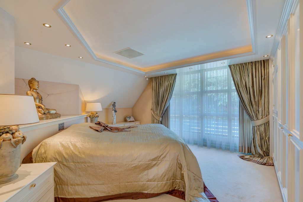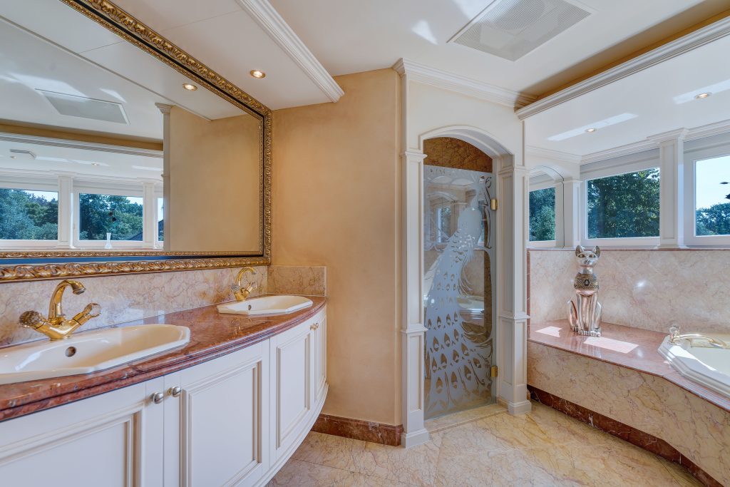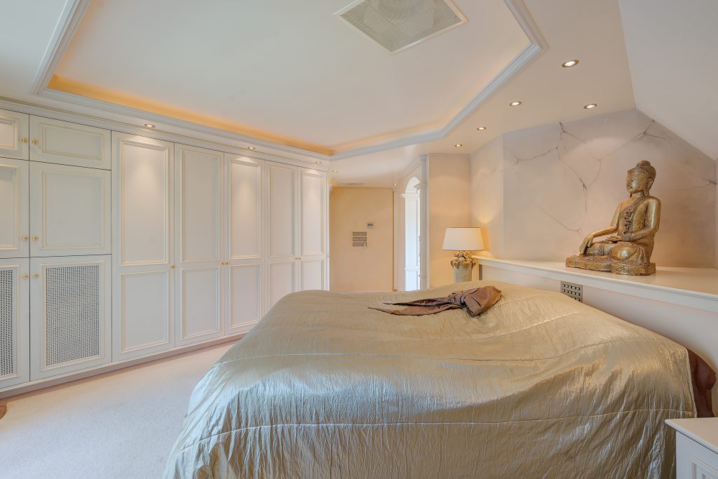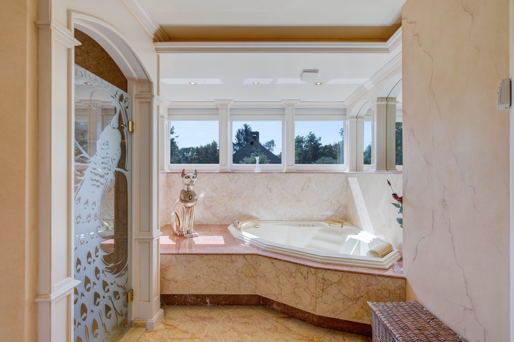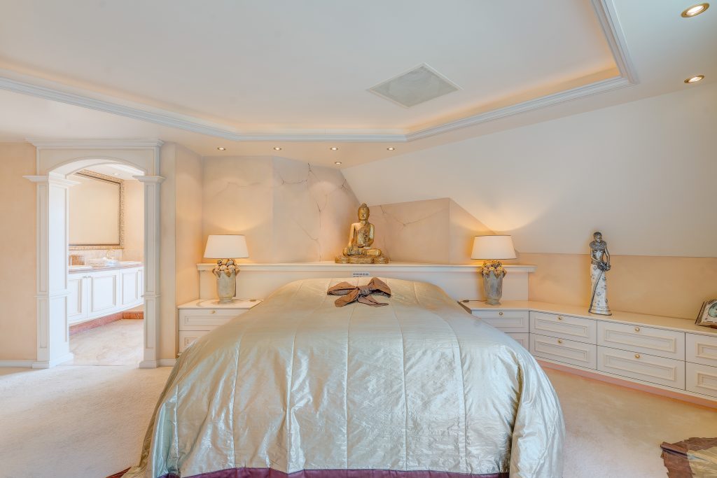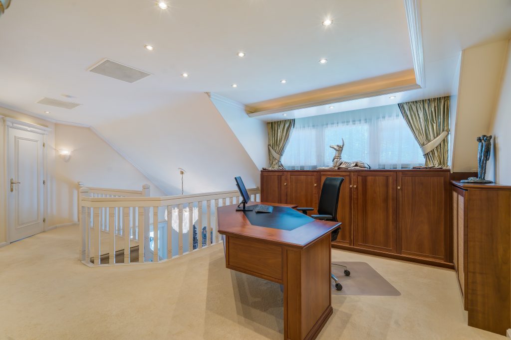 De villa beschikt over drie ruime slaapkamers op de eerste verdieping, waarvan de master suite een oase van rust en comfort is. Deze hoofdslaapkamer heeft een eigen loggia met uitzicht op de tuin, een kleedkamer en een badkamer en suite. De badkamer is uitgerust met een inloopdouche, een whirlpool ligbad en een dubbele wastafel, afgewerkt met marmer en voorzien van elektrische vloerverwarming. Een tweede badkamer op de verdieping biedt een extra douche en dubbele wastafel, perfect voor gasten of gezinsleden.