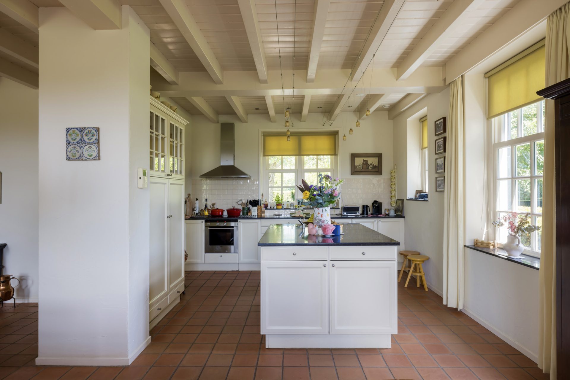Vanuit de entree bereikt u de woonkamer en de sfeervolle werkkamer. De open woonkeuken staat in verbinding met de eetkamer en biedt uitzicht op de omliggende tuin. De keuken beschikt over alle wenselijke apparatuur.