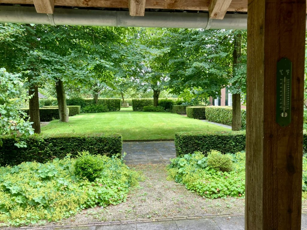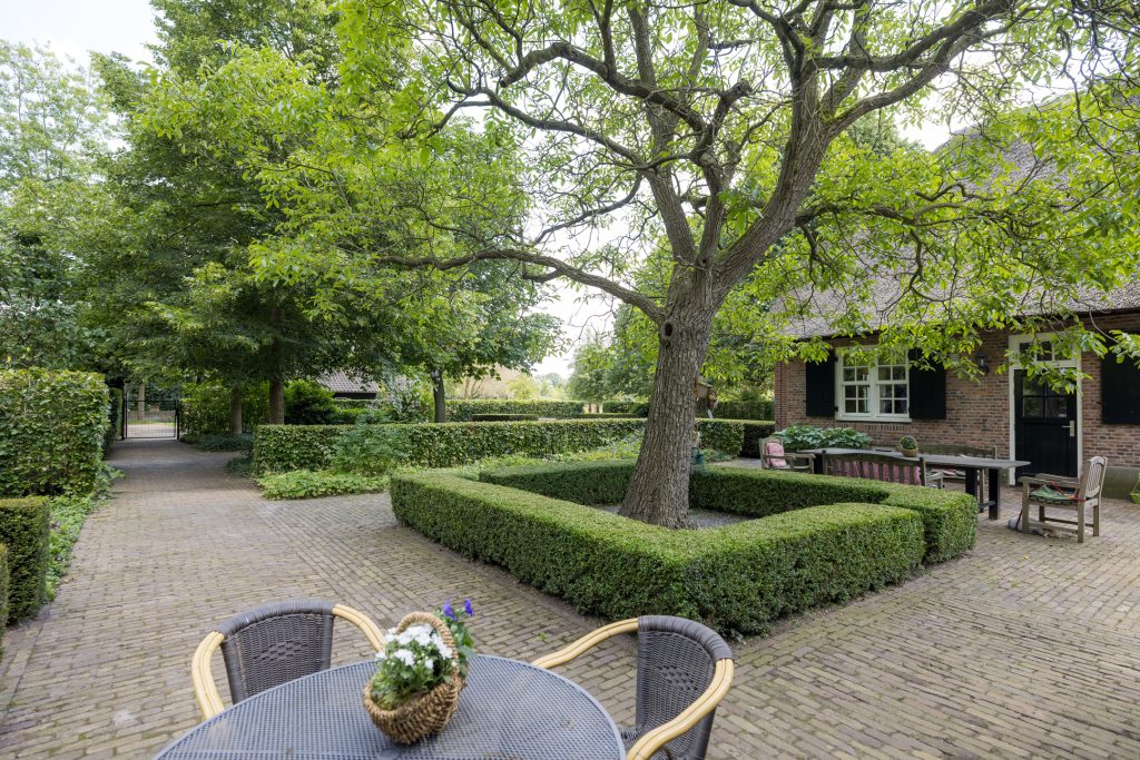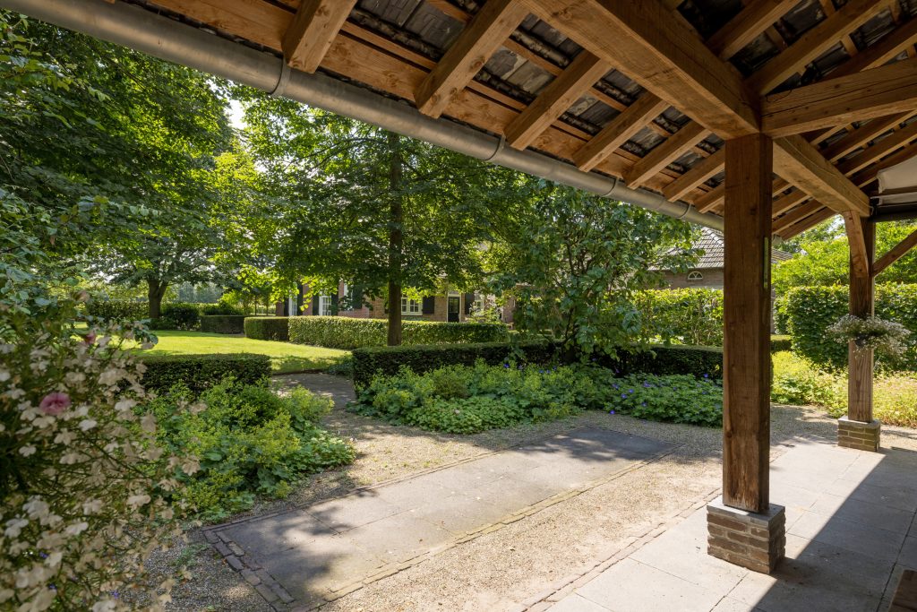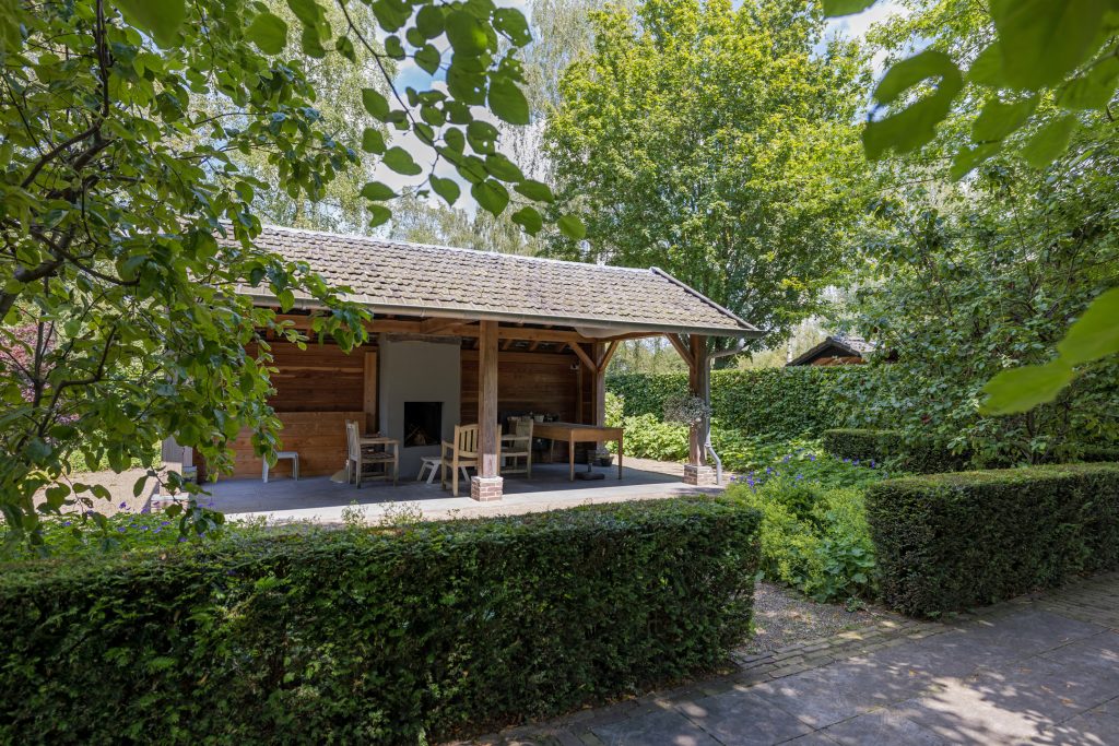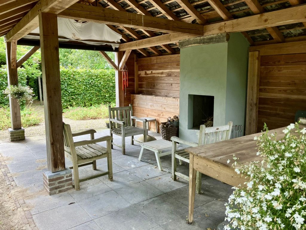 De boerderij wordt omringd door een prachtige tuin met een eigen appelboomgaard en een op het zuiden gelegen visvijver. Een smaakvolle overkapping met haard ontbreekt natuurlijk niet, perfect om lange zomeravonden door te brengen. De tuin is volledig omheind met een Heras hekwerk met een van 1.5 meter. Hierdoor kunnen huisdieren of erf niet af.