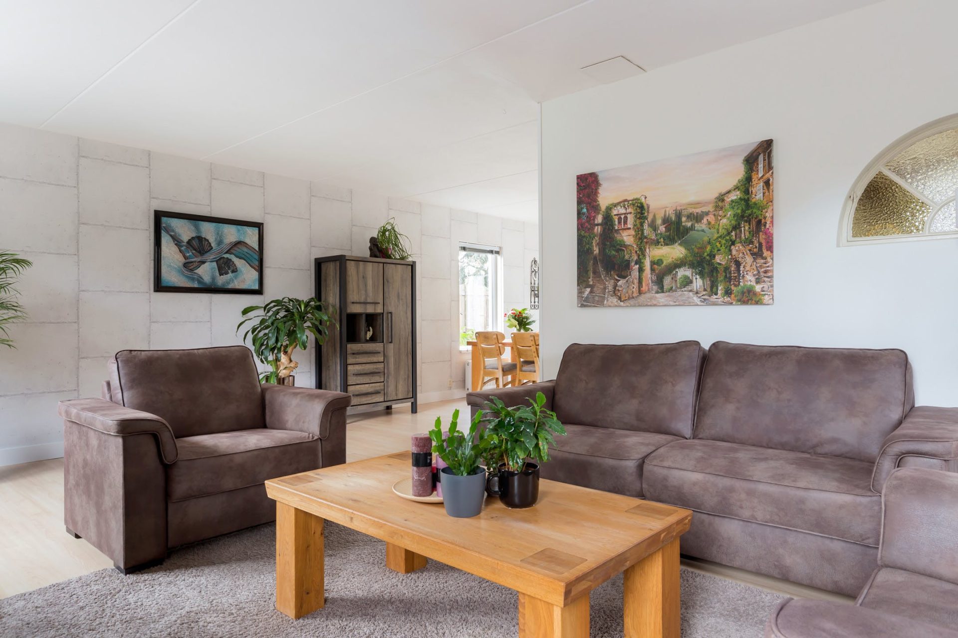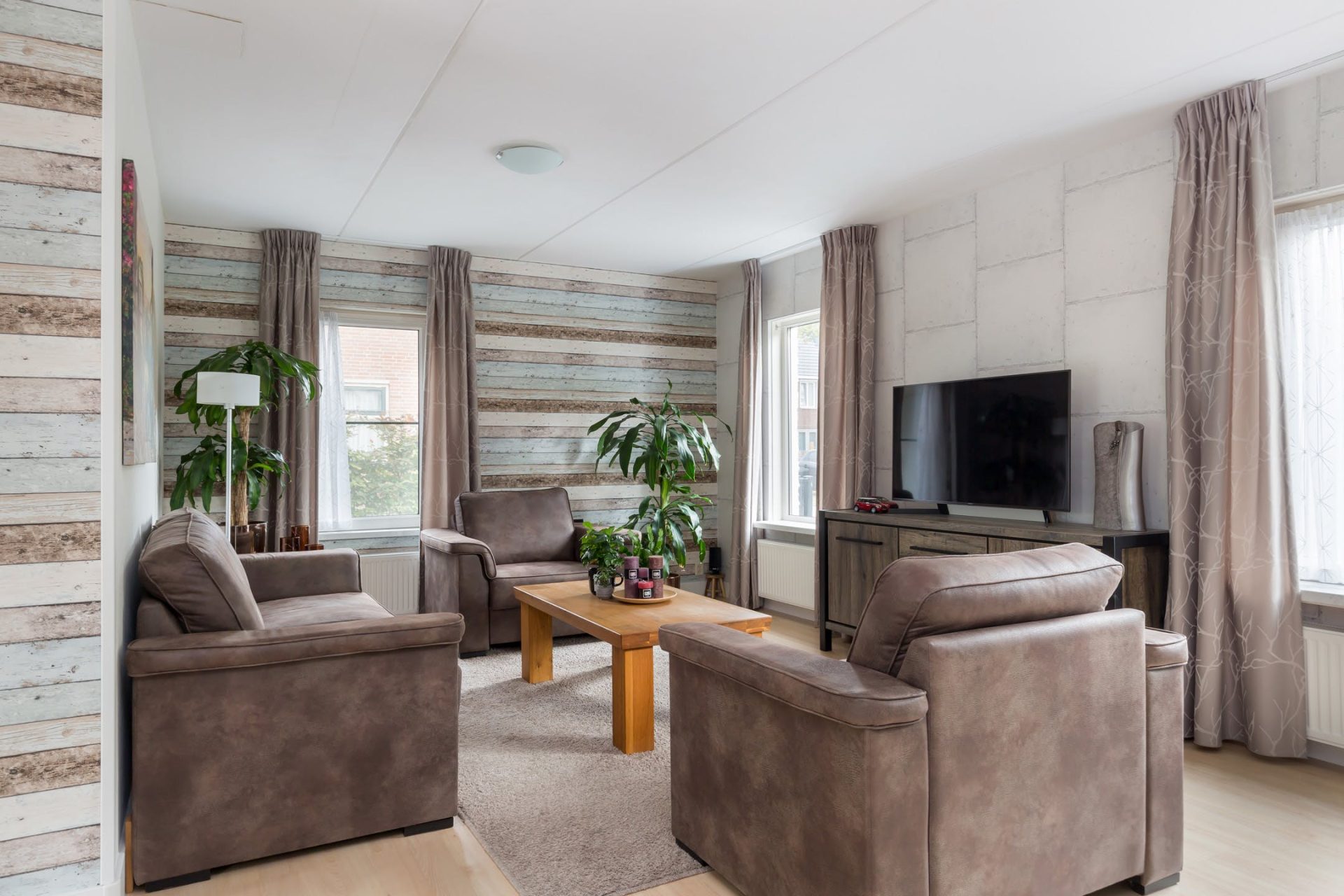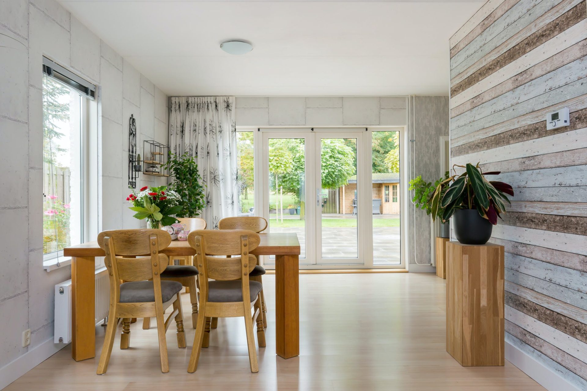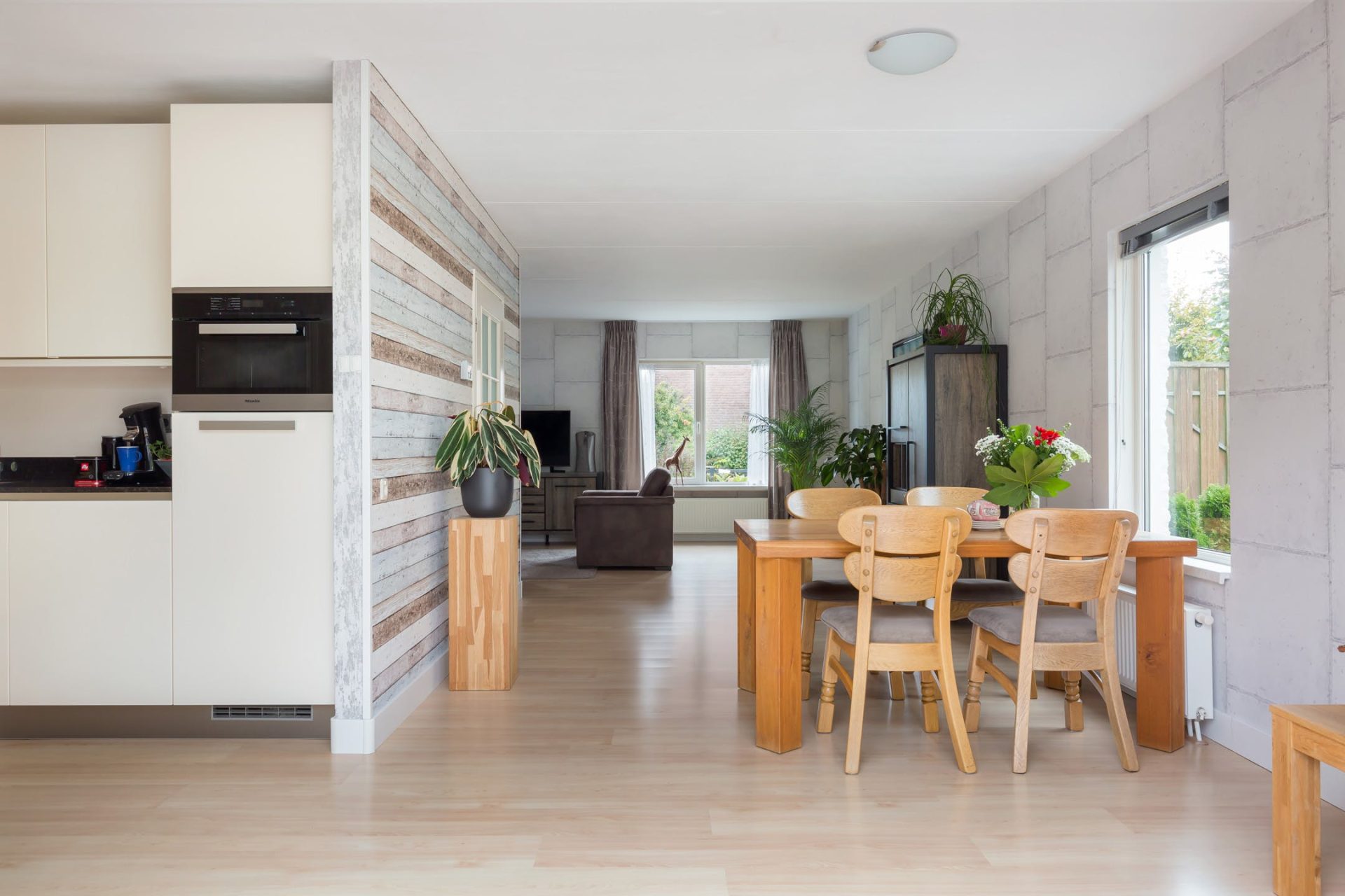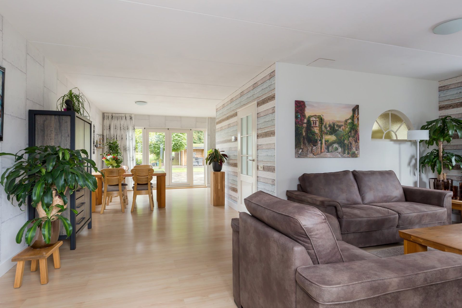 De woonkamer is een royale, lichte leefruimte met veel lichtinval bij het zit- en het eetgedeelte. In de zitkamer kijkt u naar de voortuin en de rustige autoluwe straat met weinig bebouwing in het zicht. Bij de eettafel is een groot raam in de zijgevel en aan de achterzijde is een grote pui met openslaande deuren naar de tuin. In de woonkamer ligt, net als in de hal en keuken, een nette laminaatvloer.