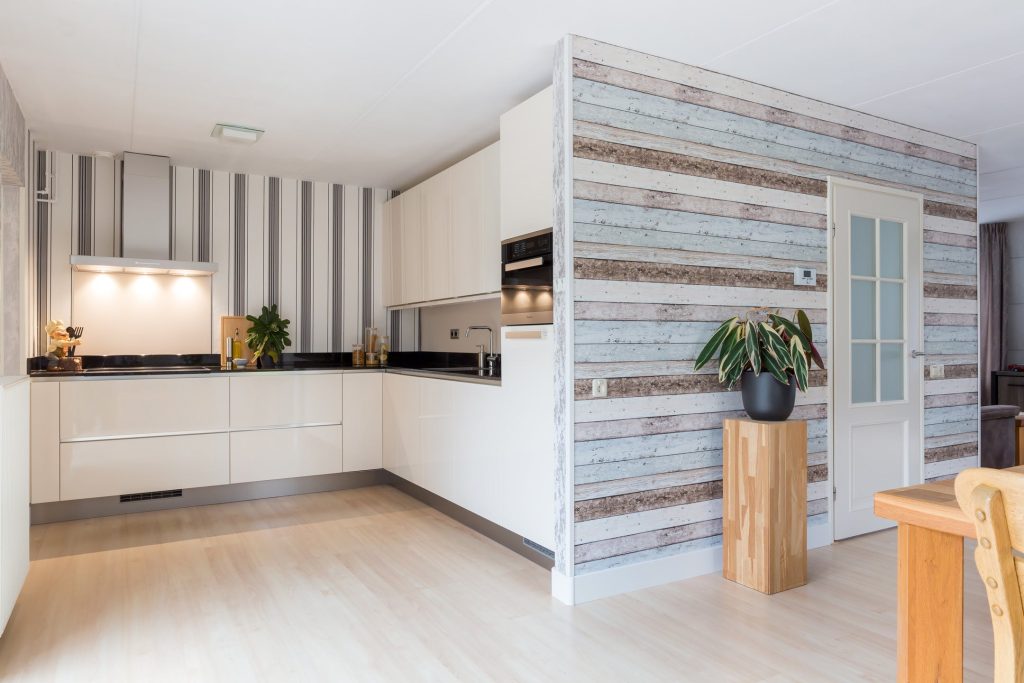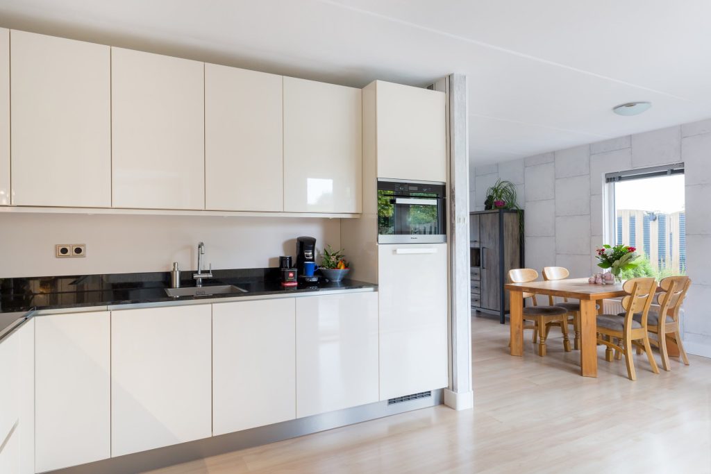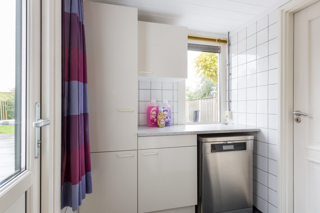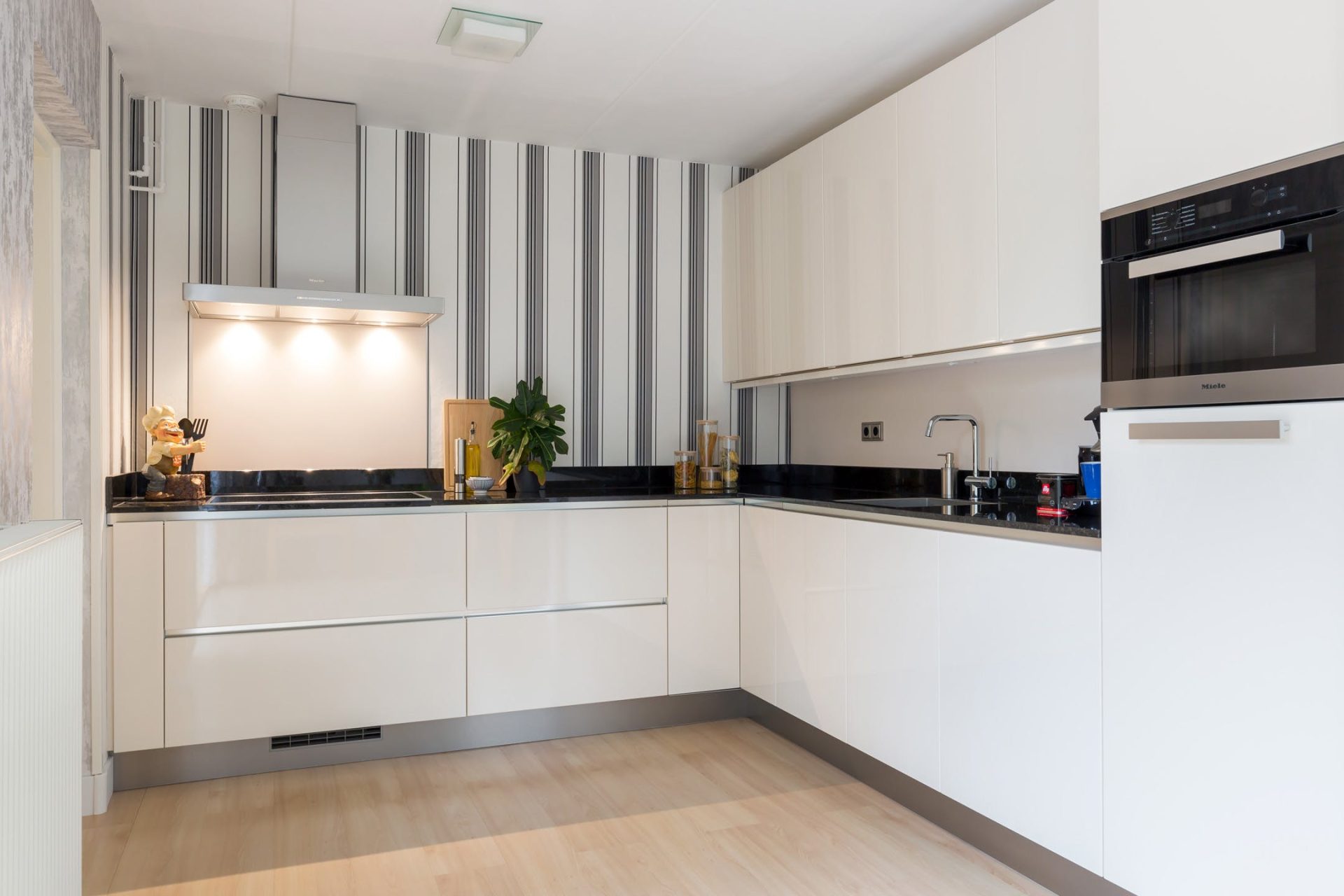 Vanuit het eetgedeelte loopt u de open keuken in met een moderne hoekopstelling, voorzien van brede lades en diverse kasten. Het aanrechtblad is van graniet en alle (Miele) apparatuur is ingebouwd: een inductiekookplaat, afzuigkap, oven en een koelkast. In de aangrenzende bijkeuken is plek voor de wasmachine en vaatwasser.