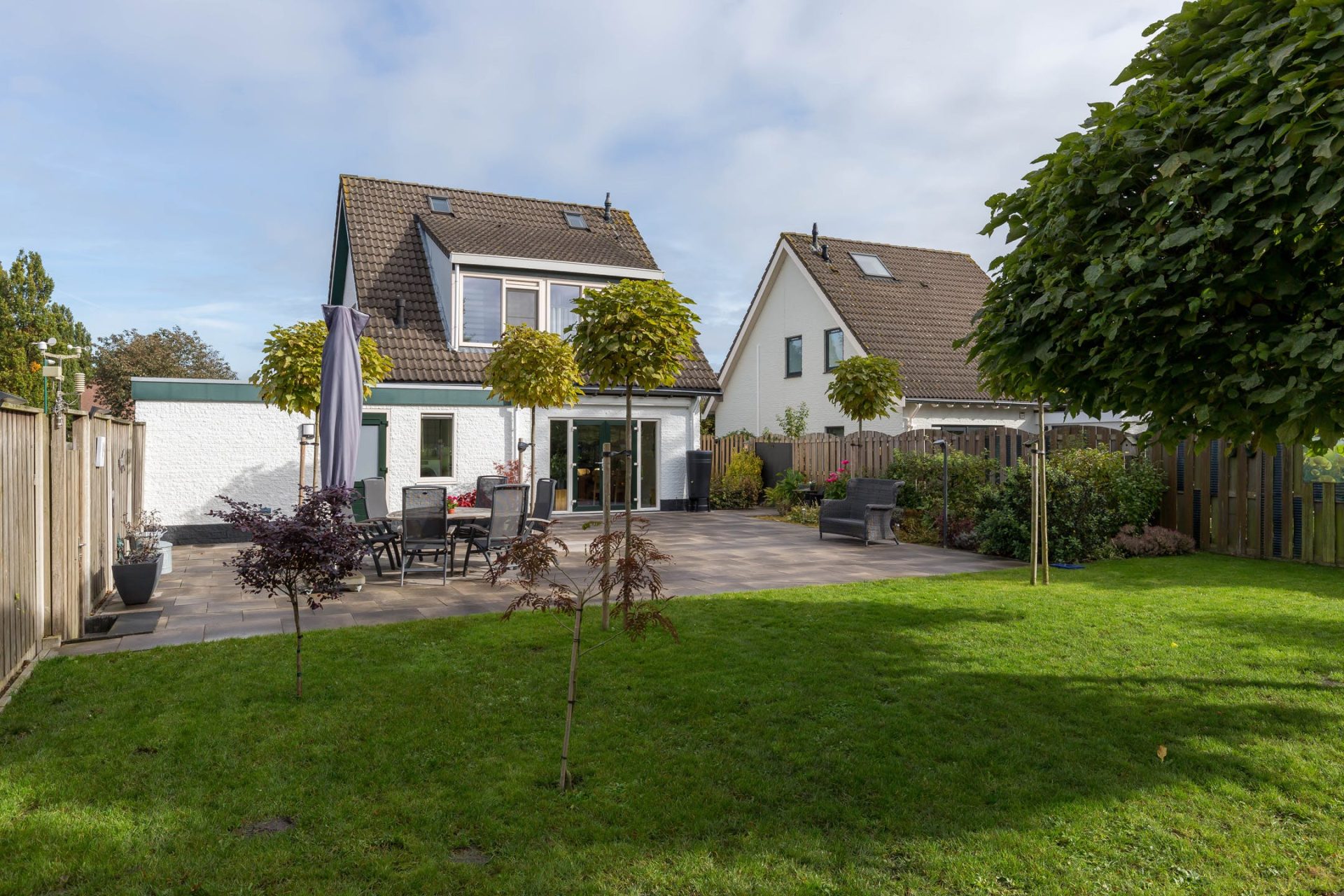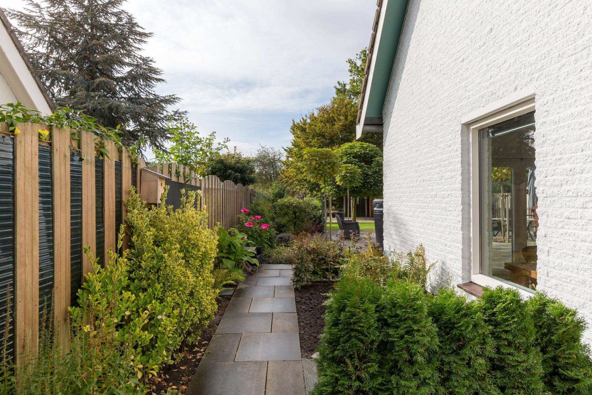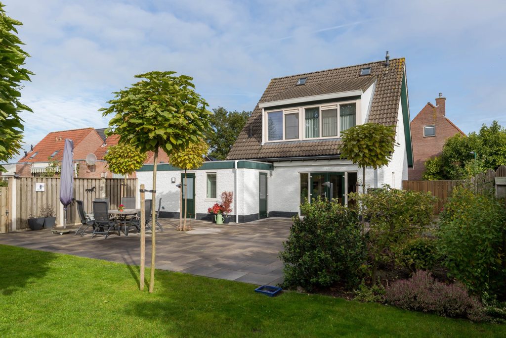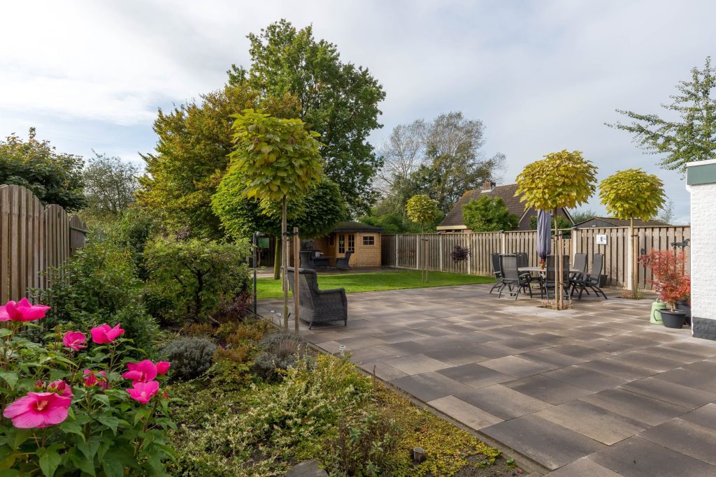 Links van de woning is een poort naar de zij- en achtertuin, waarbij de achtertuin op het zuidwesten is gesitueerd. De tuin is ingedeeld met een groot terras, een gazon met diverse bomen, houten schuttingen en een tweede terras bij de houten berging met overkapping. Links van dit terras ligt een stuk kunstgras en geniet je van het uitzicht naar de achtergelegen boomgaard en de Lekdijk.