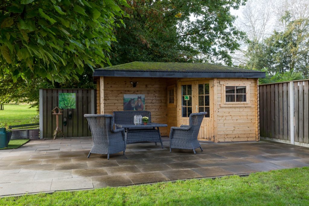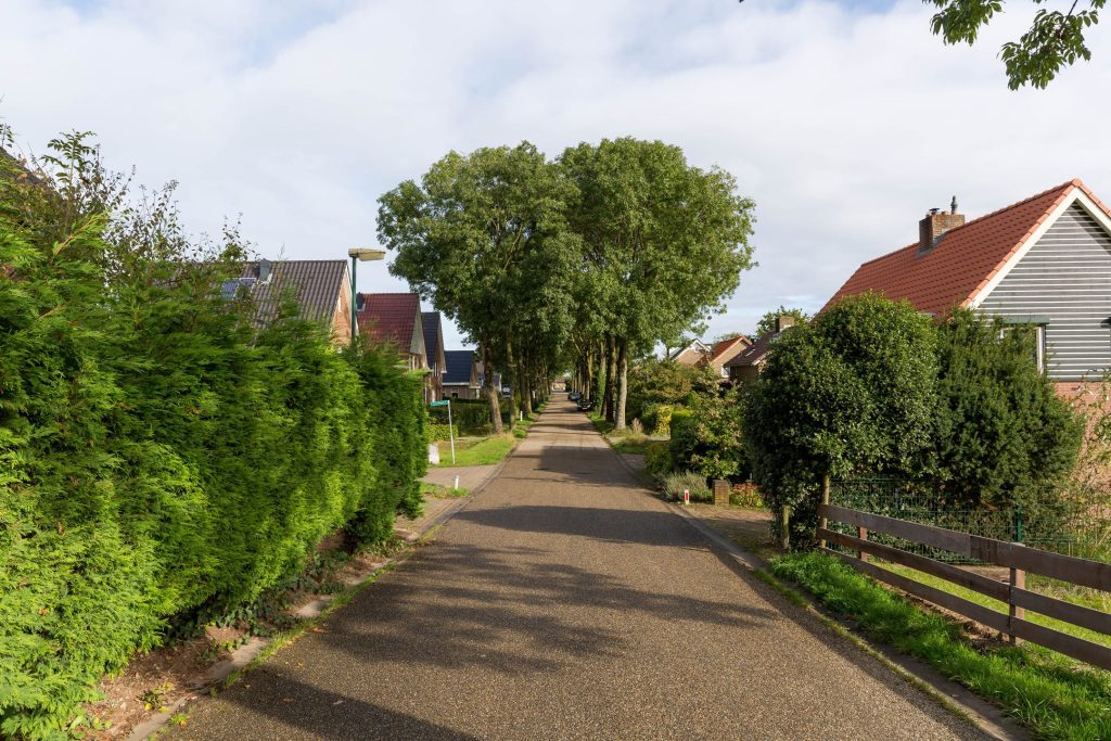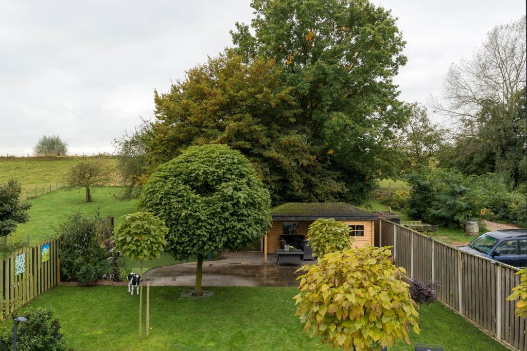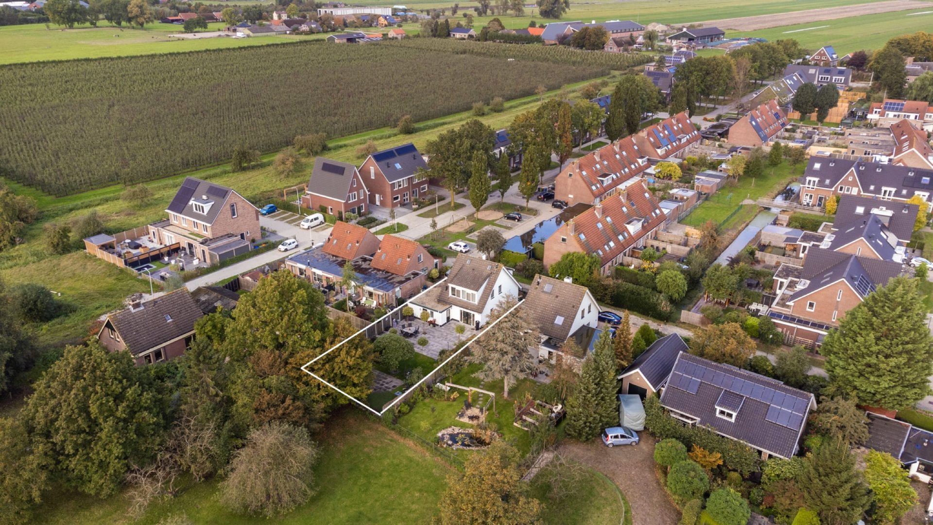 Links van de woning is een poort naar de zij- en achtertuin, waarbij de achtertuin op het zuidwesten is gesitueerd. De tuin is ingedeeld met een groot terras, een gazon met diverse bomen, houten schuttingen en een tweede terras bij de houten berging met overkapping. Links van dit terras ligt een stuk kunstgras en geniet je van het uitzicht naar de achtergelegen boomgaard en de Lekdijk.