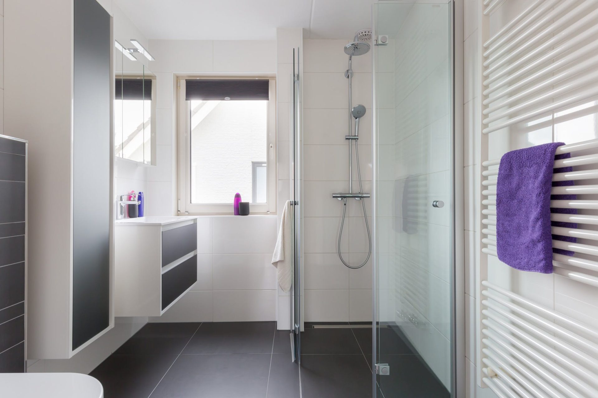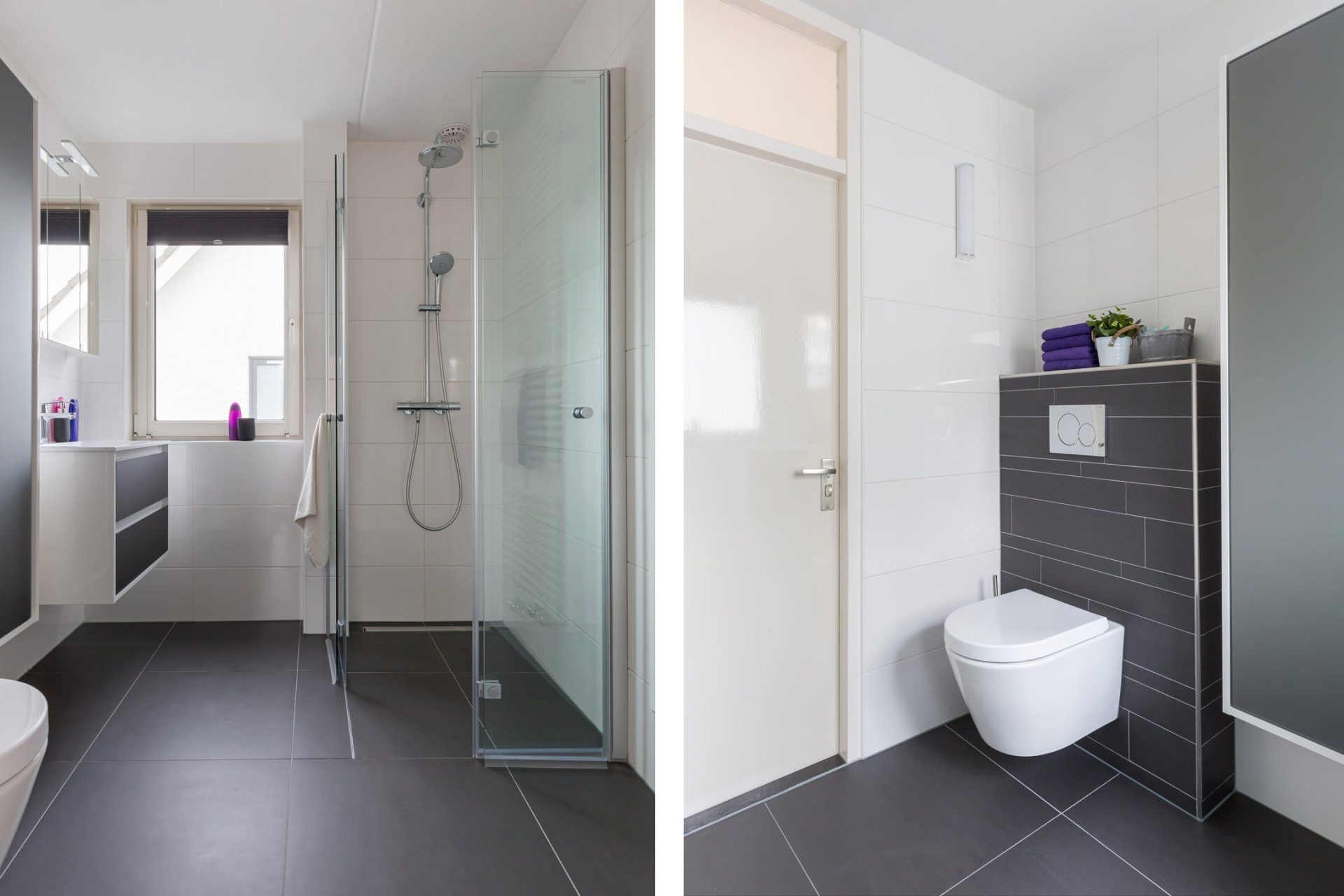 De moderne badkamer is ingedeeld met een grote inloopdouche, wastafelmeubel, handdoekenradiator en een tweede toilet. De grote, lichte tegels op de wanden vormen een mooie combinatie met de antracietkleurige tegels op de vloer en achterwand van het toilet.
