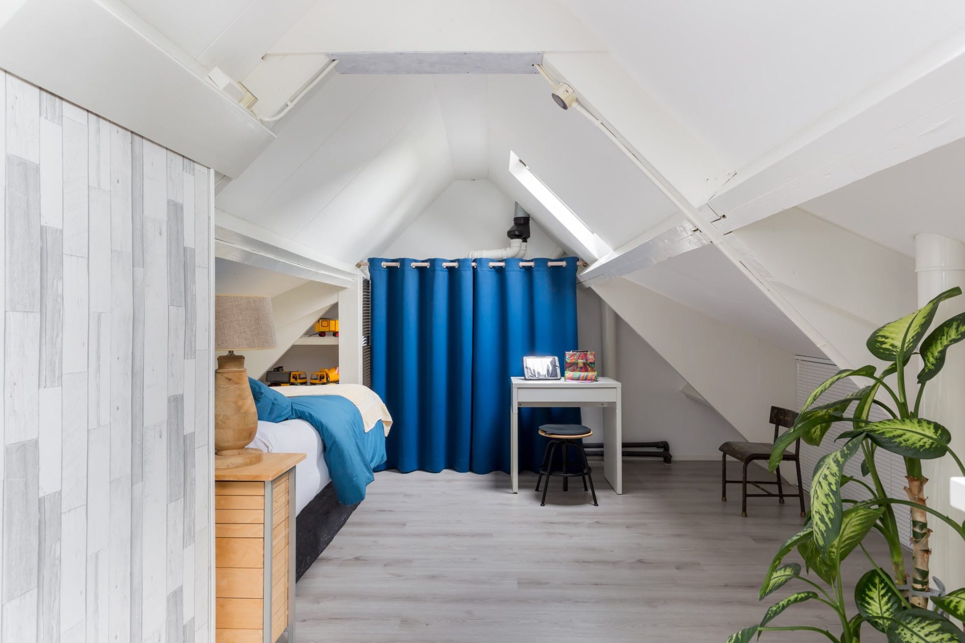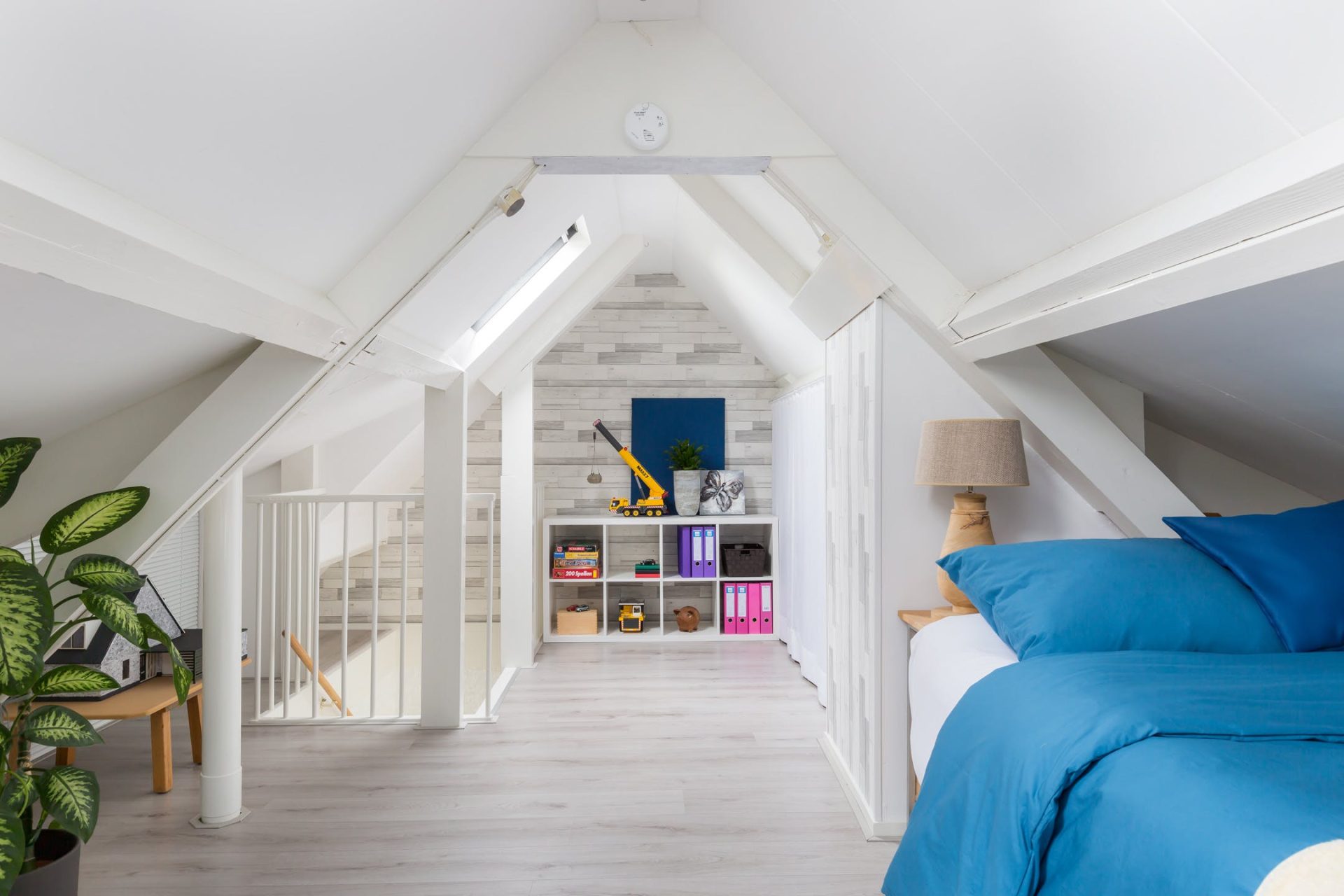 Via een vaste trap te bereiken zolderkamer met twee dakramen, een lichtgrijze laminaatvloer en bergruimte in de schuinte van het dak. Deze kamer is in te richten als logeerkamer en is, net als de rest van de woning, zeer netjes onderhouden.