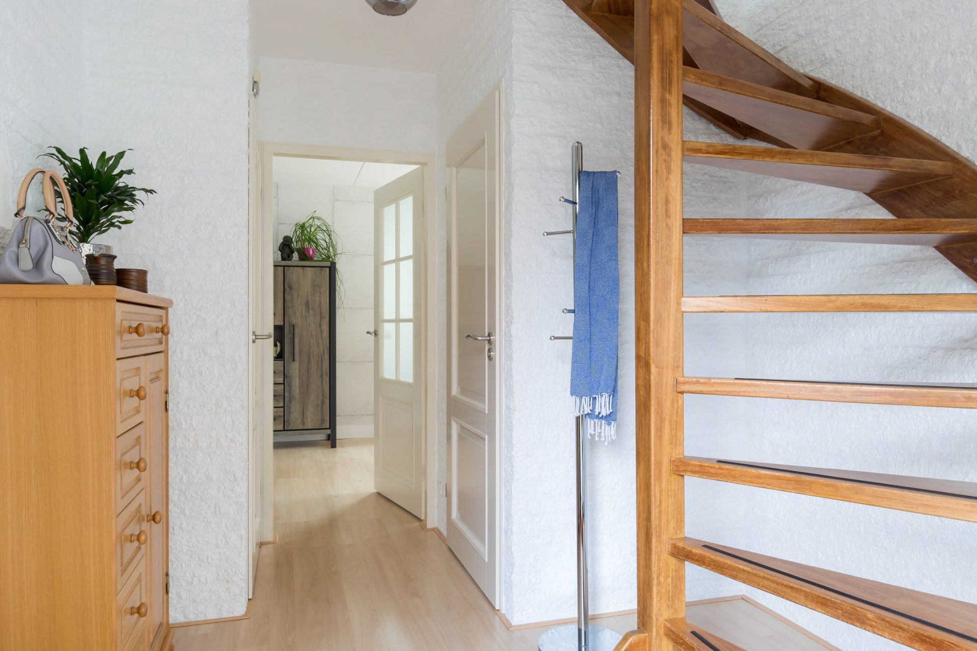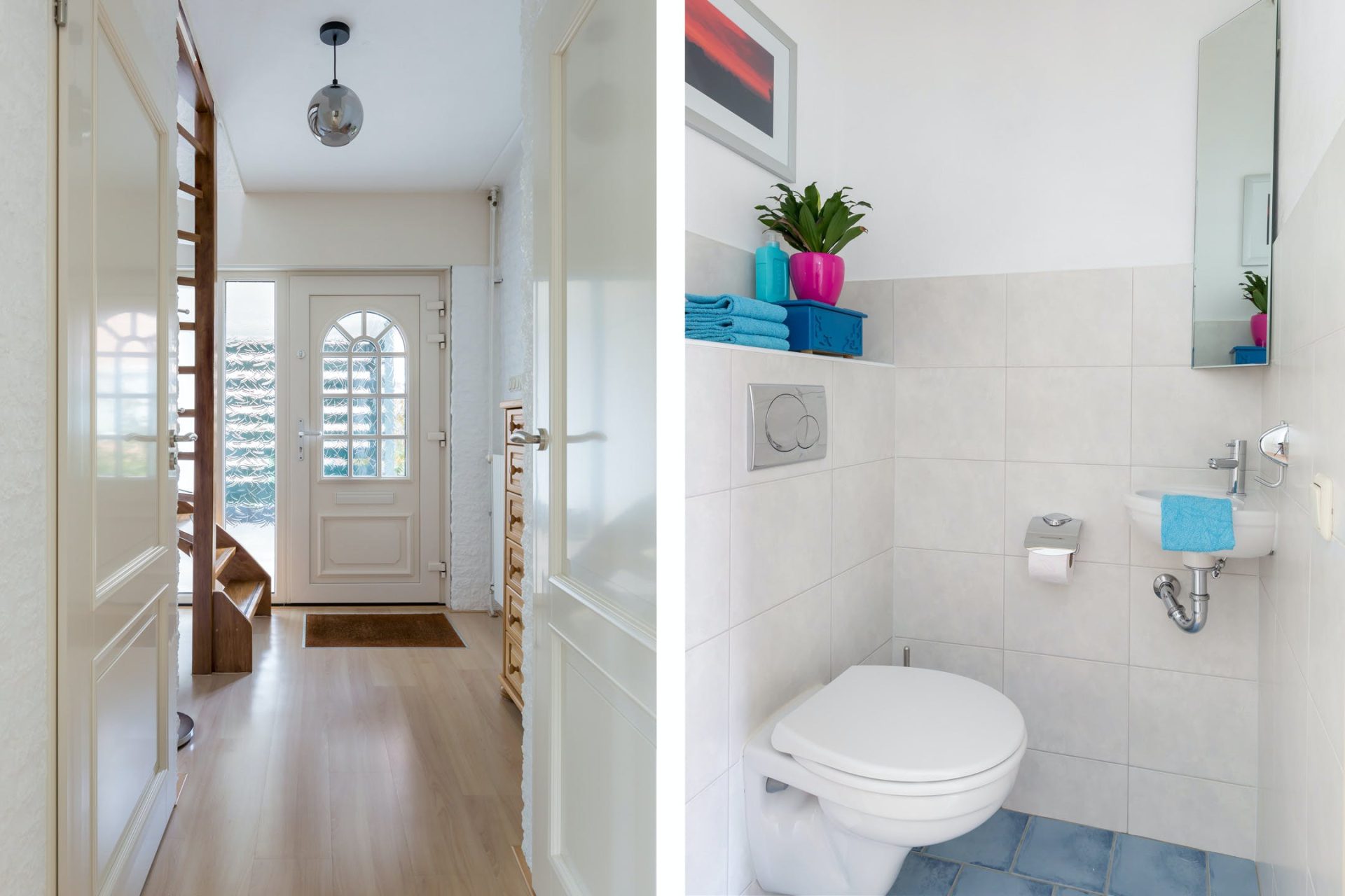 Deze stijlvolle, vrijstaande woning heeft een overdekte entree die toegang geeft tot de mooie ontvangsthal. Rechts in de hal is de hardhouten trap naar de eerste verdieping en door het raam aan de linkerzijde vangt u al een glimp van de woonkamer. Achter de paneeldeuren zijn de meterkast en de toiletruimte met fonteintje gesitueerd.