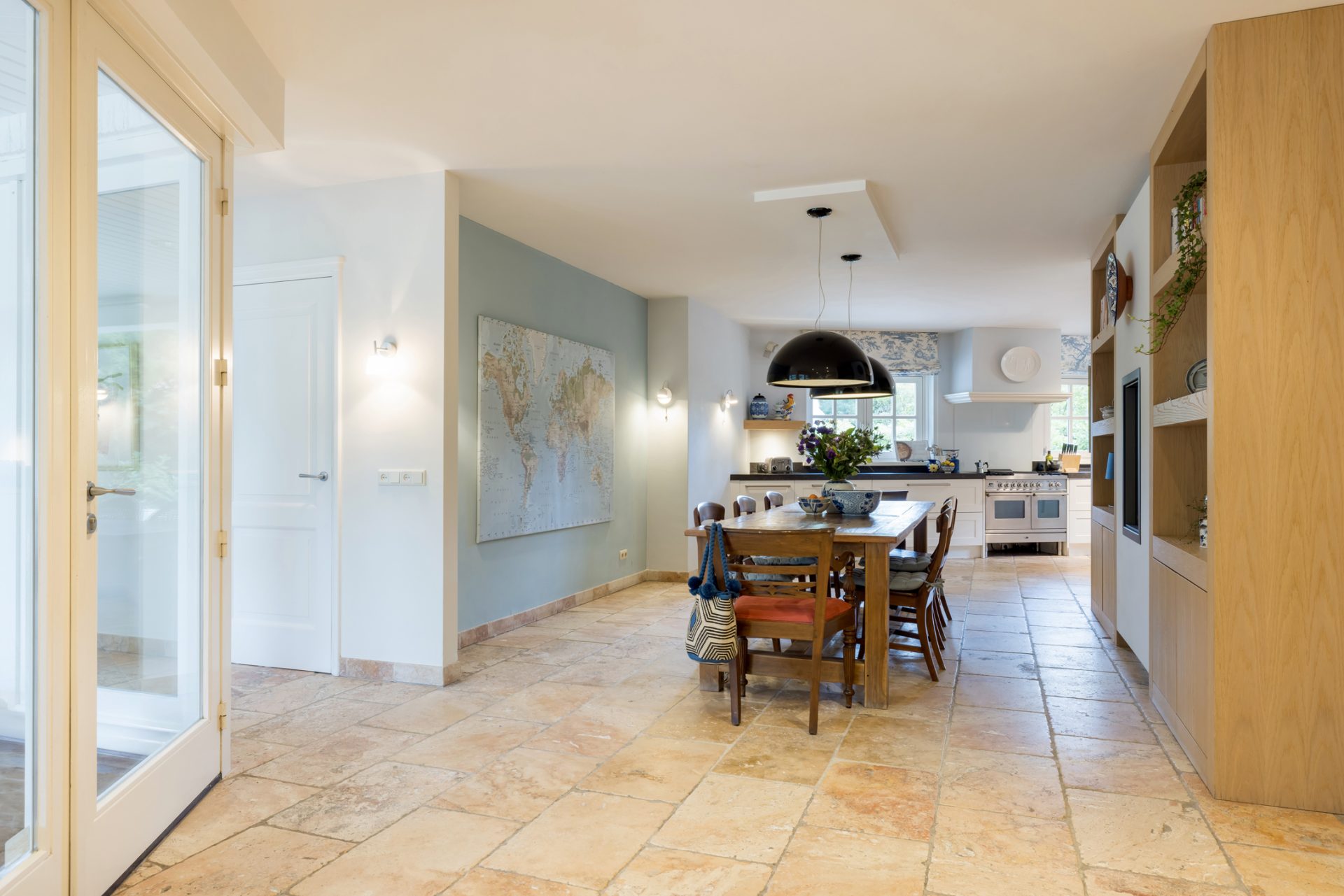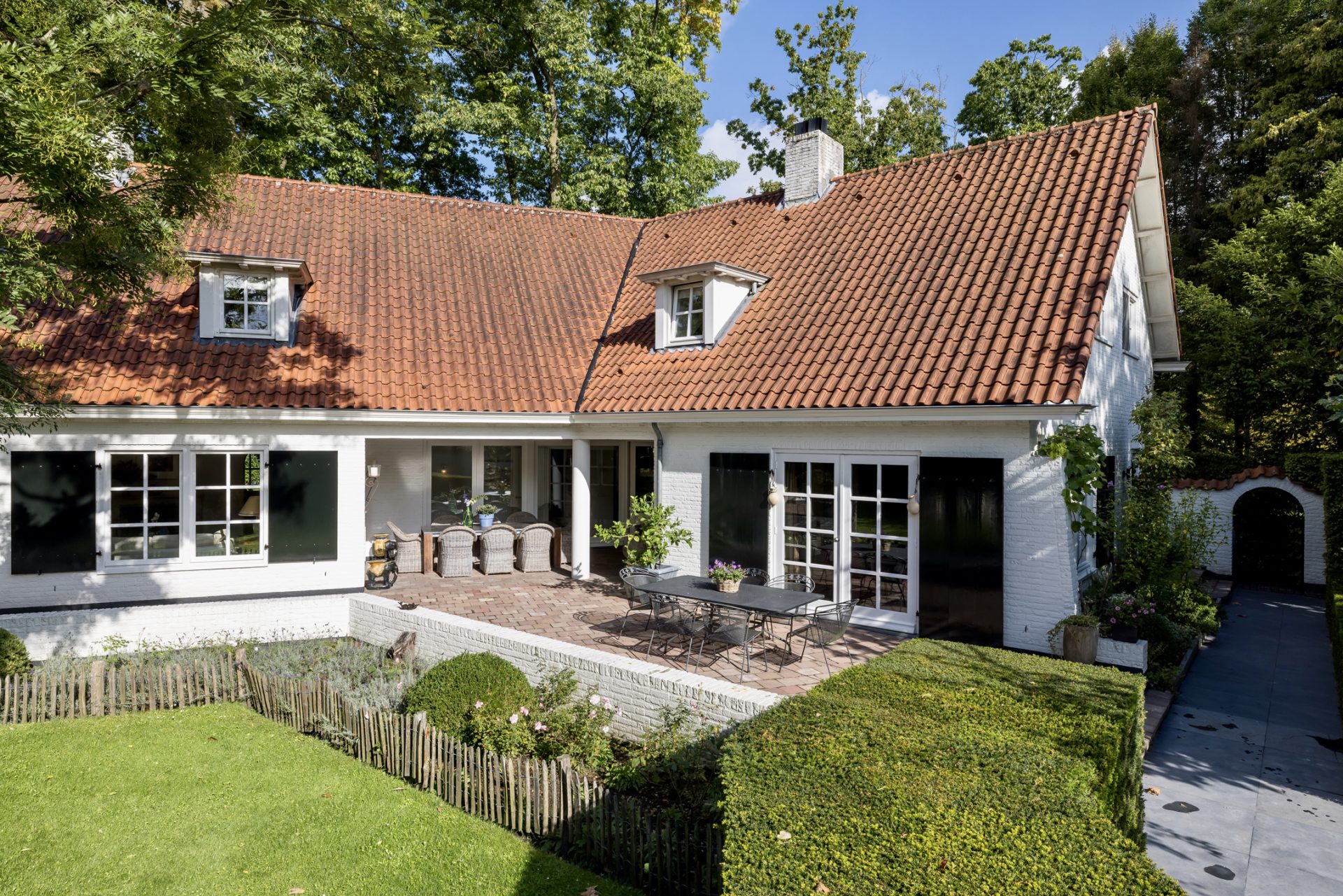 Zowel de keuken als de eetkamer bieden toegang tot het overdekte terras met een sfeervolle open haard – ideaal voor lange zomeravonden of intieme diners in de buitenlucht.