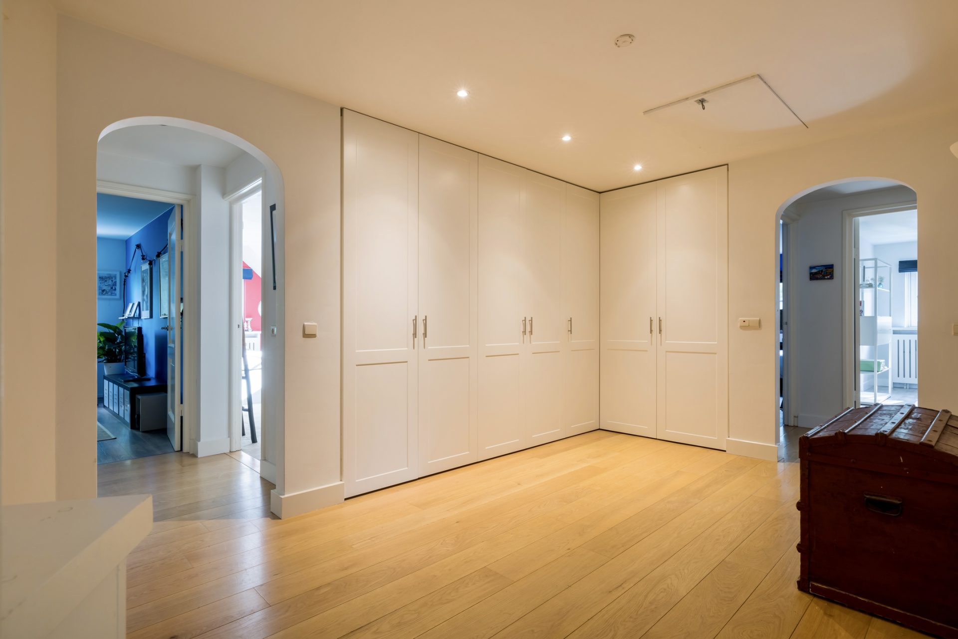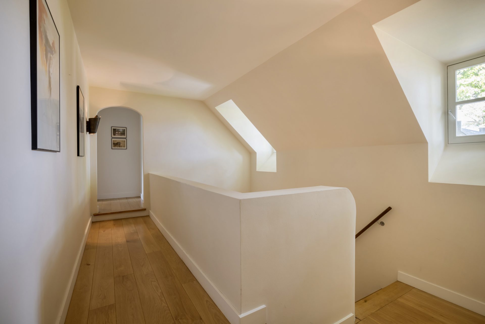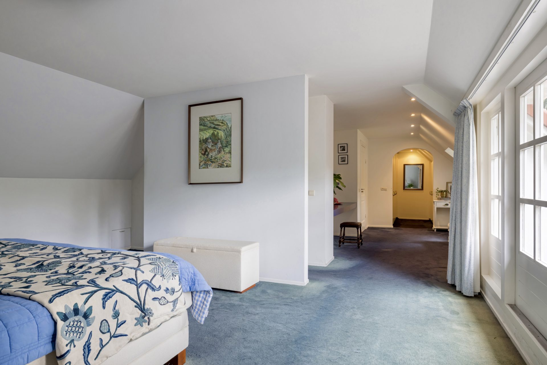 De eerste verdieping telt vijf slaapkamers, twee badkamers en een aparte wasruimte. De hoofdslaapkamer heeft een eigen badkamer en directe toegang tot een zonneterras. De overloop is voorzien van een inbouwkastenwand die functionaliteit combineert met elegantie. Via een luik is de ruime bergzolder op de tweede verdieping bereikbaar.
