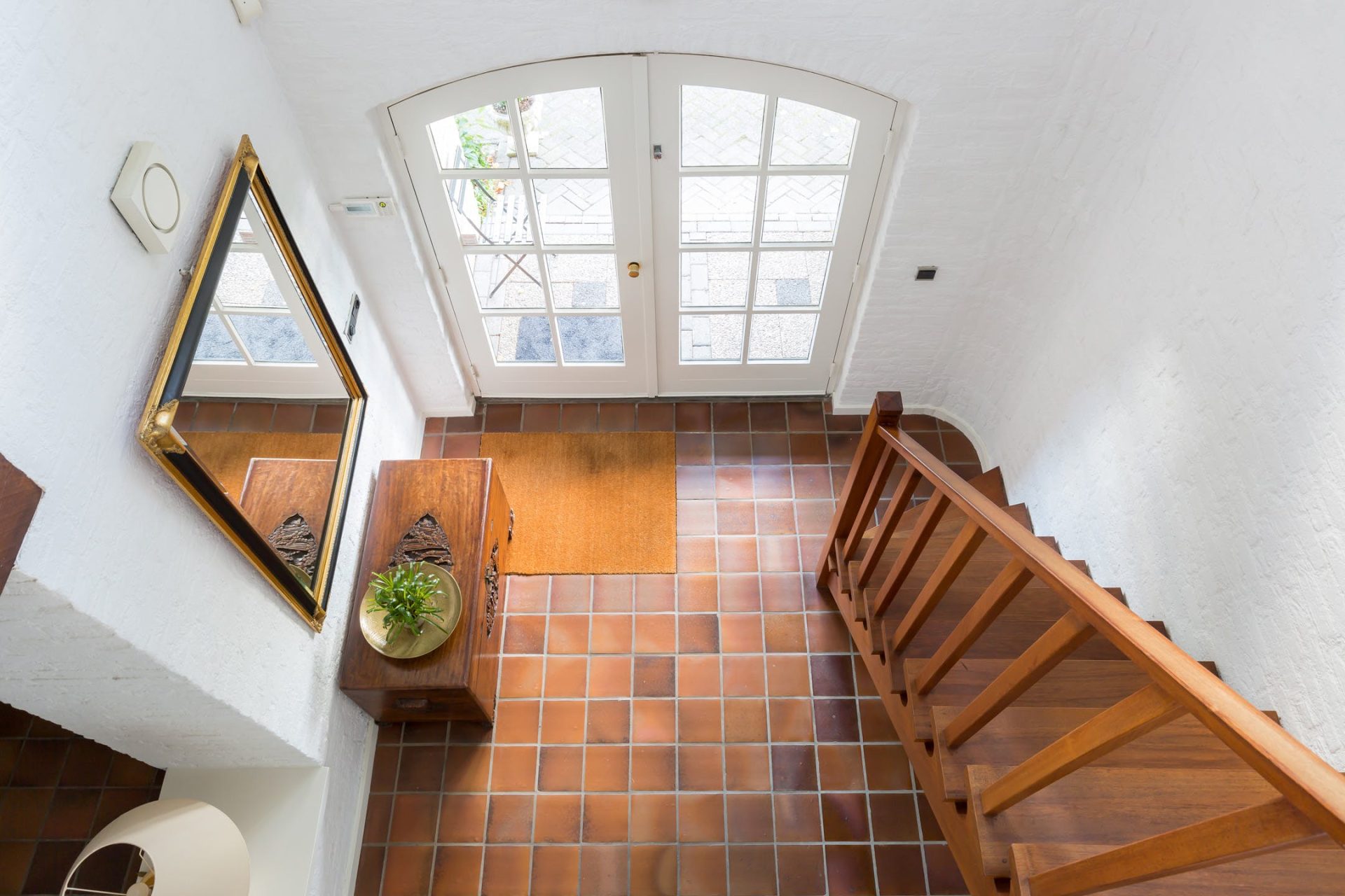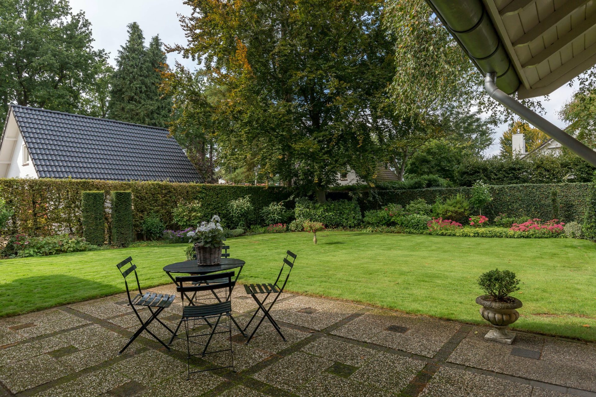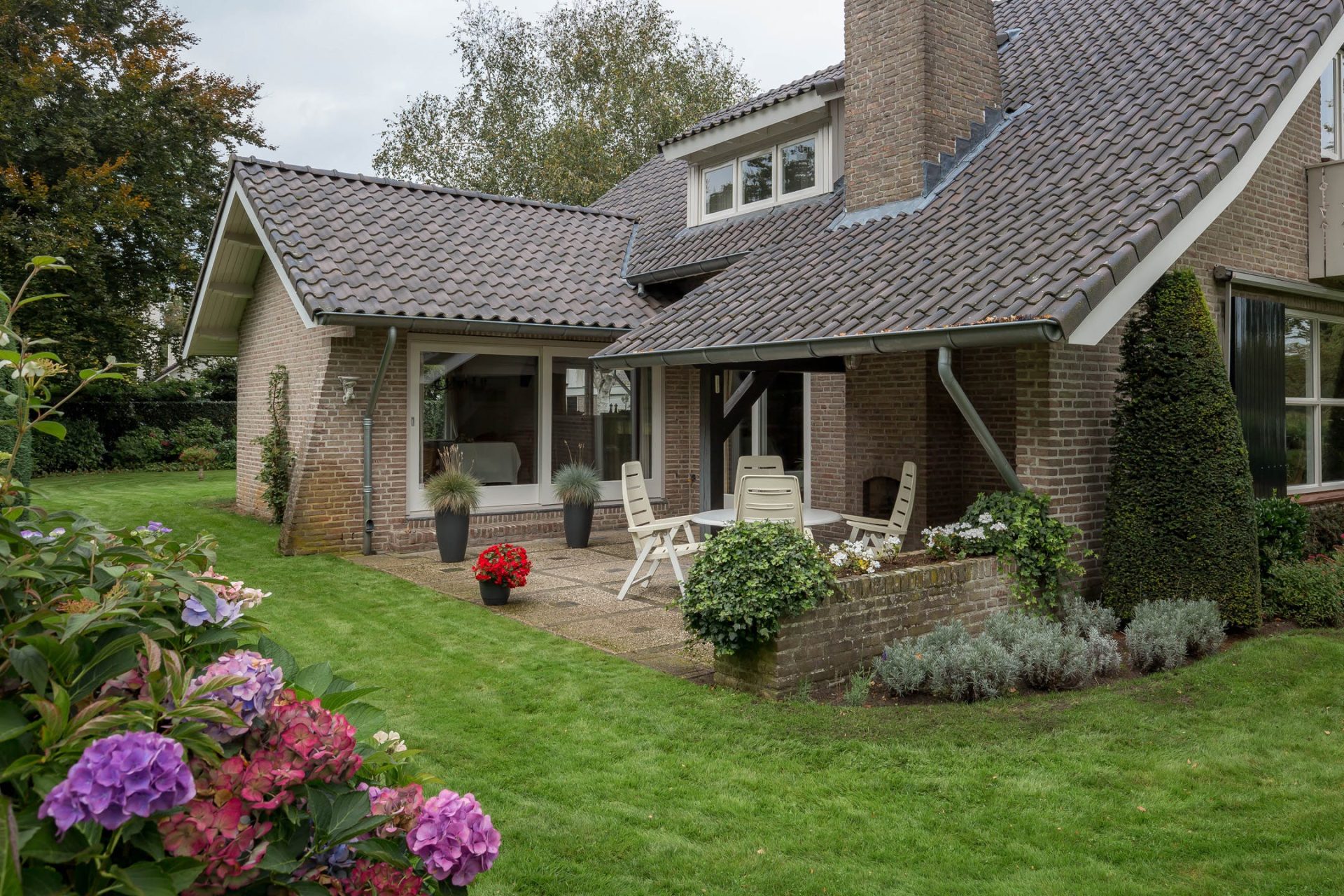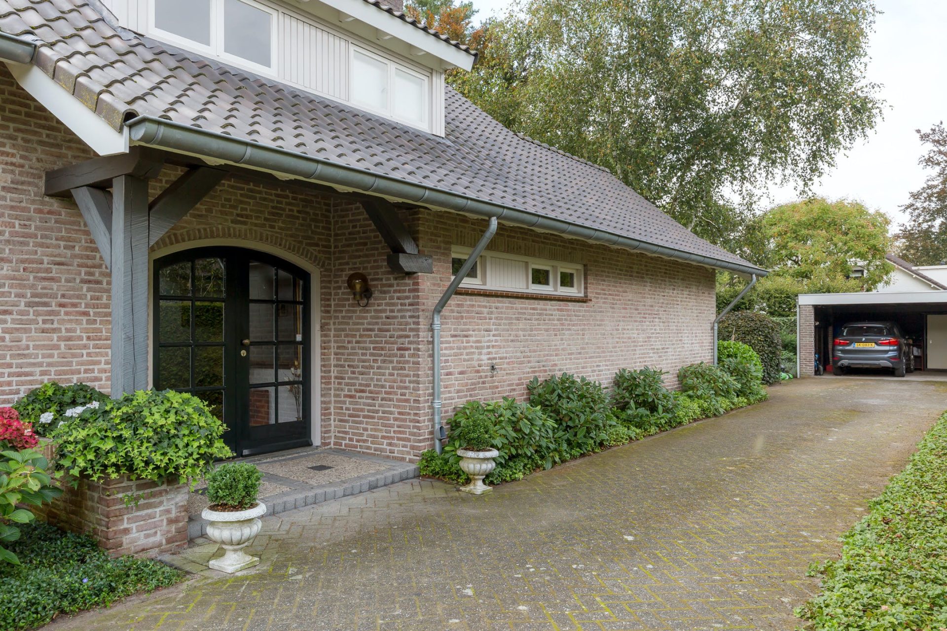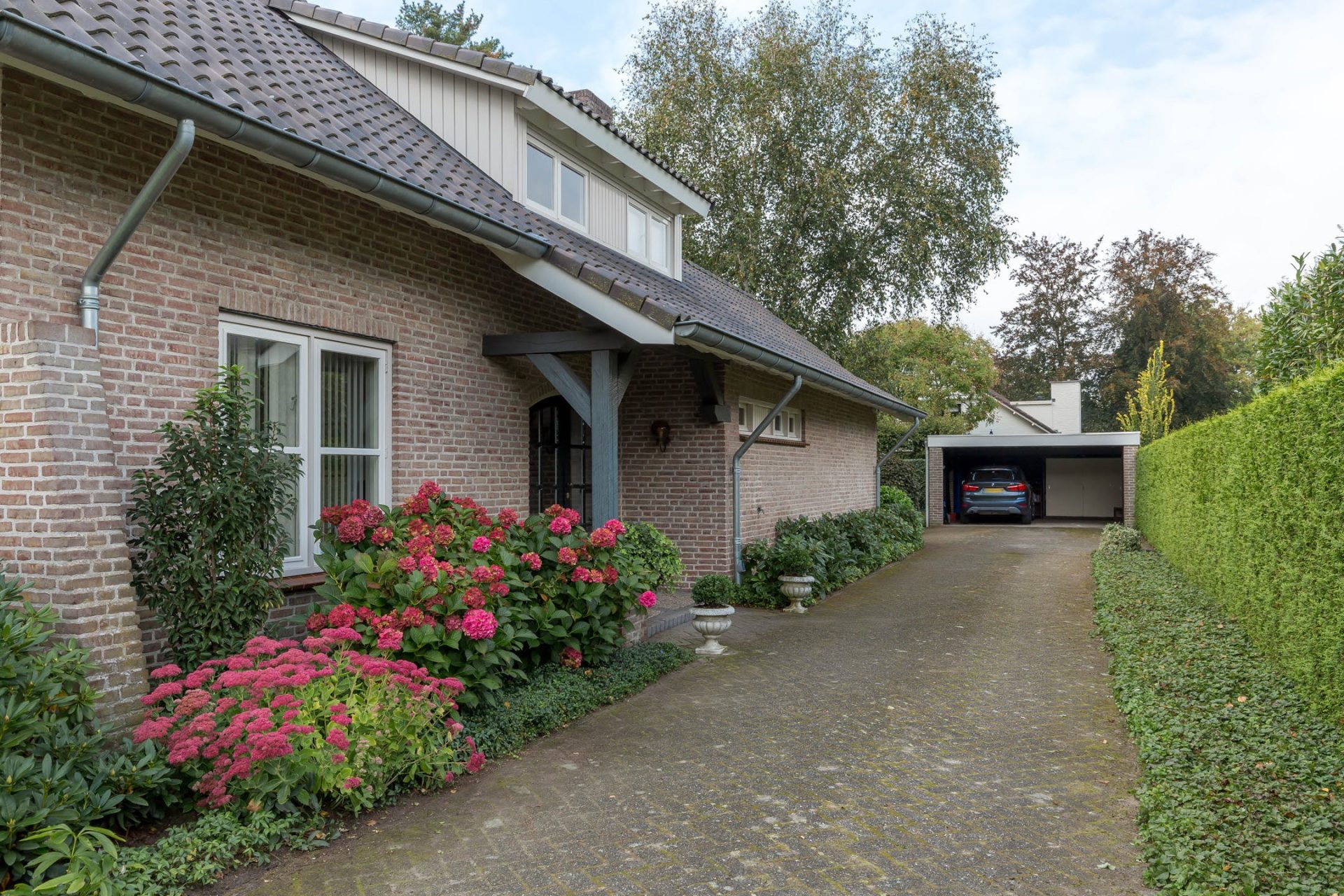 Bij de oprit is, naast de felgekleurde hortensia, de overdekte entree met dubbele deuren naar de ontvangsthal. In de hal ziet u een vide met hardhouten trap, een garderobe en gastentoilet. Aan de voorzijde van de villa ligt een ruime werkkamer met veel lichtinval en een inspirerend uitzicht.