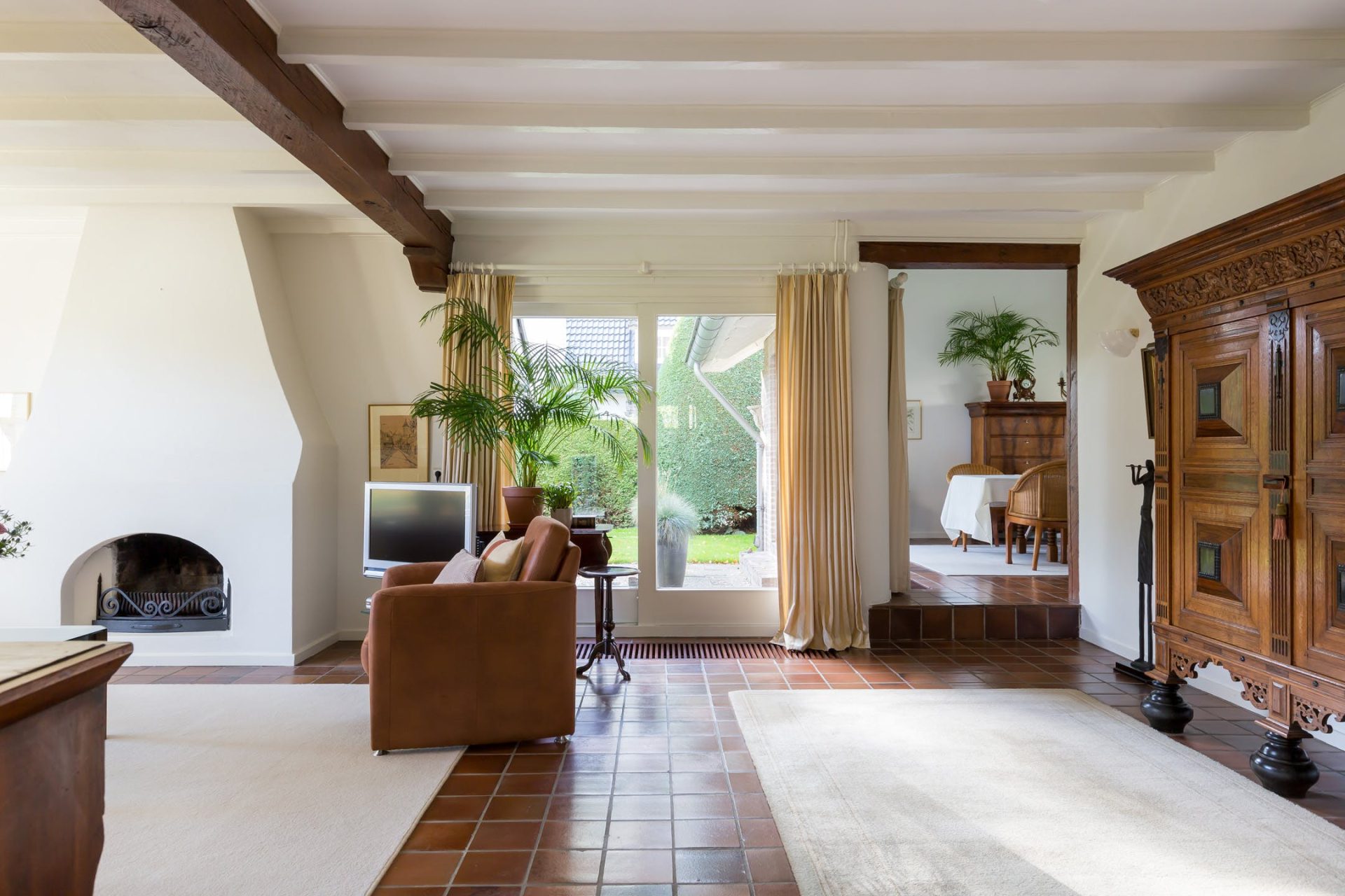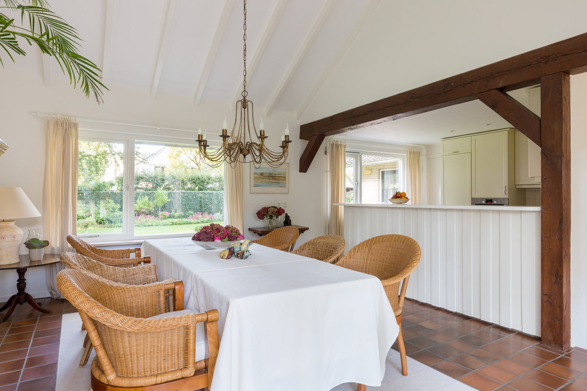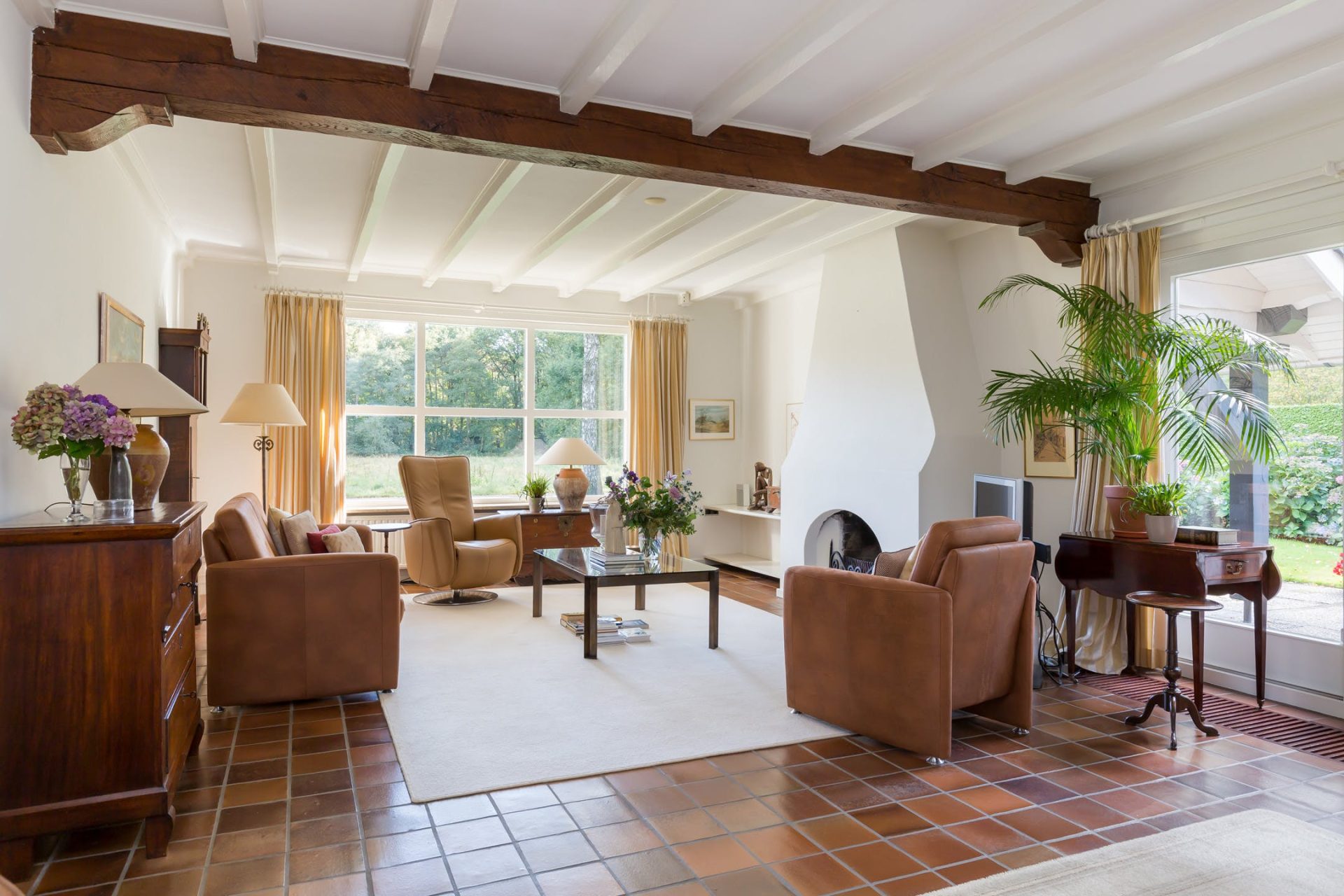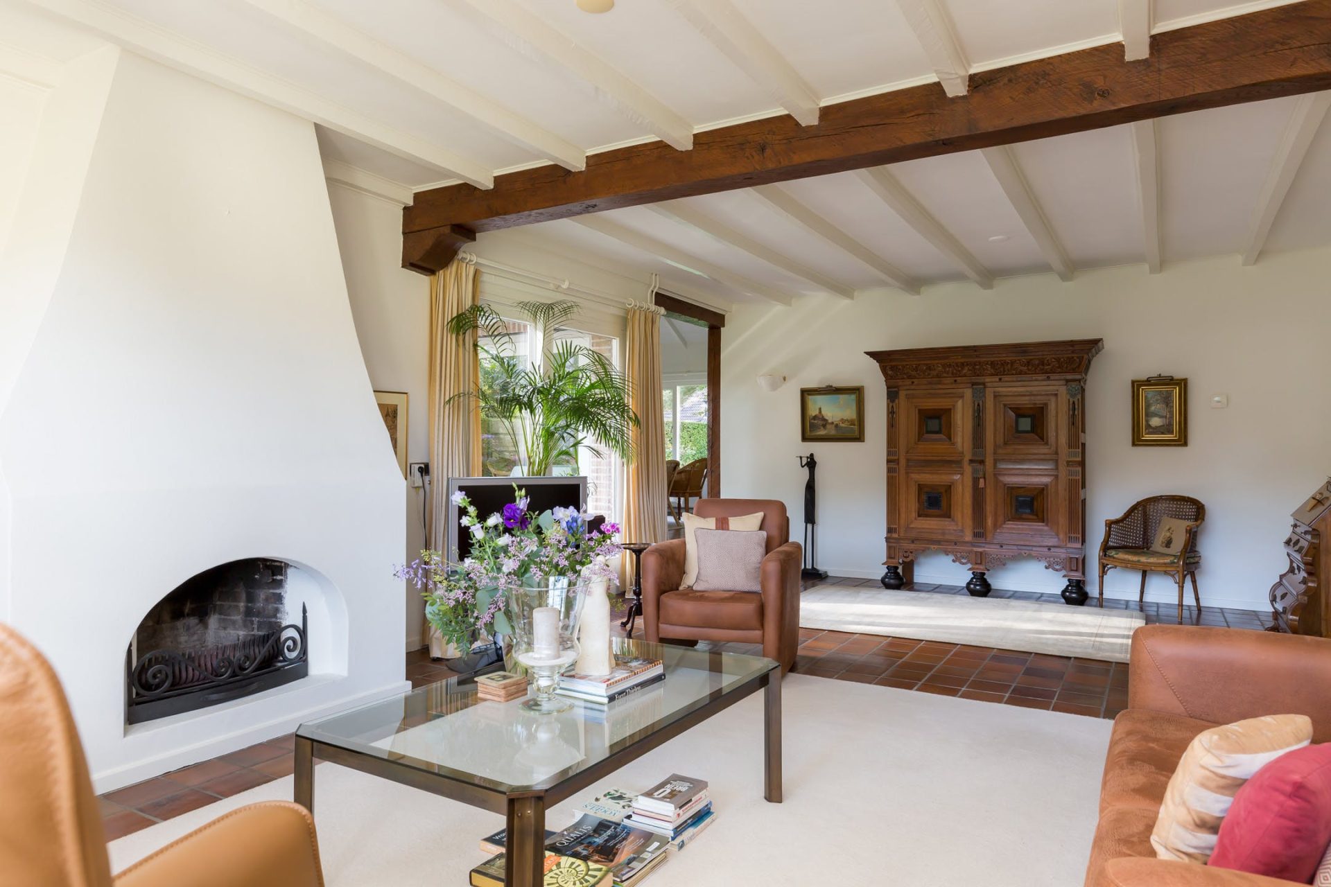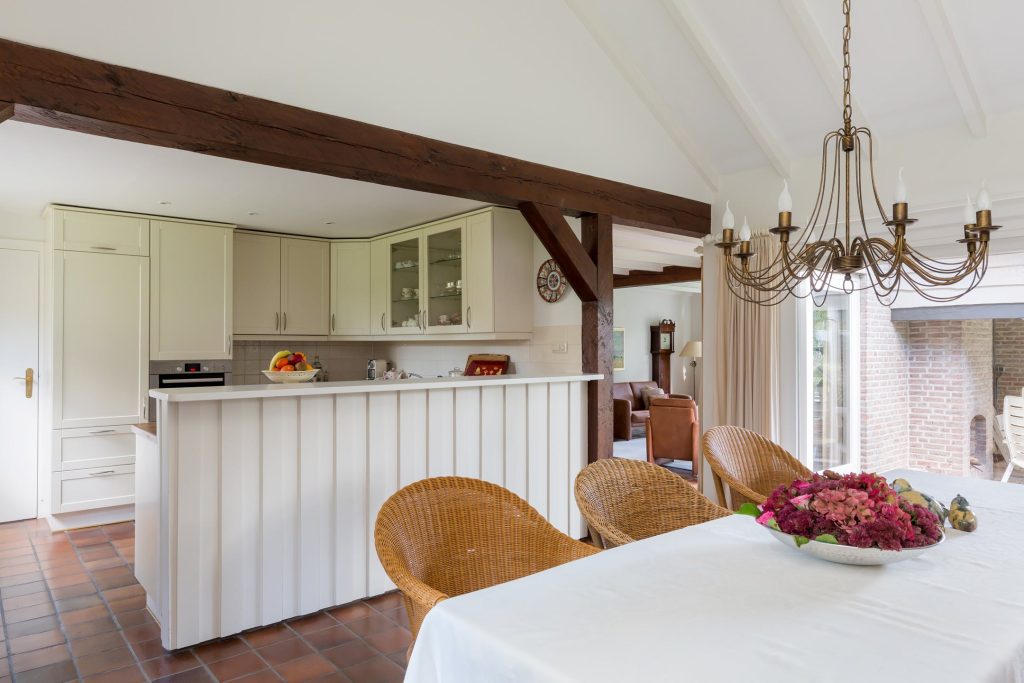 De grote woonkamer is sfeervol en licht met typische stijlkenmerken waaronder een balkenplafond, een plavuizen vloer en de schouw met open haard. Aan de voorzijde geniet u van het prachtige uitzicht en vanuit het eetgedeelte heeft u een mooie verbinding met de tuin. Aansluitend aan de woonkamer ligt een heerlijk overdekt terras op het zuid-westen.