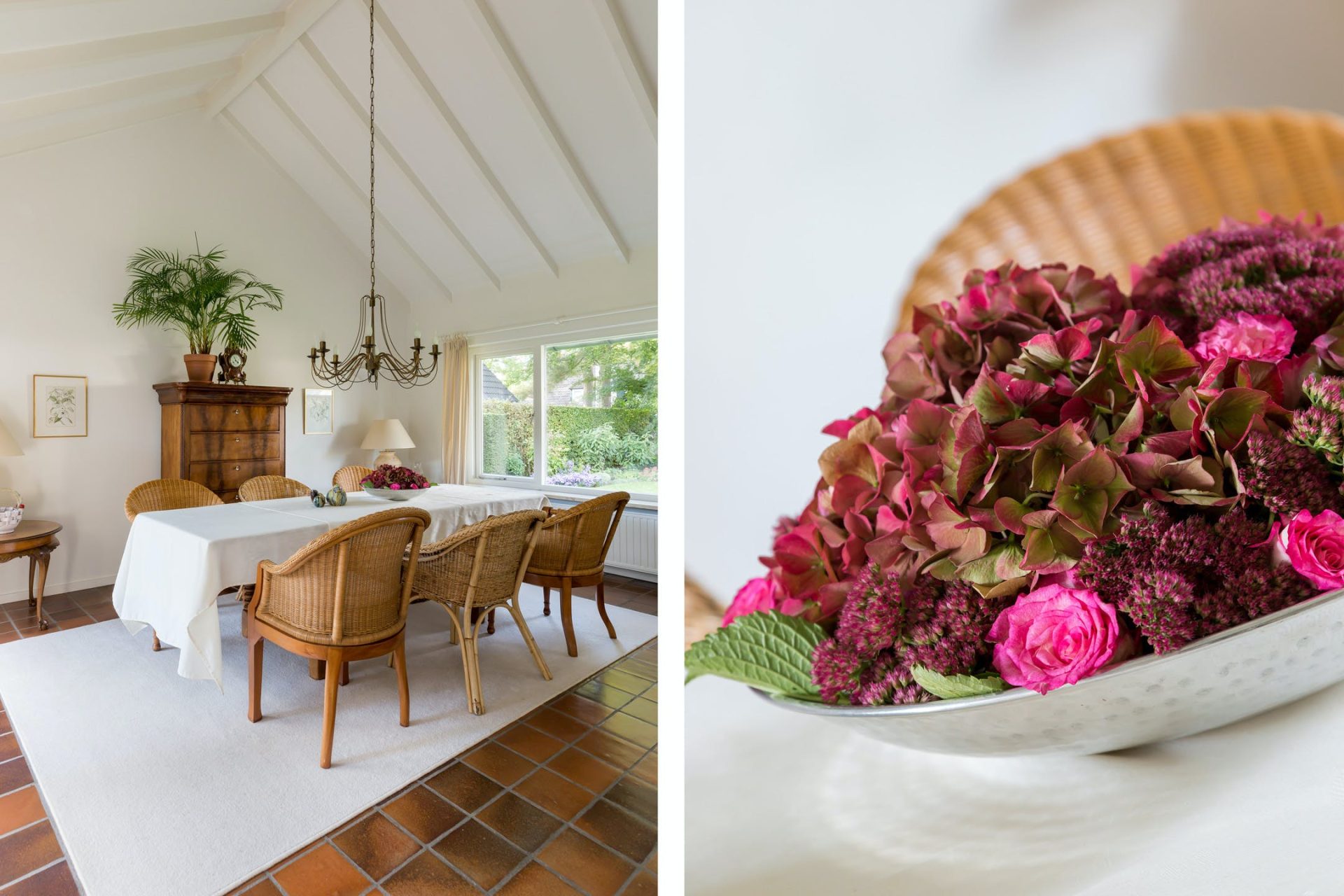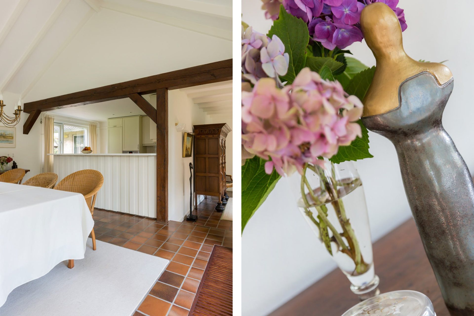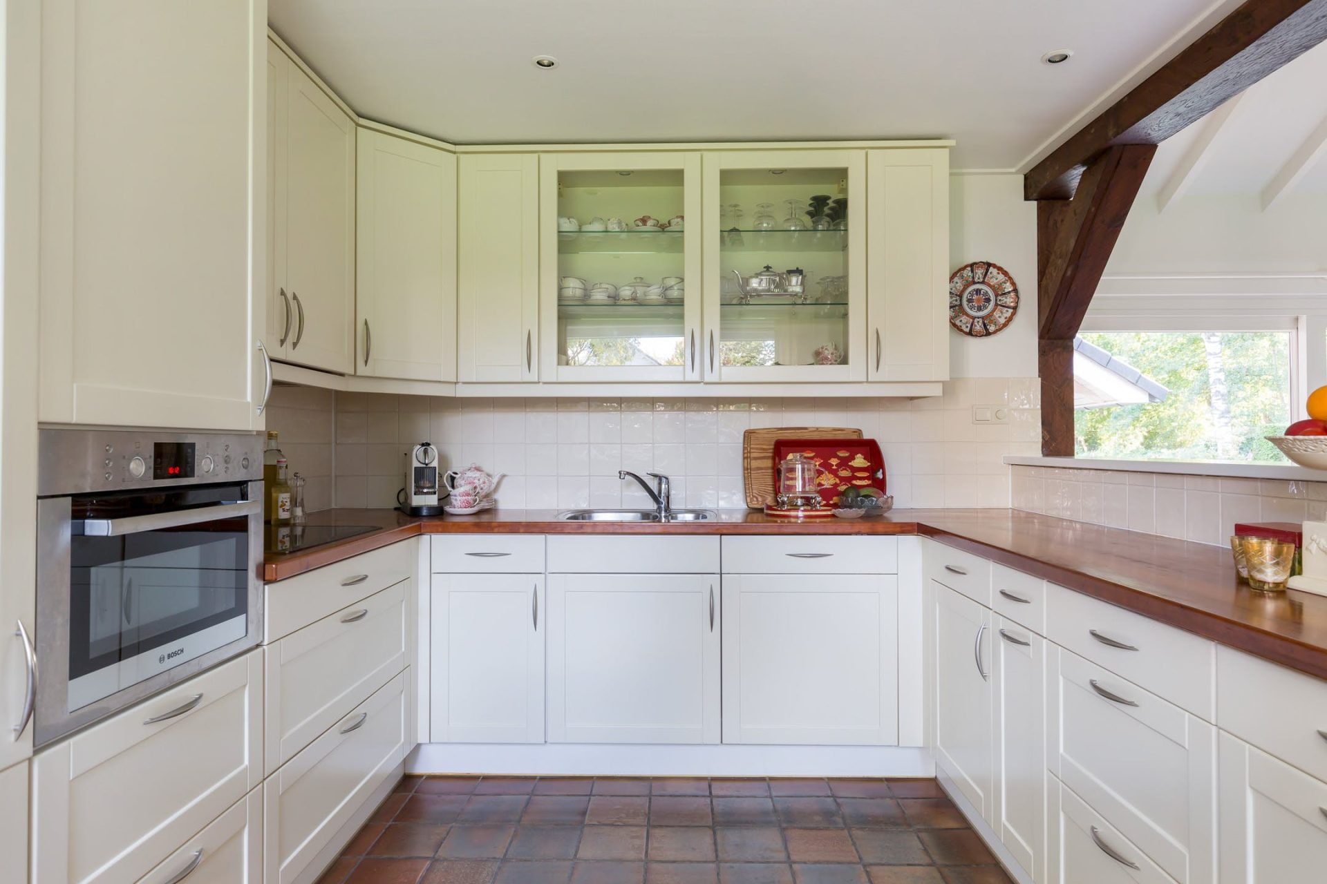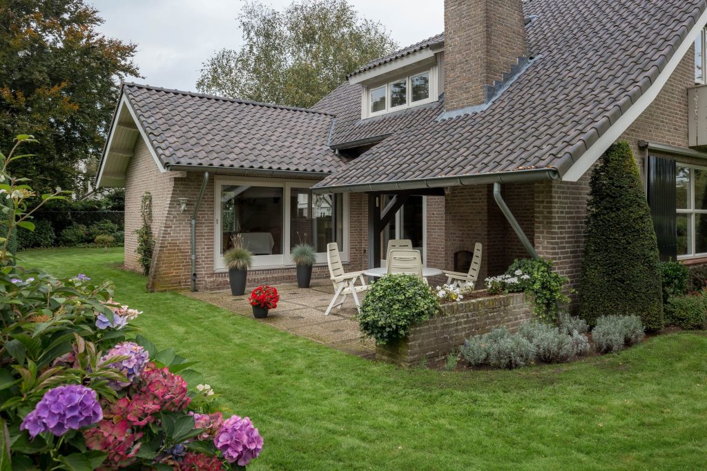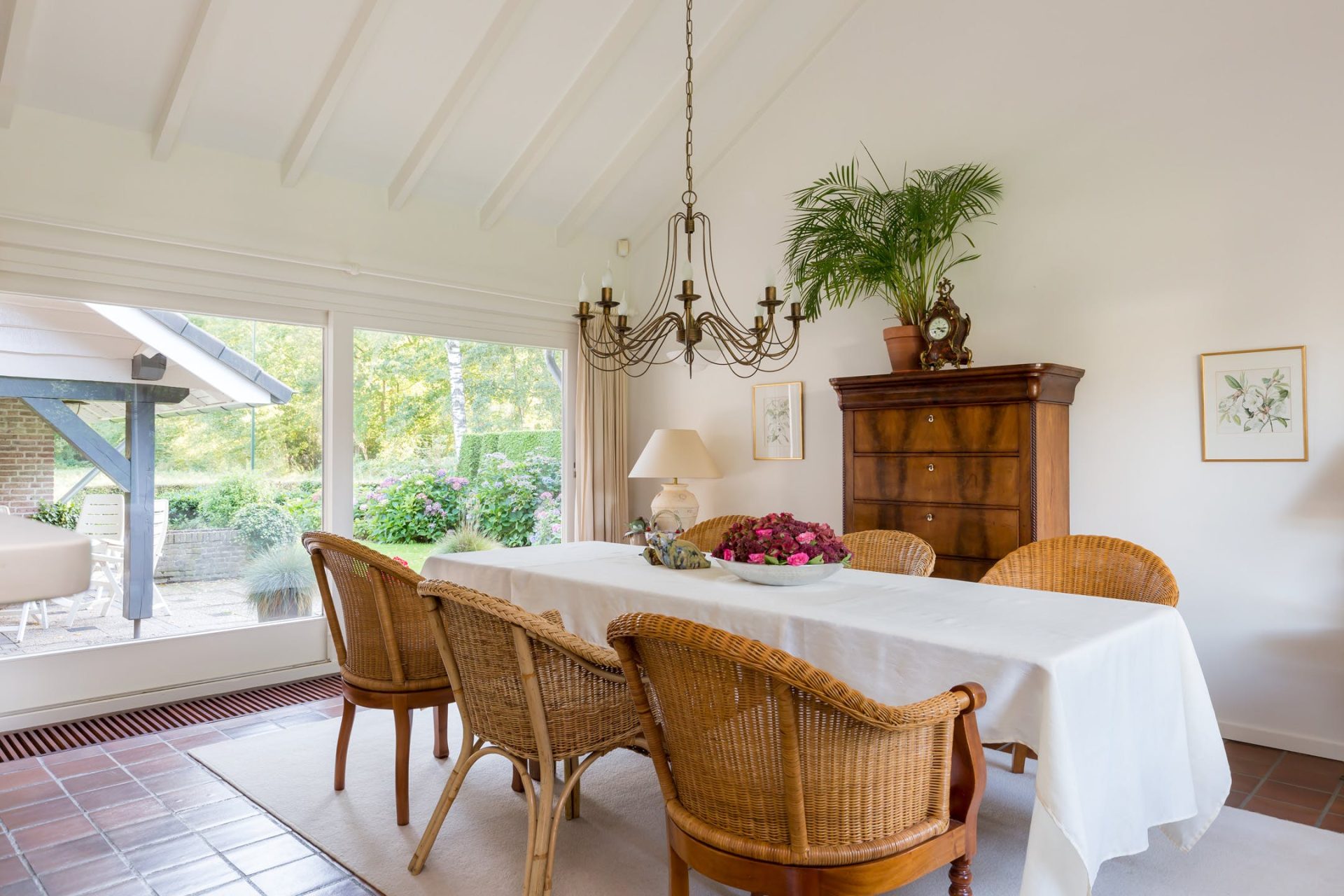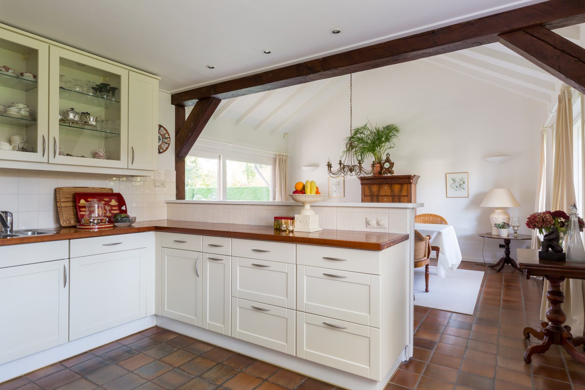 De grote woonkamer is sfeervol en licht met typische stijlkenmerken waaronder een balkenplafond, een plavuizen vloer en de schouw met open haard. Aan de voorzijde geniet u van het prachtige uitzicht en vanuit het eetgedeelte heeft u een mooie verbinding met de tuin. Aansluitend aan de woonkamer ligt een heerlijk overdekt terras op het zuid-westen.