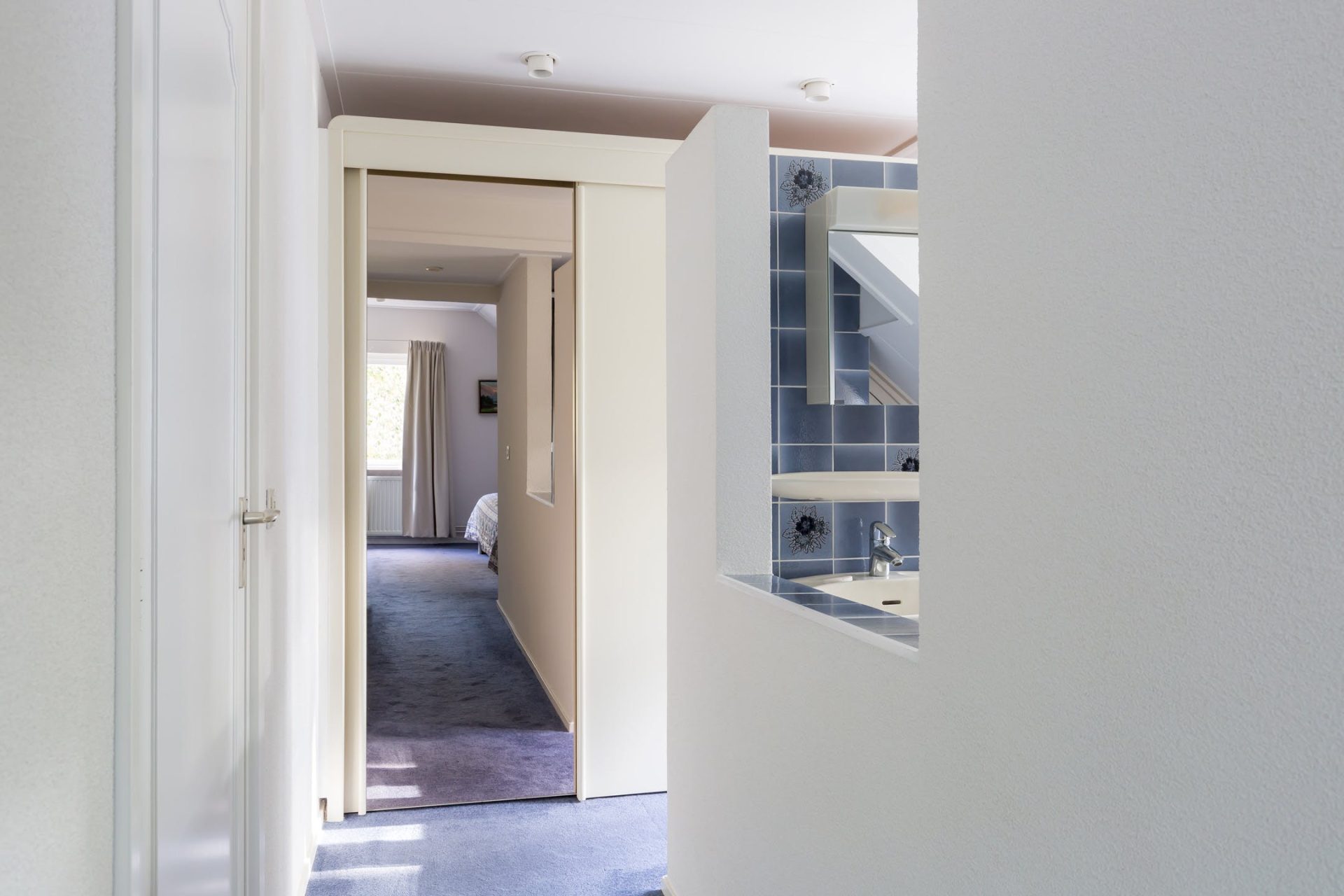 Vanaf de overloop zijn drie slaapkamers, twee badkamers, een studeerkamer en een aparte toiletruimte bereikbaar. Aan de voorzijde liggen twee slaapkamers, elk met een eigen deur naar het balkon. De derde slaapkamer ligt aan de achterkant en heeft een directe toegang tot één van de badkamers. Naast deze slaapkamer ligt een studeerkamer (nu met infraroodsauna). De eerste badkamer op de verdieping beschikt over een douche en twee wastafels. De tweede badkamer heeft een ligbad en een wastafel.