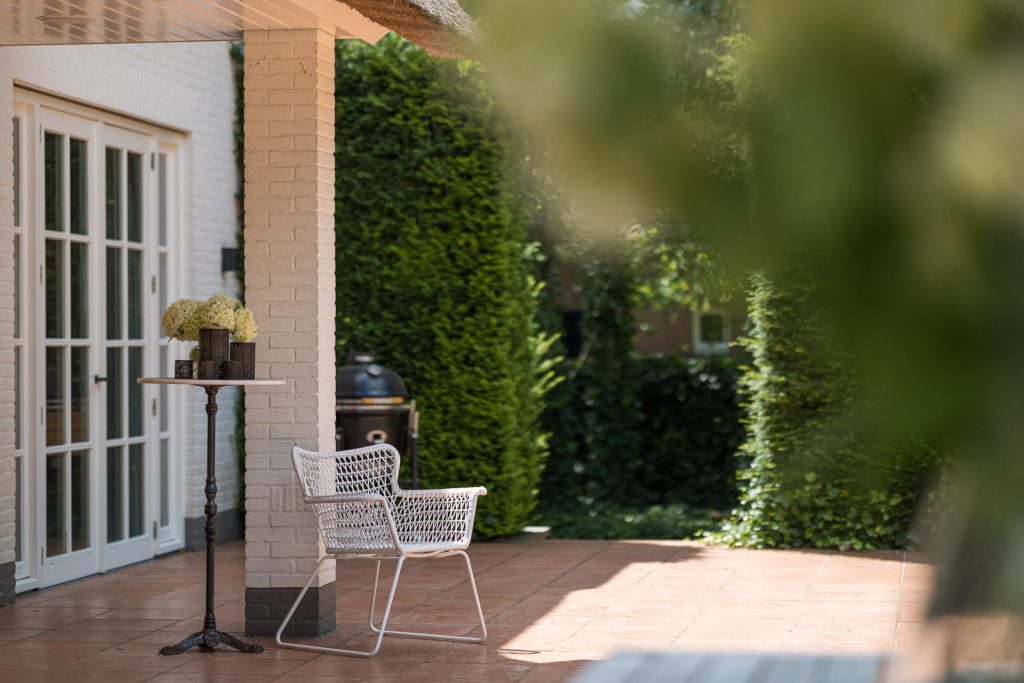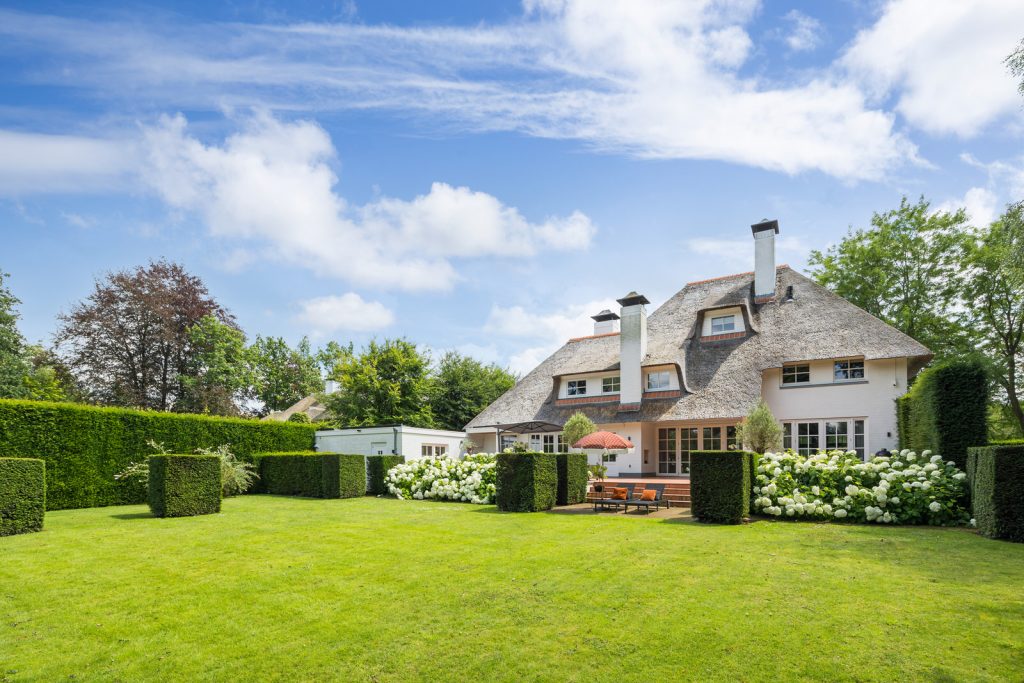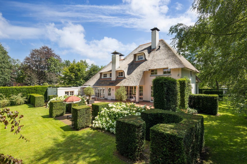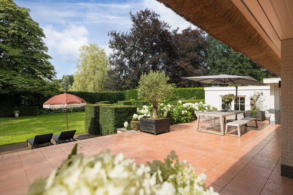 De garage biedt plaats aan twee auto’s en de omliggende tuin van 1.885 m² is een oase van rust en privacy, met gesnoeide taxuszuilen, rode beuken en diverse terrassen.