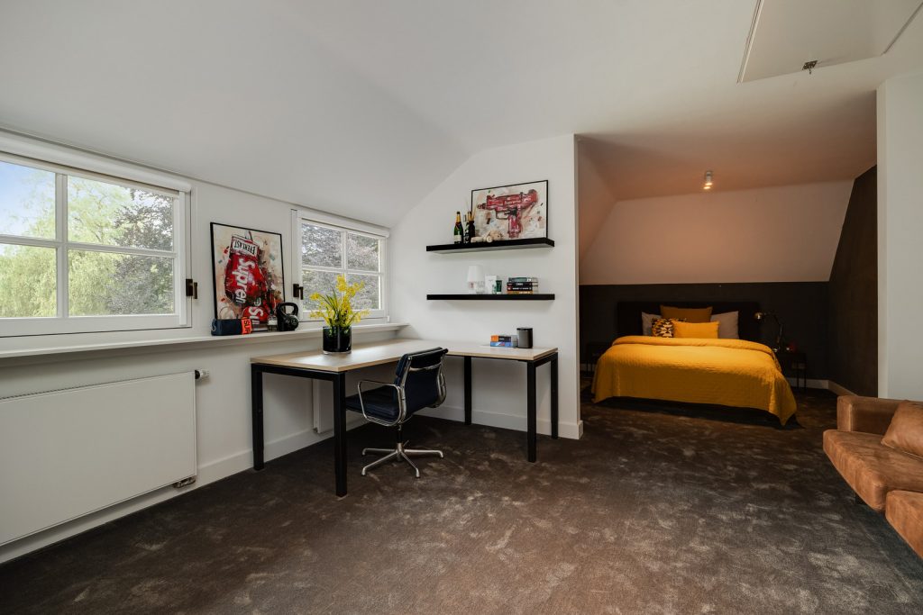 De living is warm en uitnodigend, met een eikenhouten vloer in visgraatmotief en een robuuste kalkzandstenen schouw. De indeling van de woning is praktisch en doordacht, met een werkkamer in de rechtervleugel, afgescheiden van de woonkamer voor optimale rust en privacy.