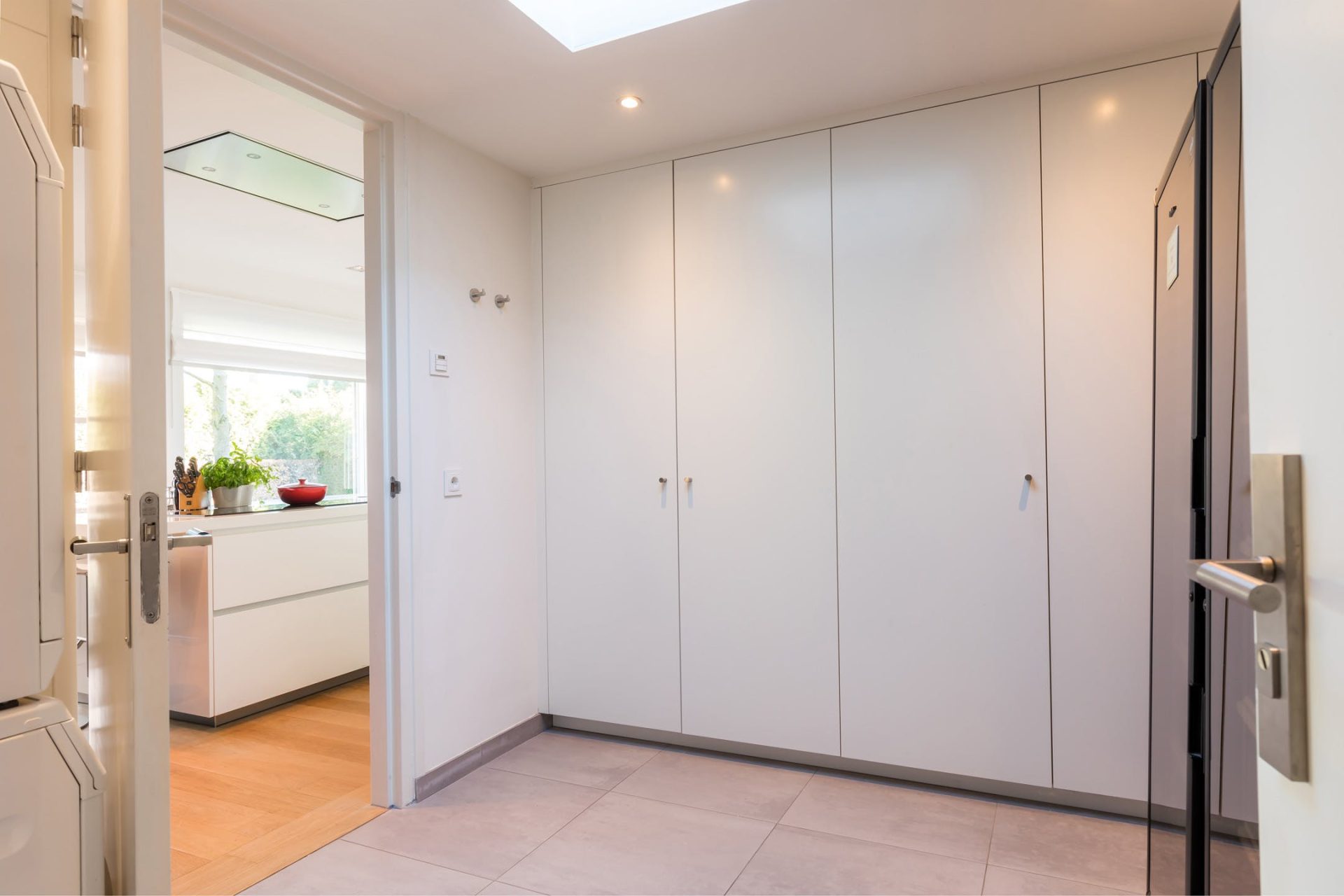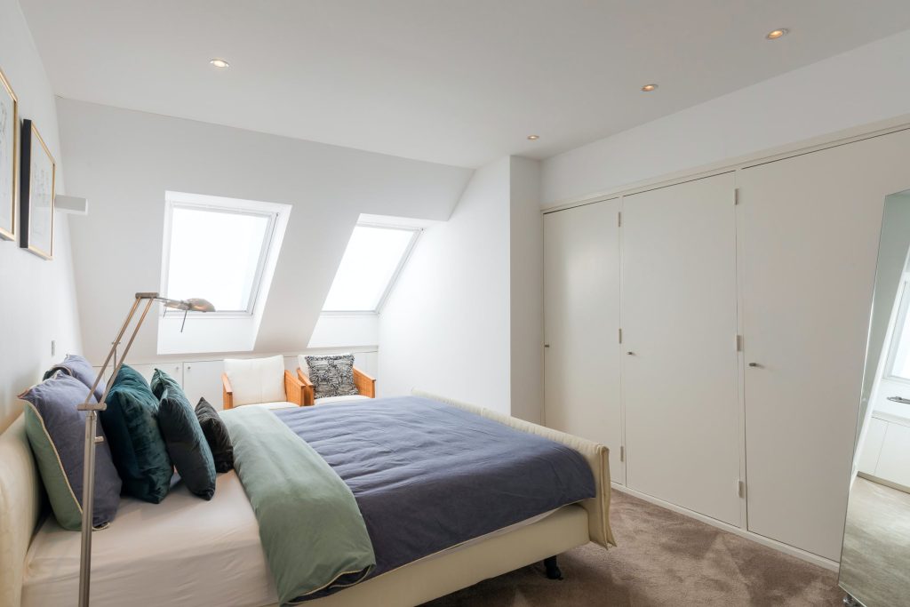 • de hoofdslaapkamer is ingericht met op maat gemaakte kledingkasten.