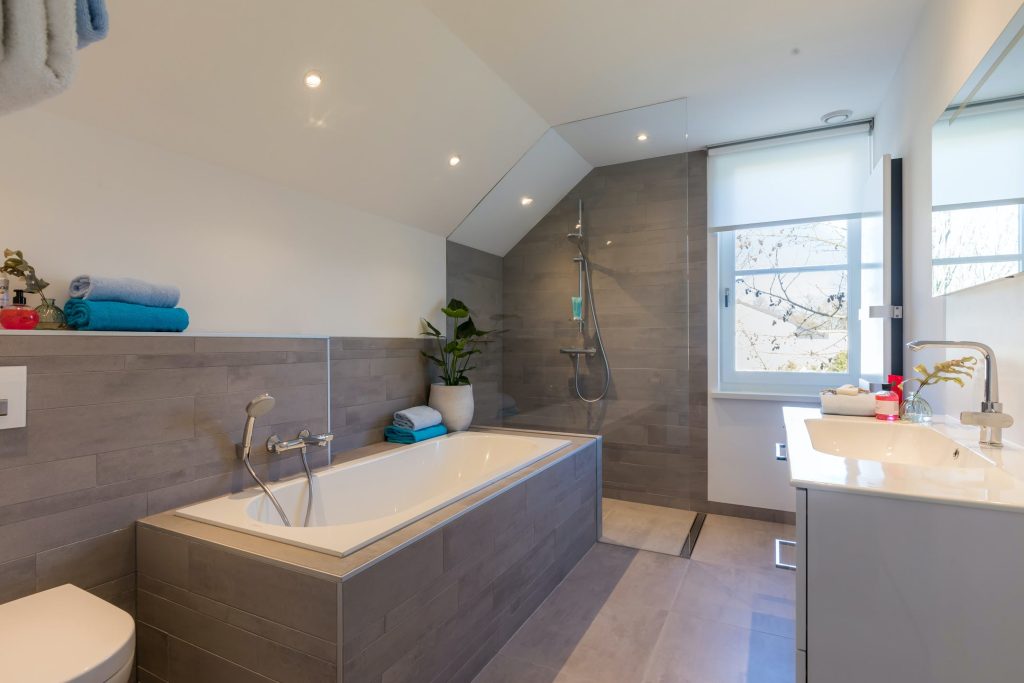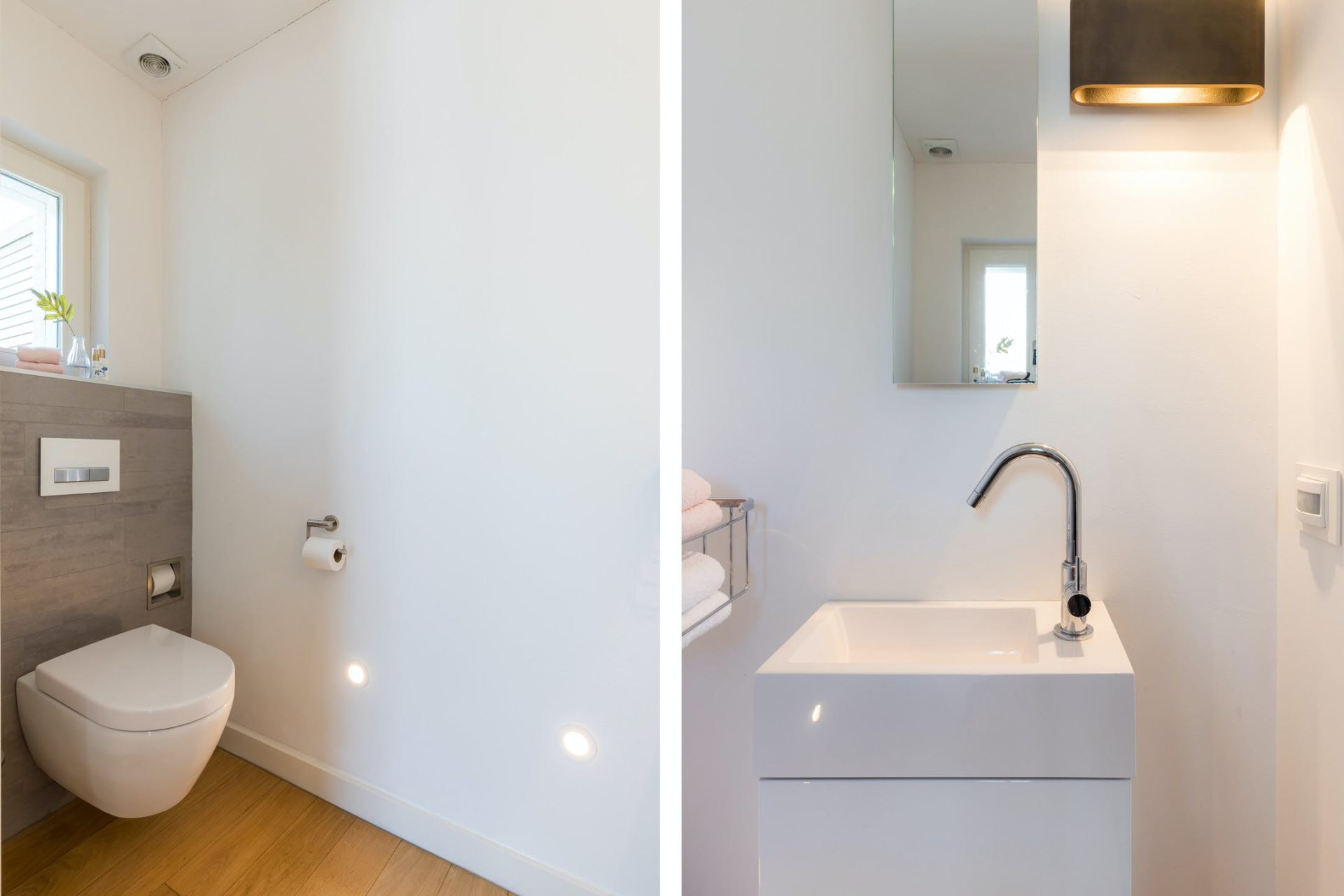 • de kinder-/ gastenbadkamer biedt een ligbad, inloopdouche toilet en wastafelmeubel;